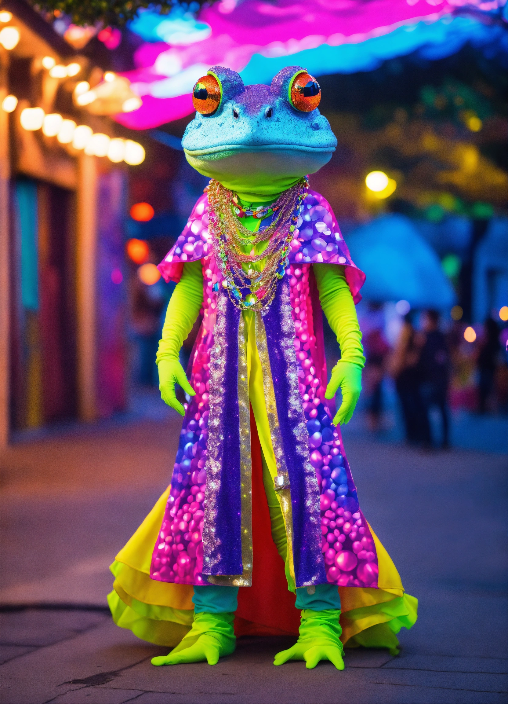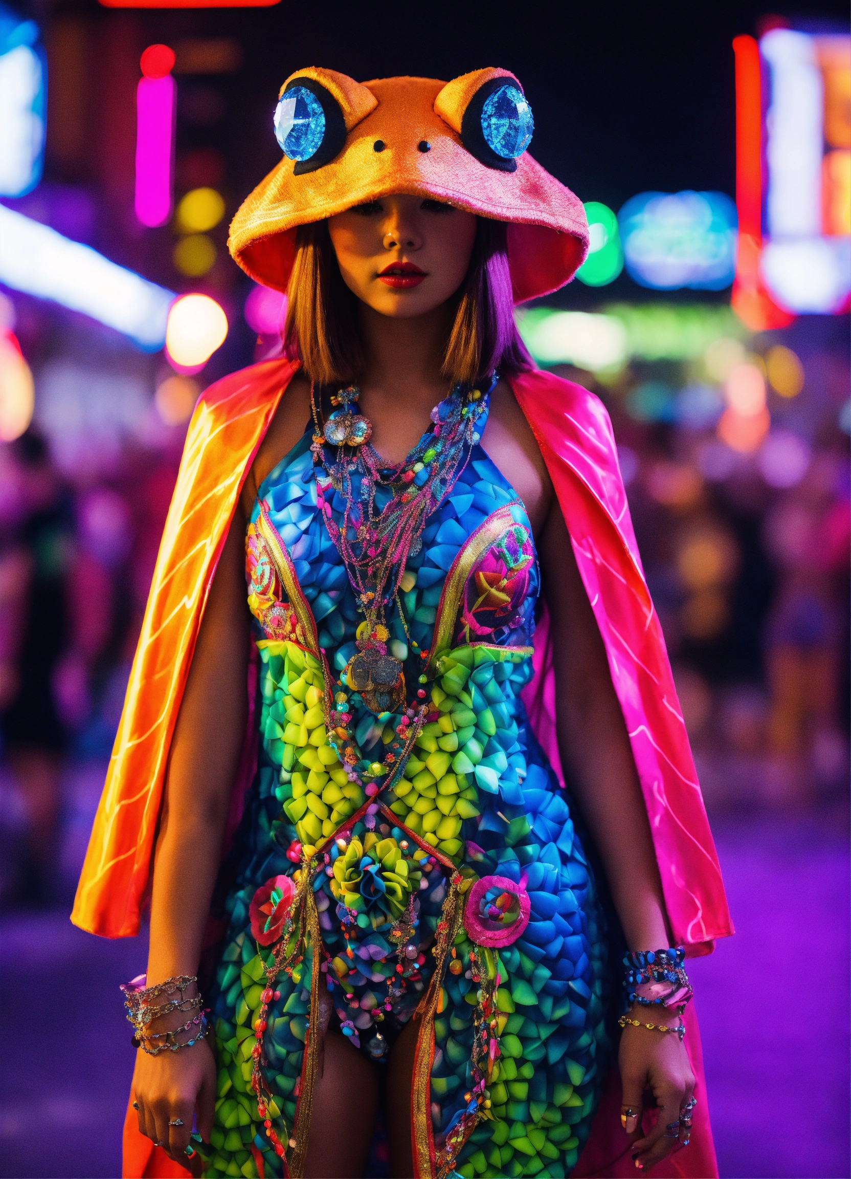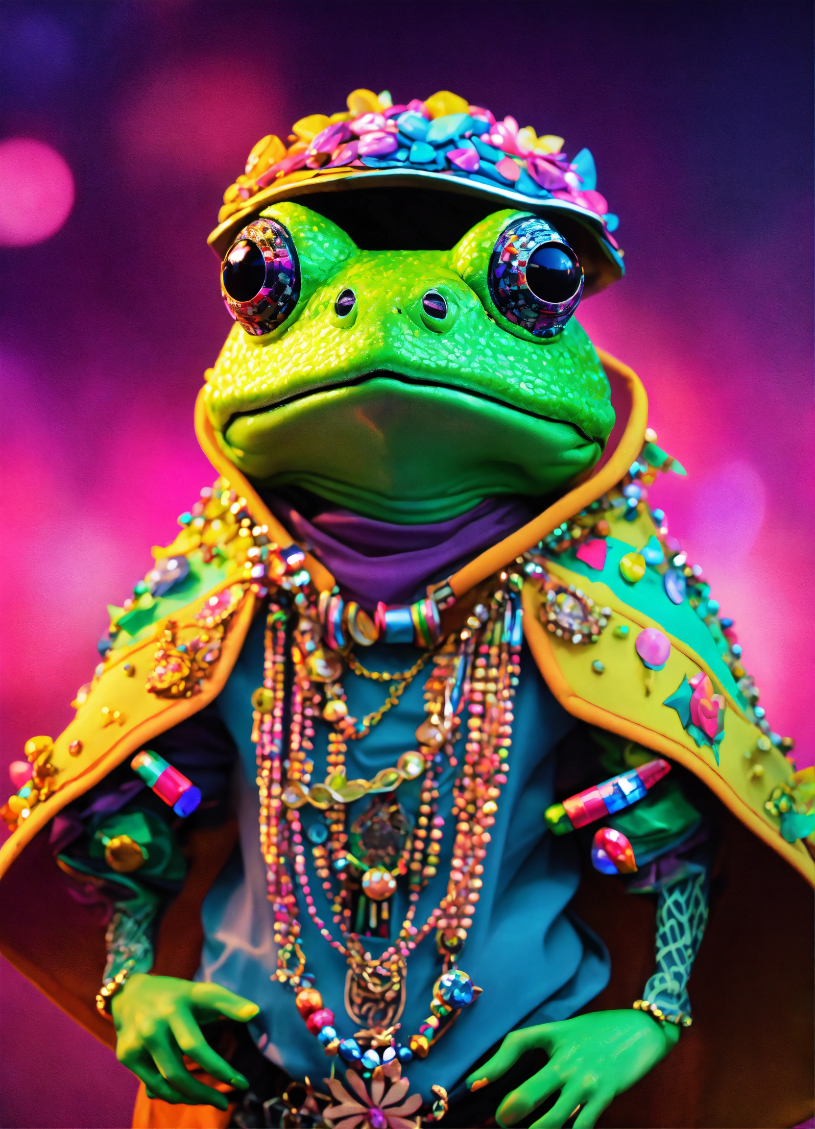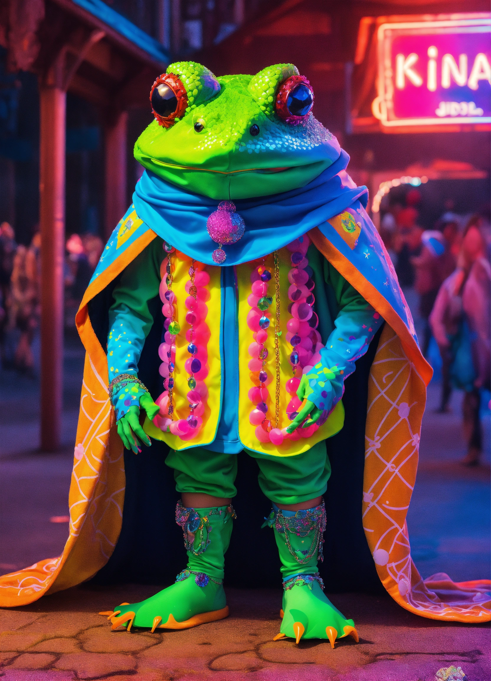 Photorealistic fashion full body portrait a toad made out of 3d optical illusion neon festival cape street wear, kawaii colorado festival raver dress with crystal kawaii chains, ninja in folk costume in a fashion magazine