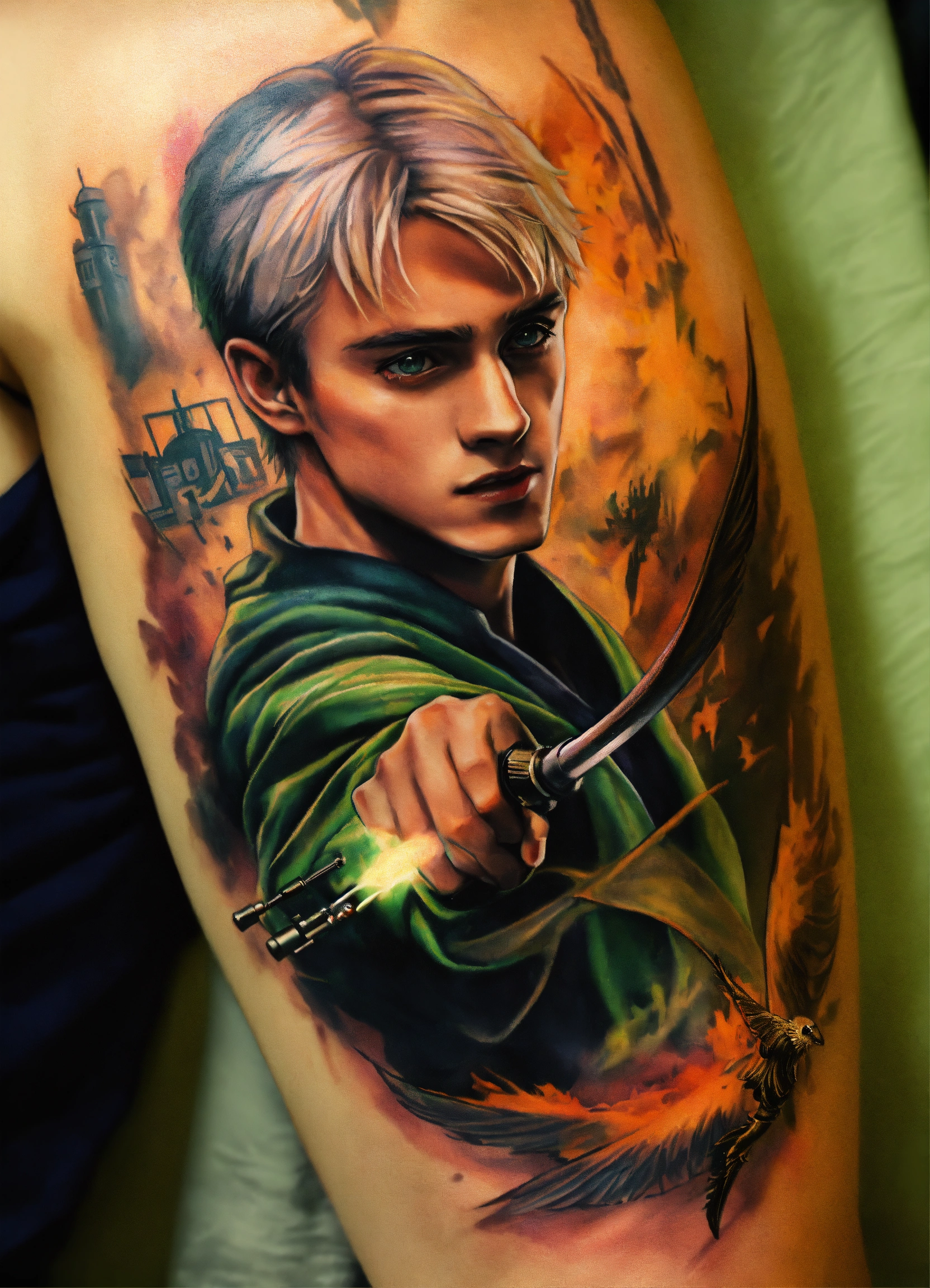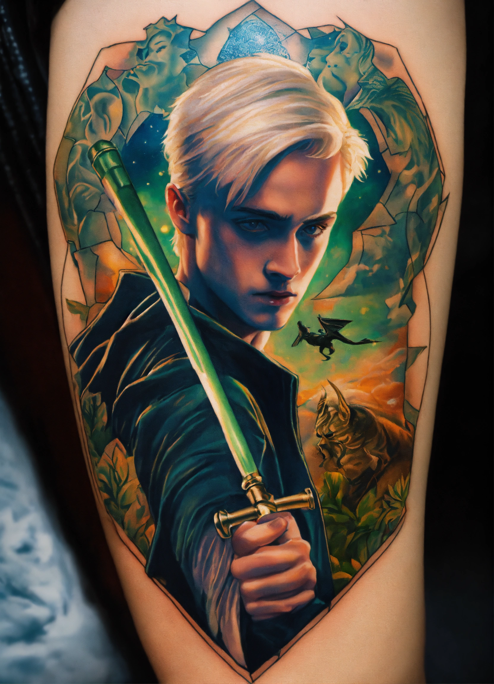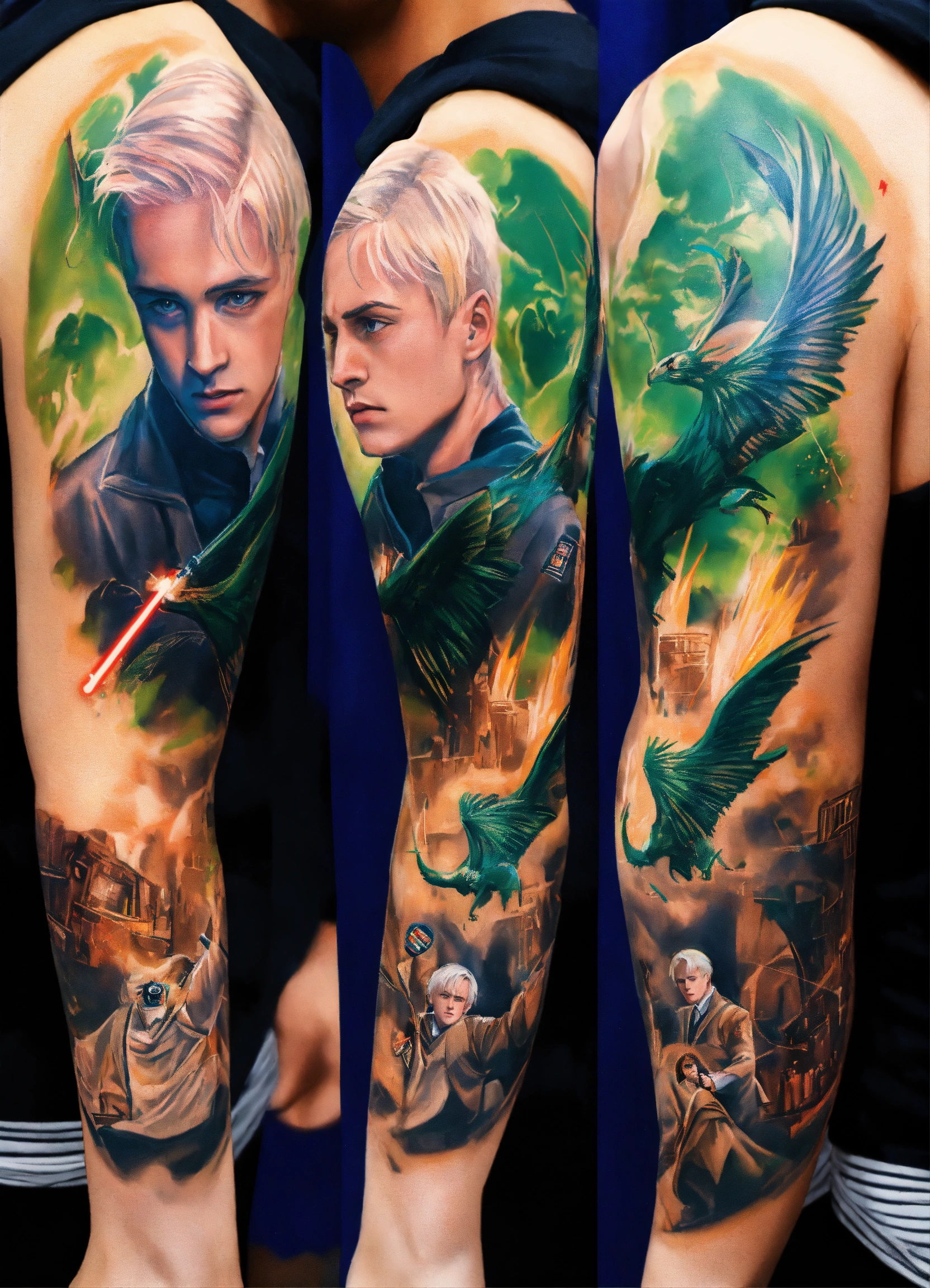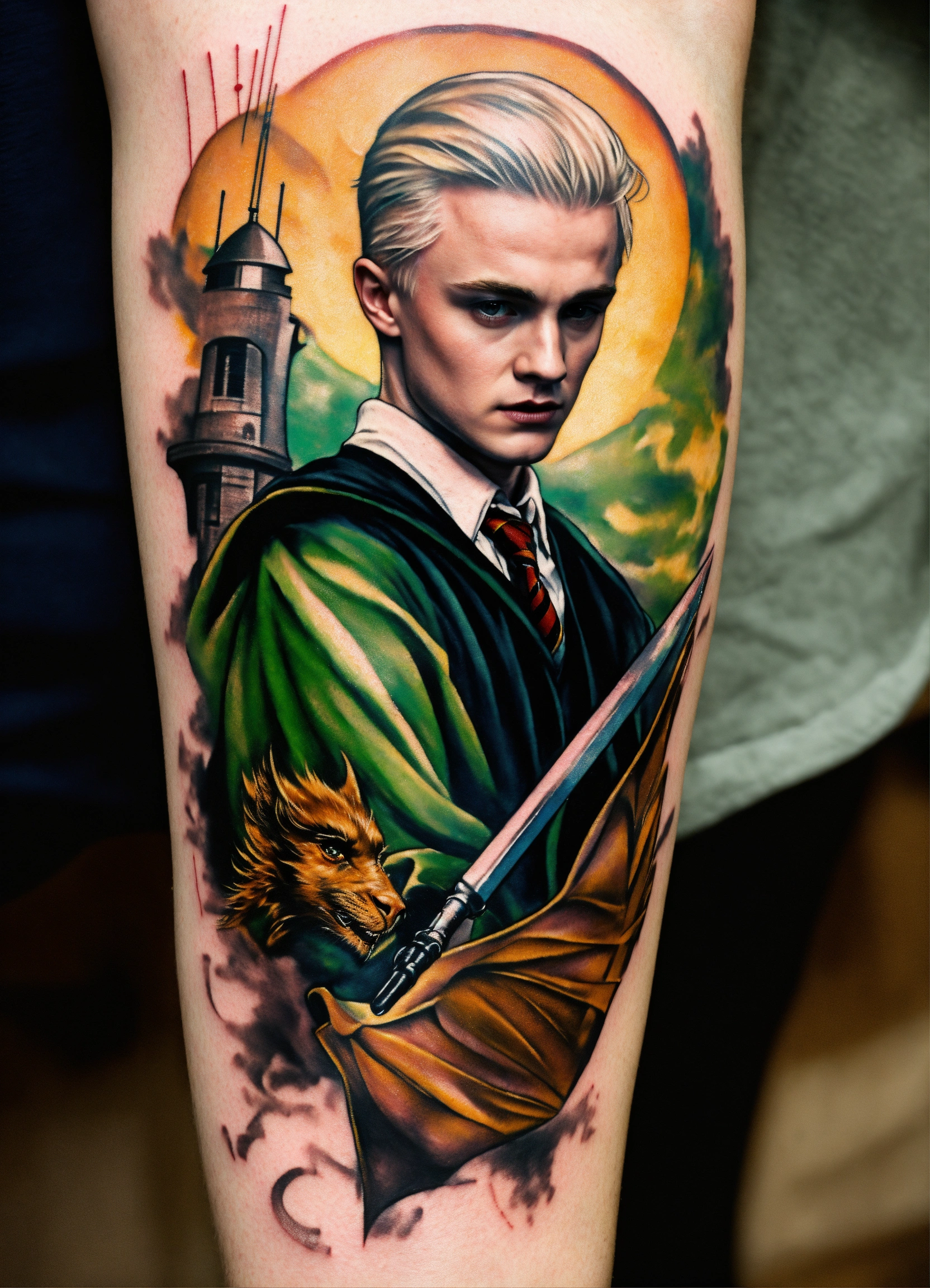 arm tattoo featuring draco malfoy fighting with