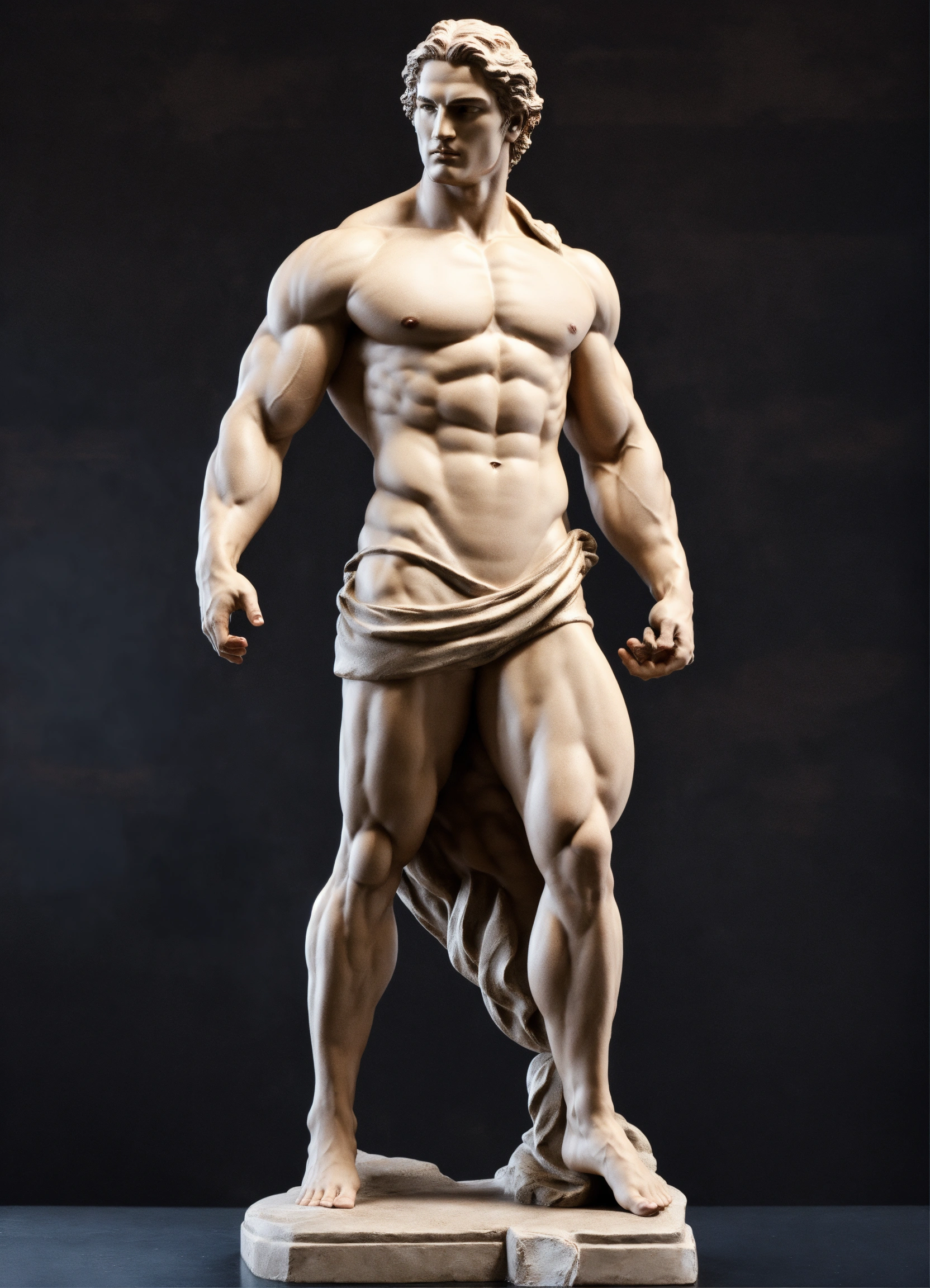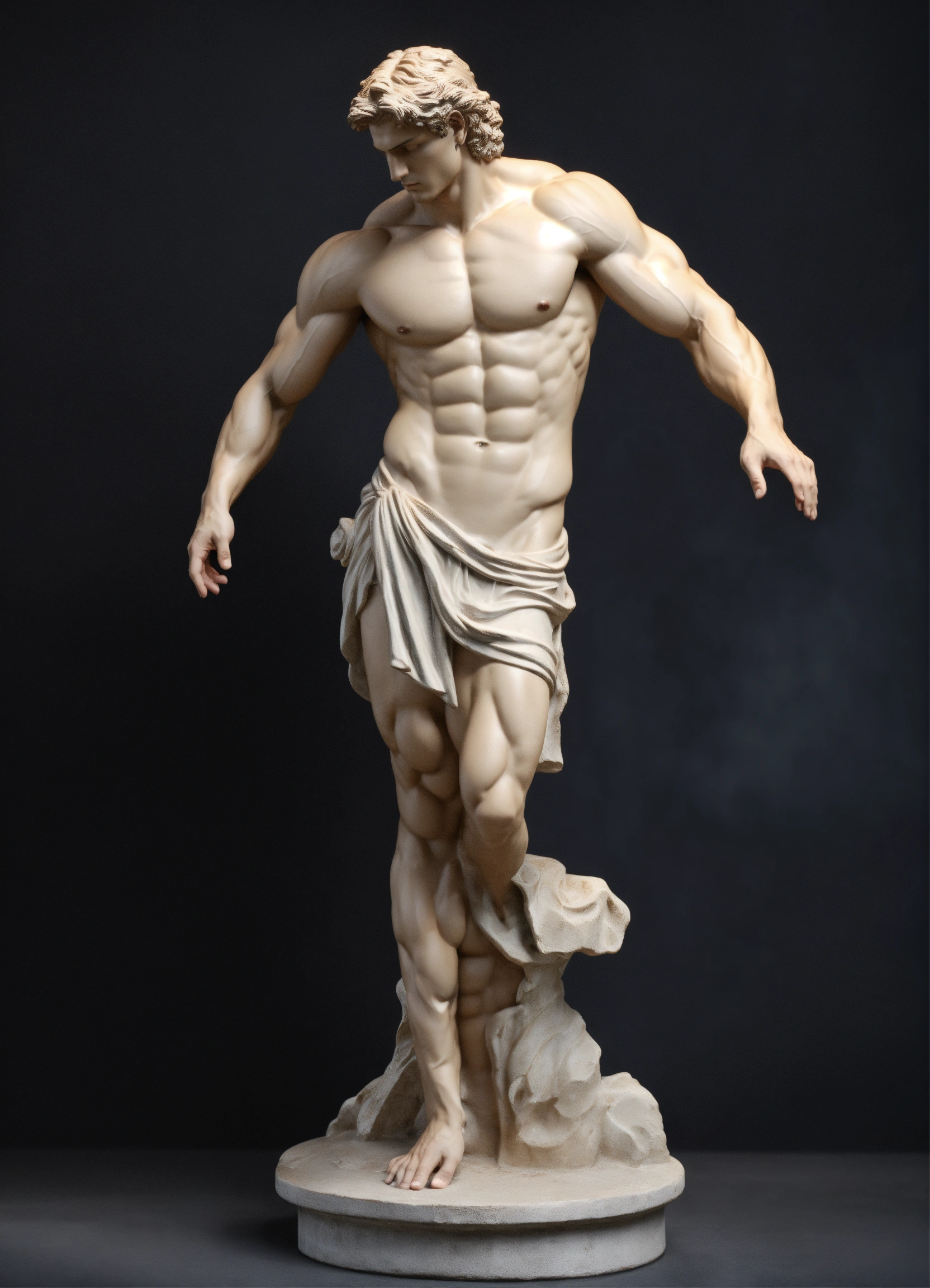 Modern muscular greek god statue with middelparting hair with white boddy with dark backround back position