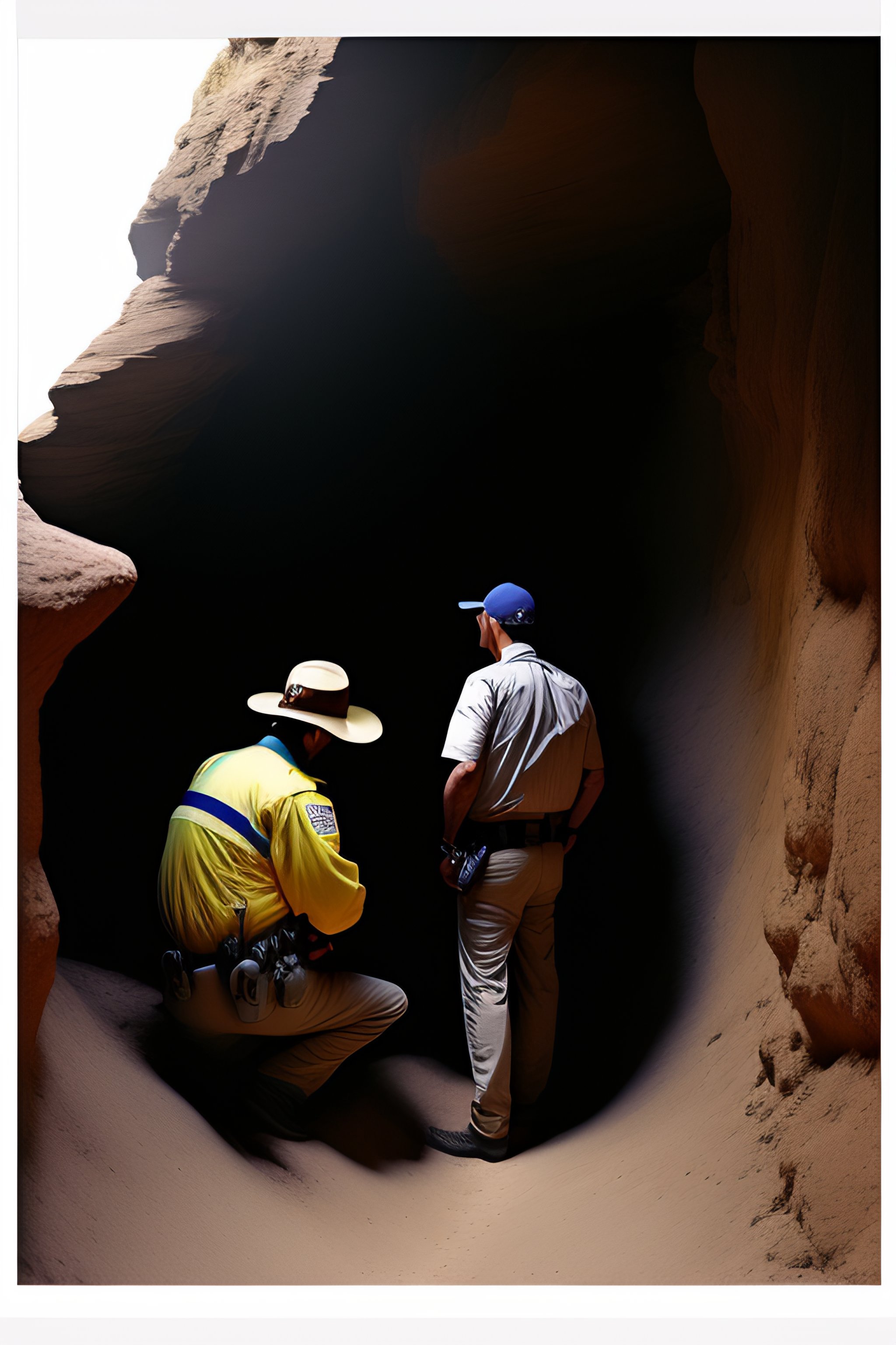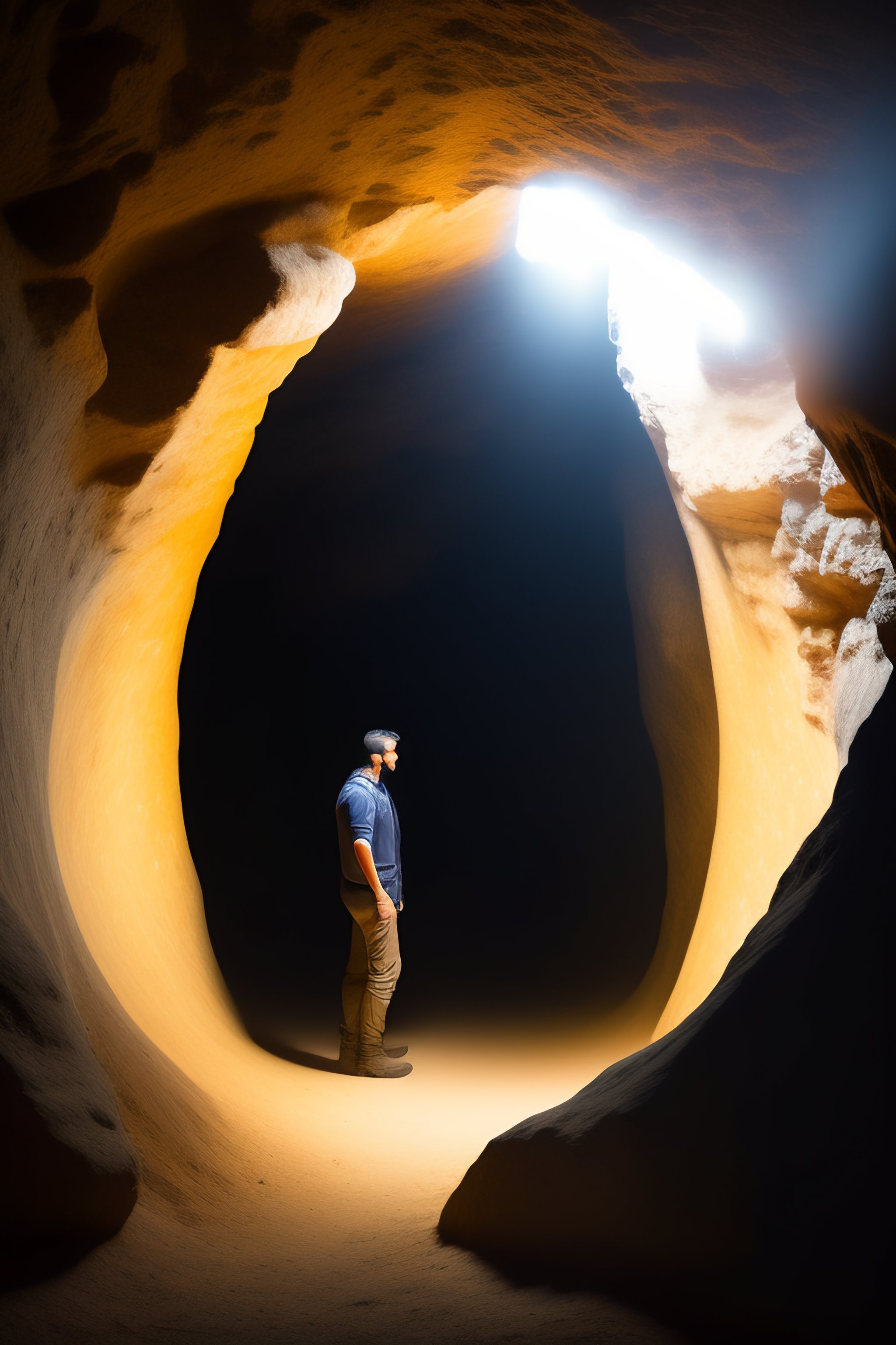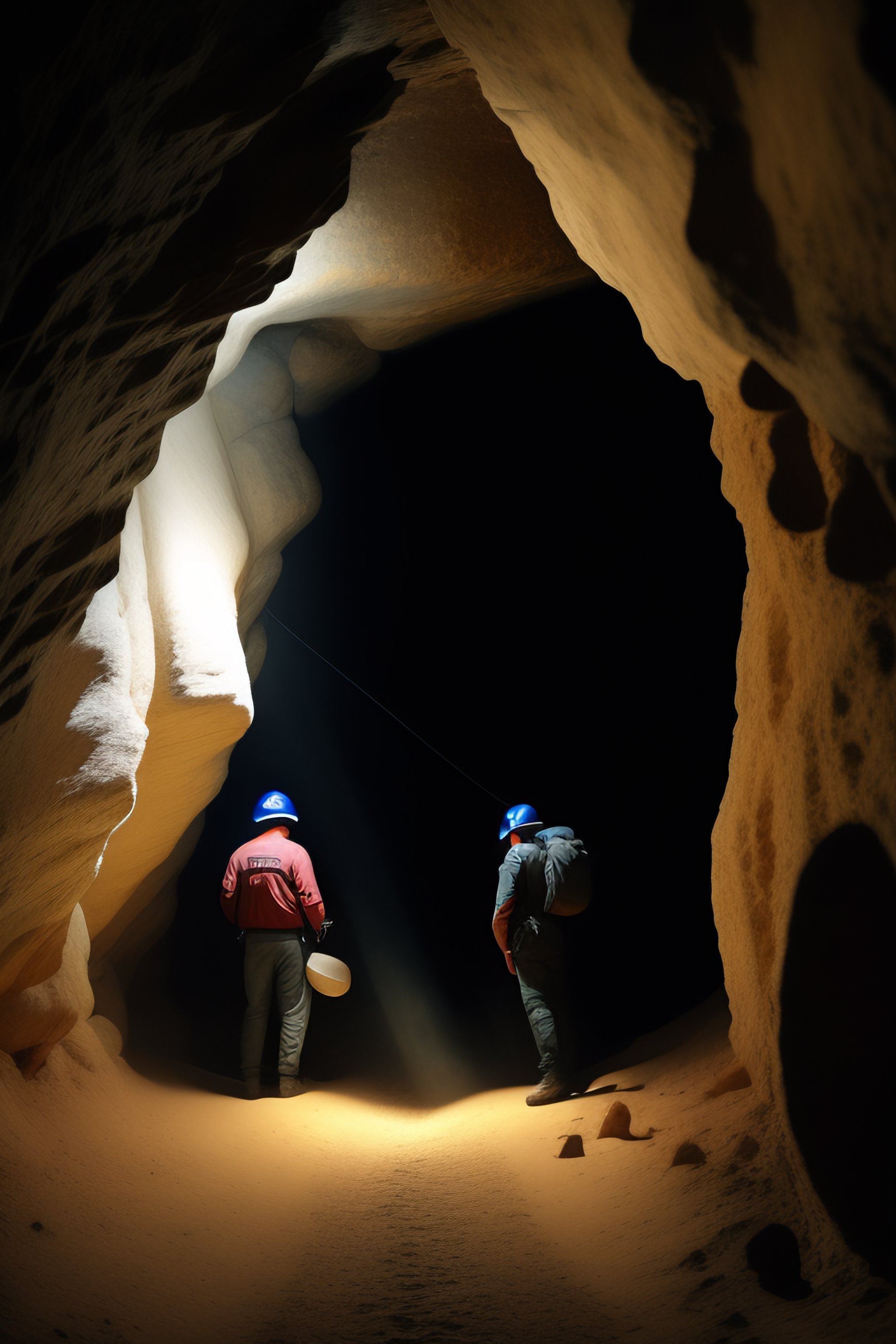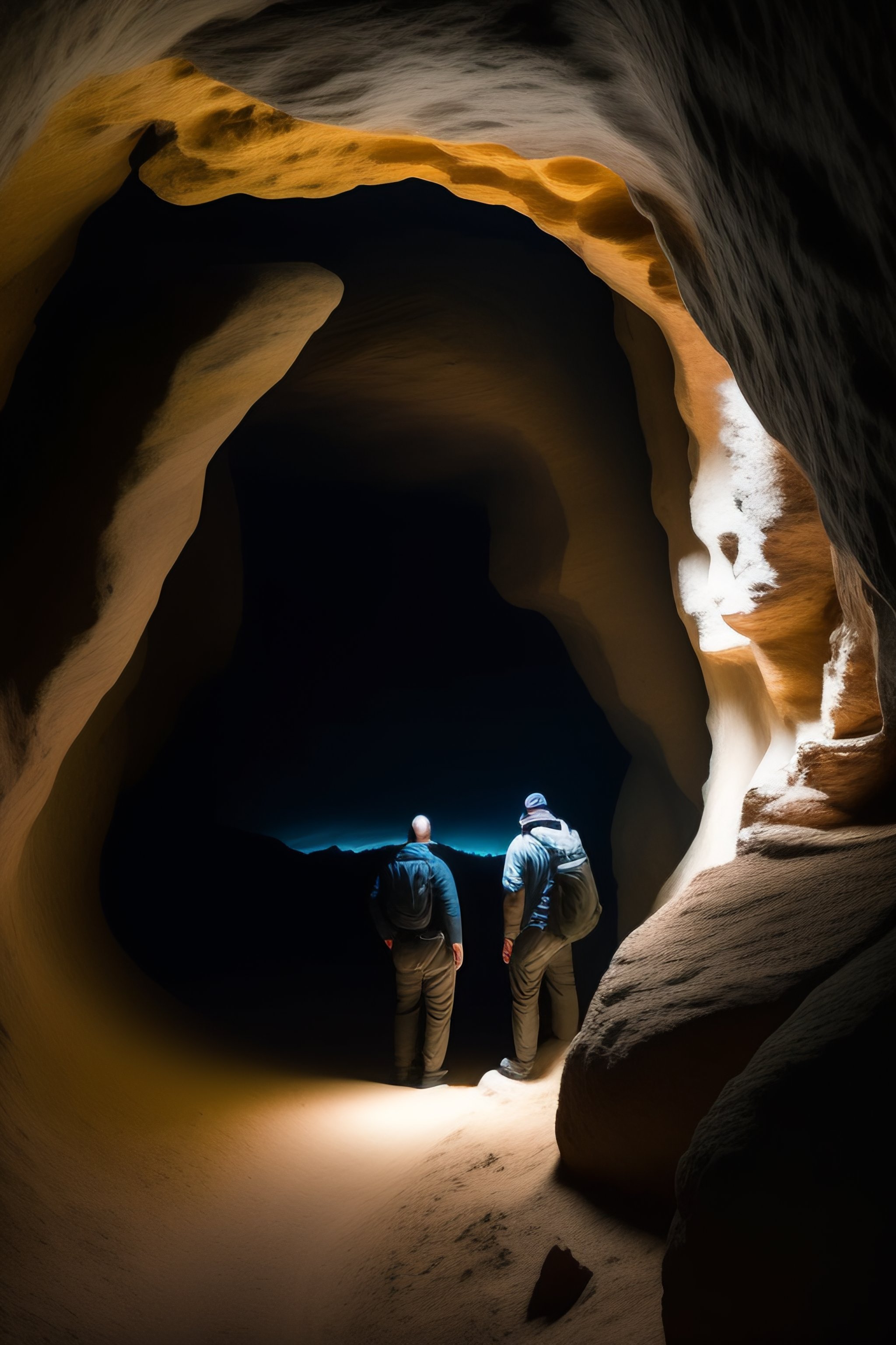 Tres personas dentro de una cueva, una mujer tirada en el suelo asustada por lo que hay delante de ella, un hombre parado también asustado, y un hombre en el fondo viendo a esas dos personas, blanco y negro
