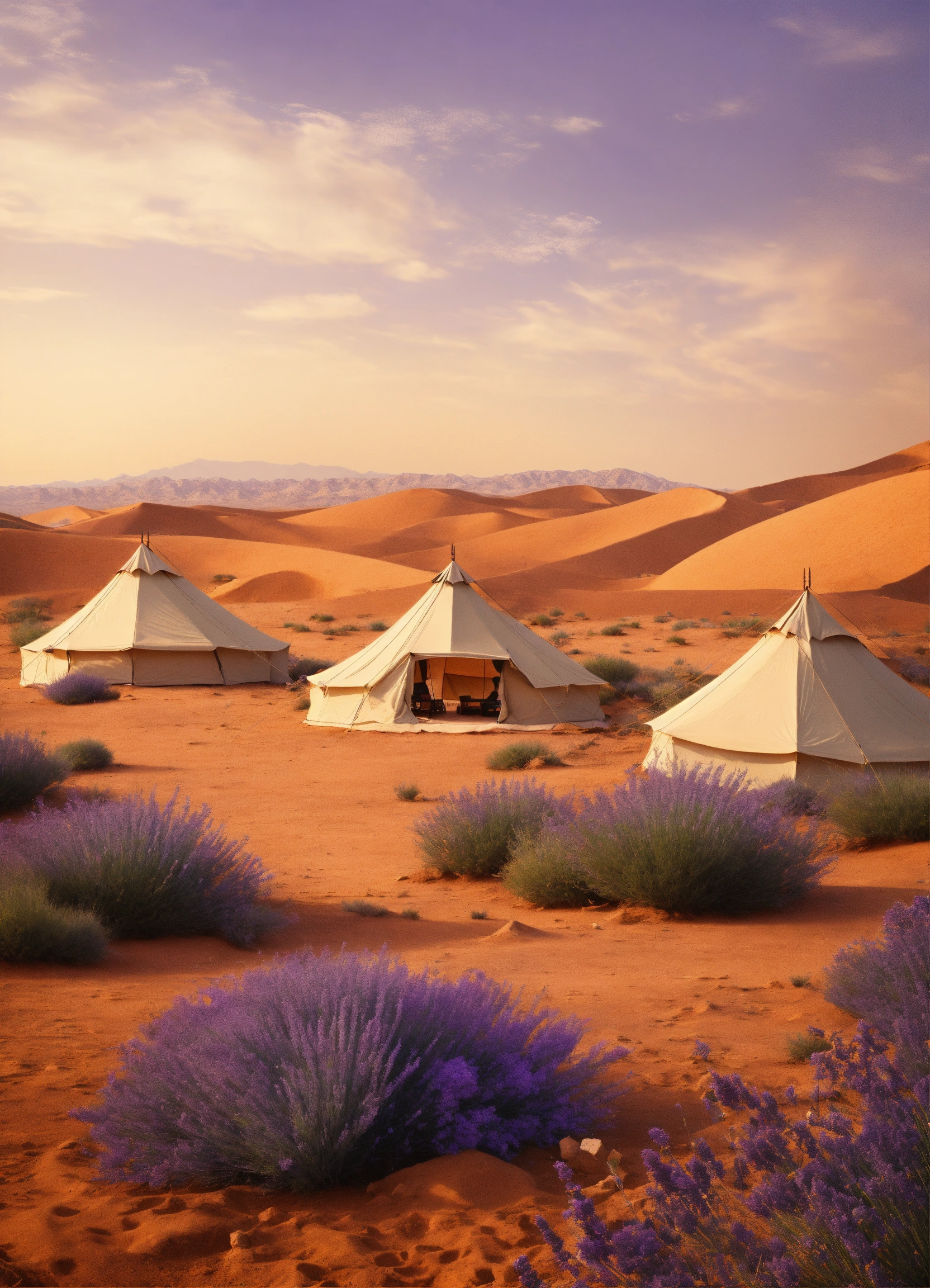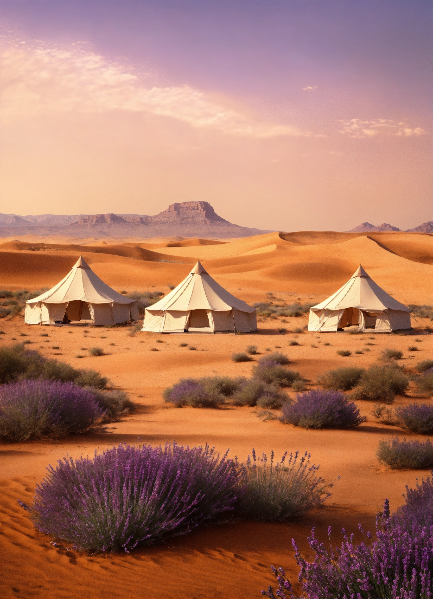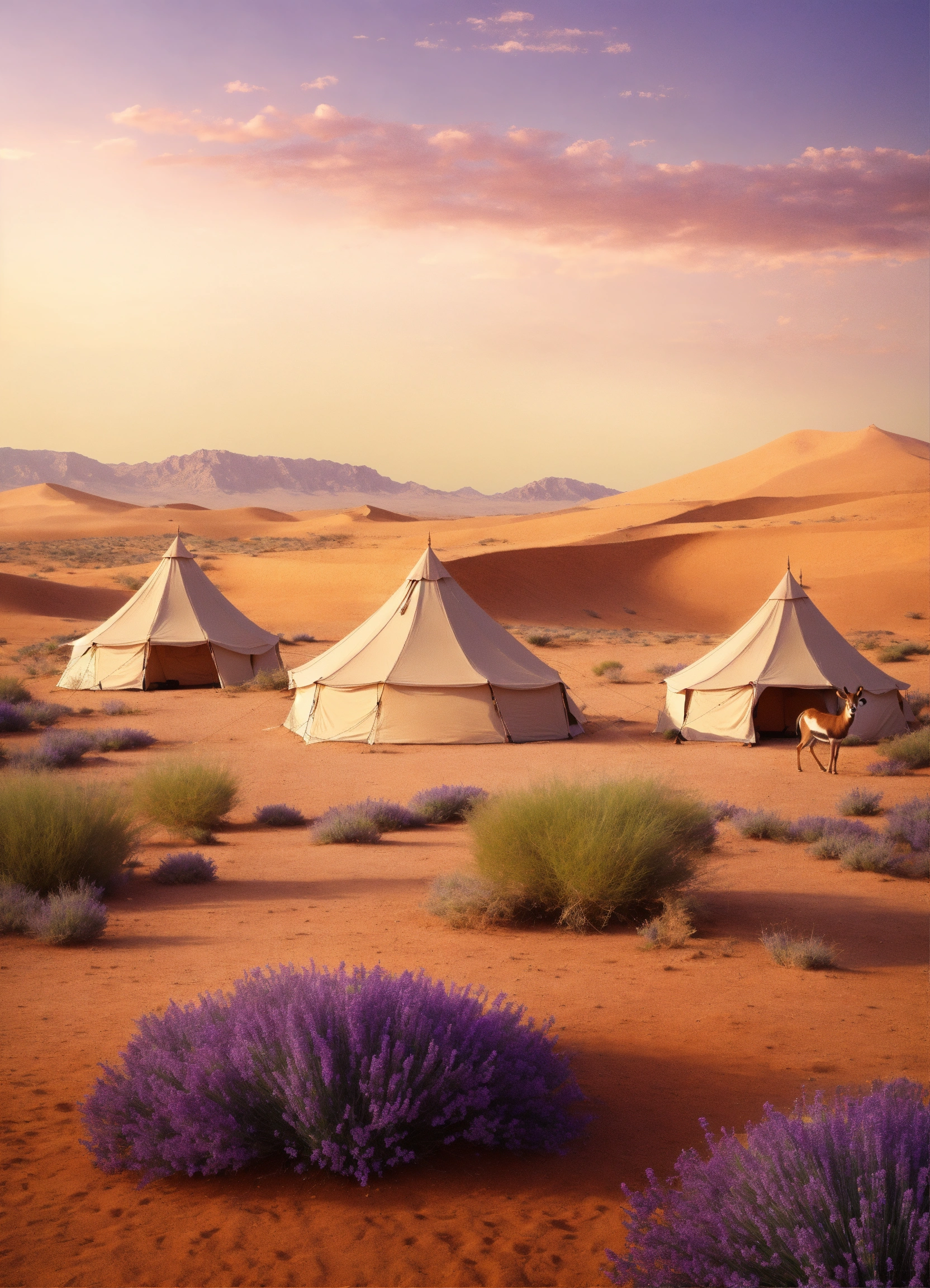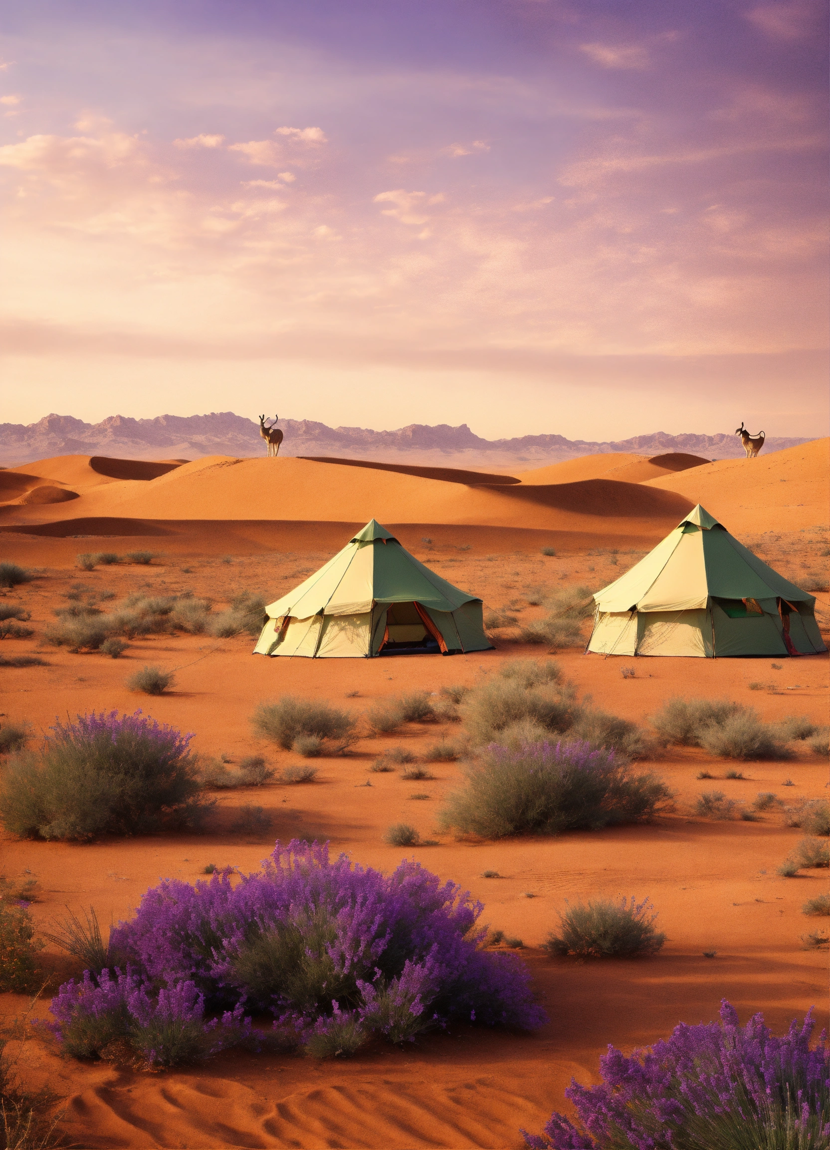 A desert background with some grasses in the spring season, with some lavender flowers in with female arabian antelope and two arab two tents from verse appear in the distance