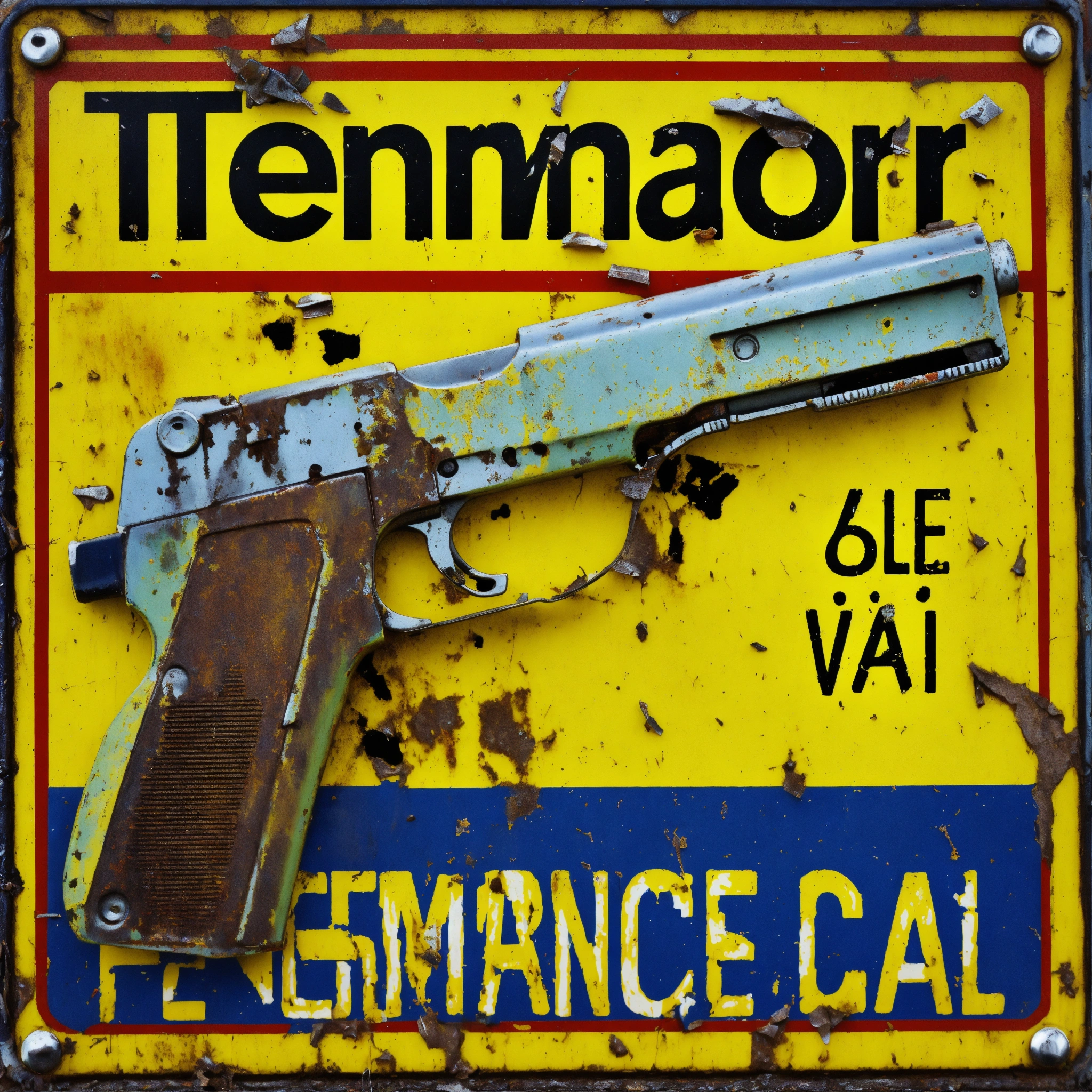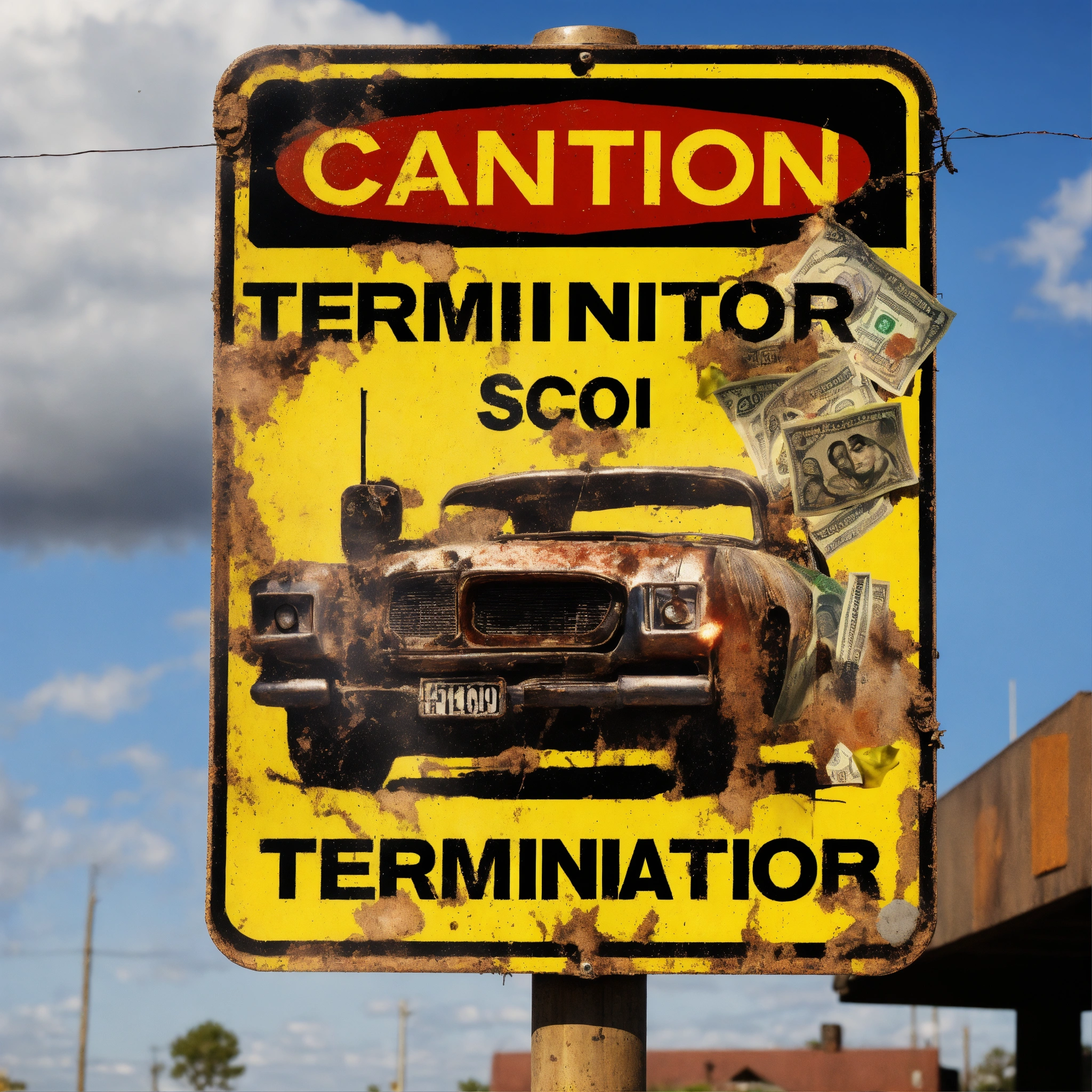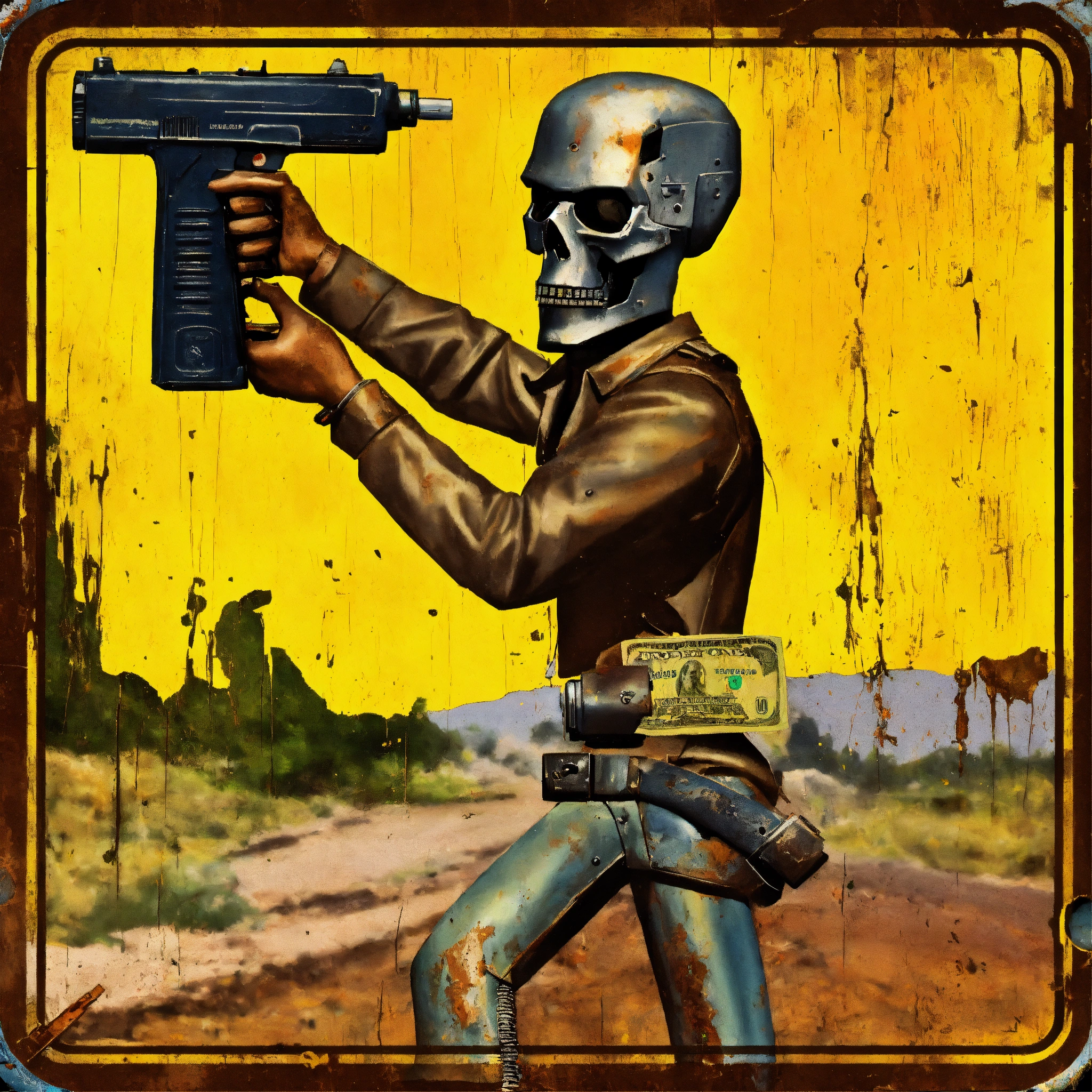 Corroded metal hold, whit impact gun road sign showing a rotten dollar bill with “terminator” original face "caution prepare for change" relevant iconography 1950s retro graphics