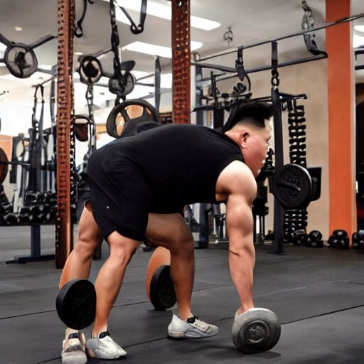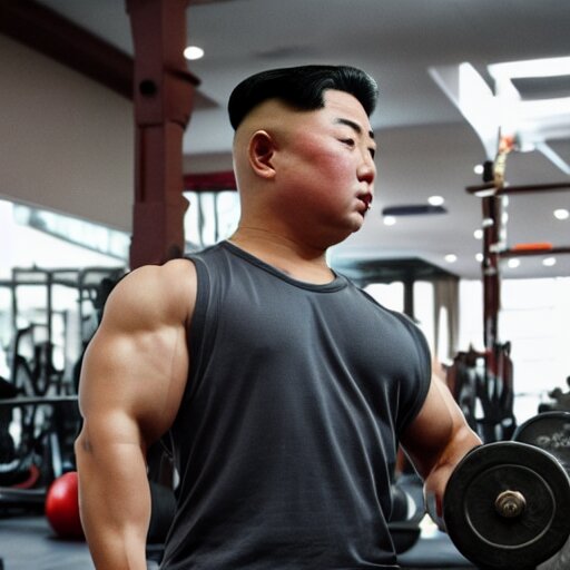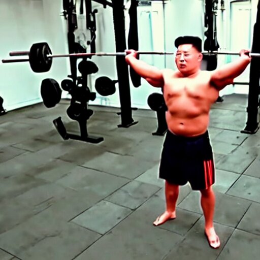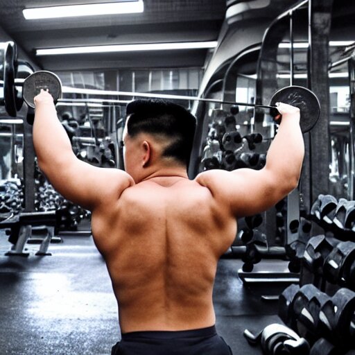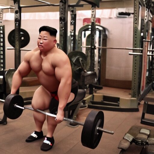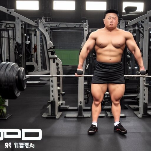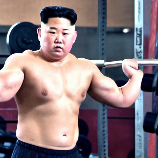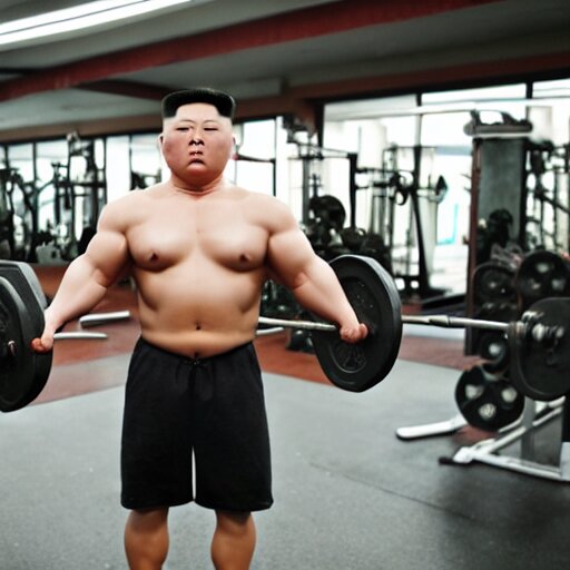 Cinematic shot of muscular shirtless kim jong - un lifting weights in a gym, very detailed, very intricate, dslr, 8 k