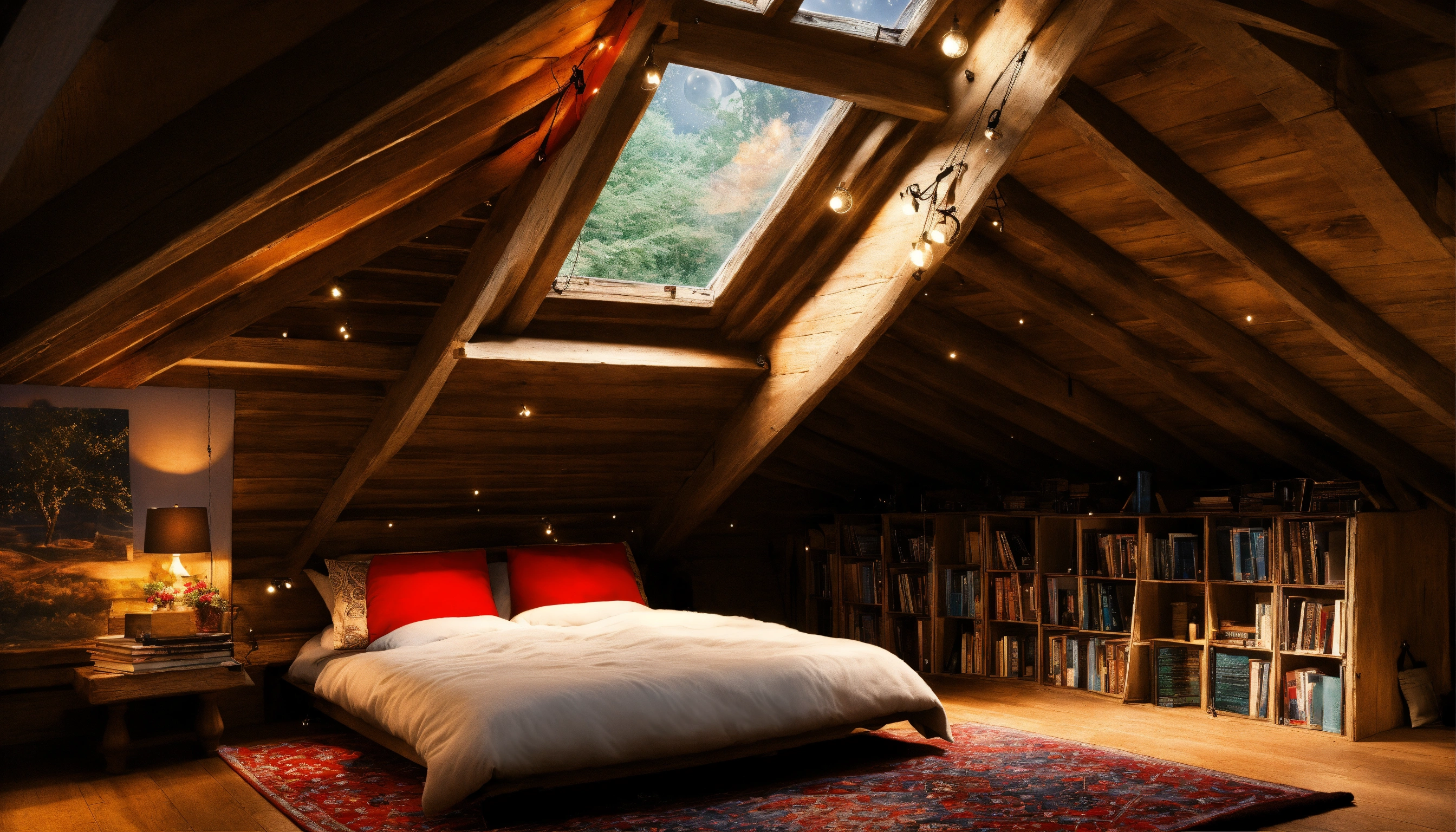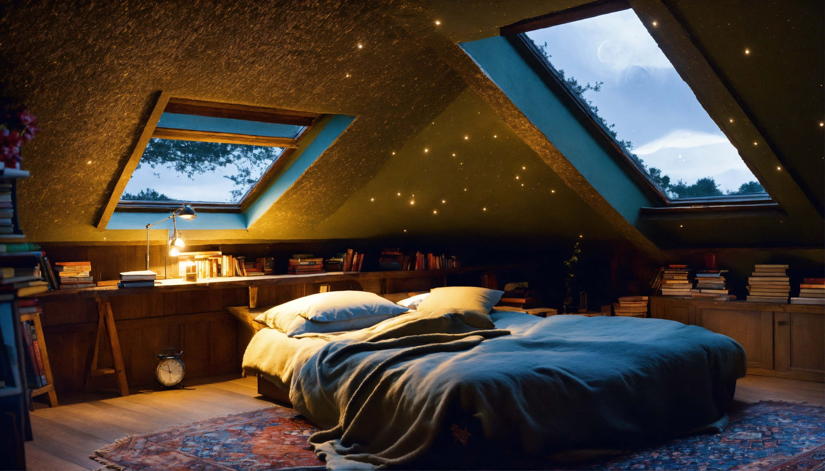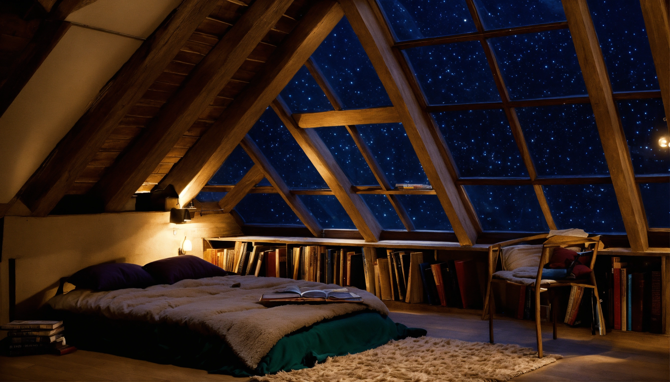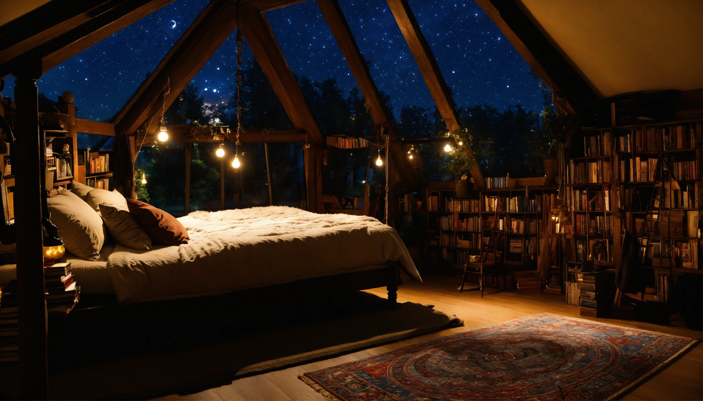 Bedroom, hanging bed, attic dark room, ceiling night stars window, fluffy rug, window, moonlight, books
