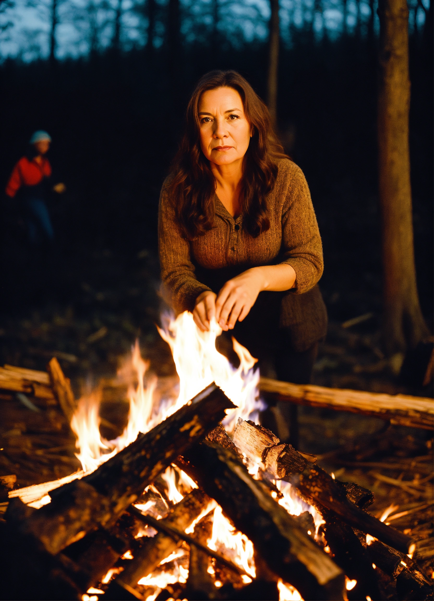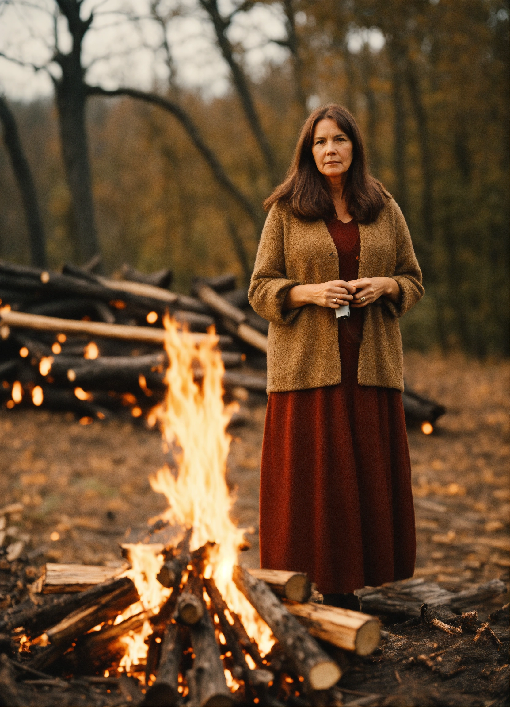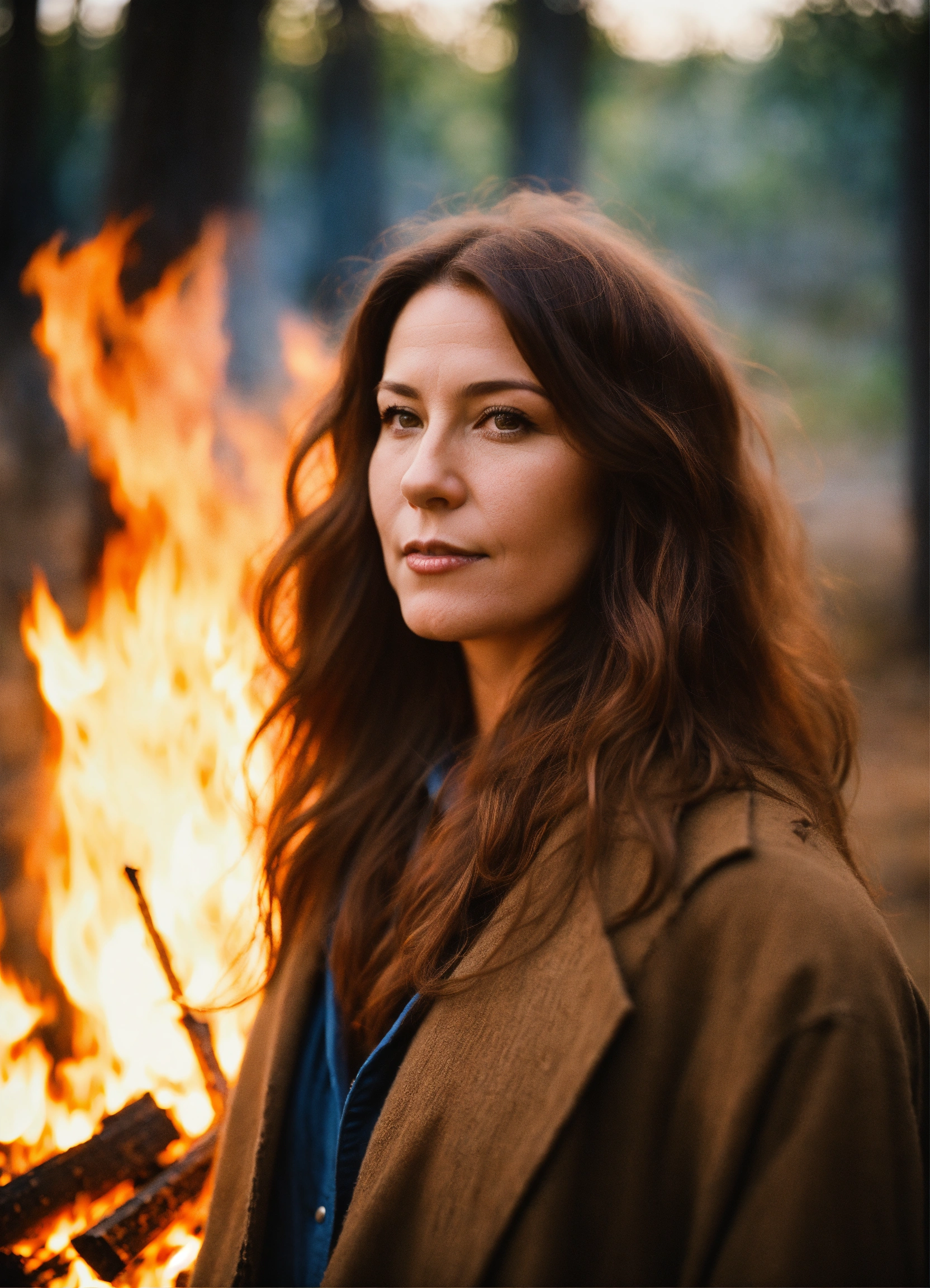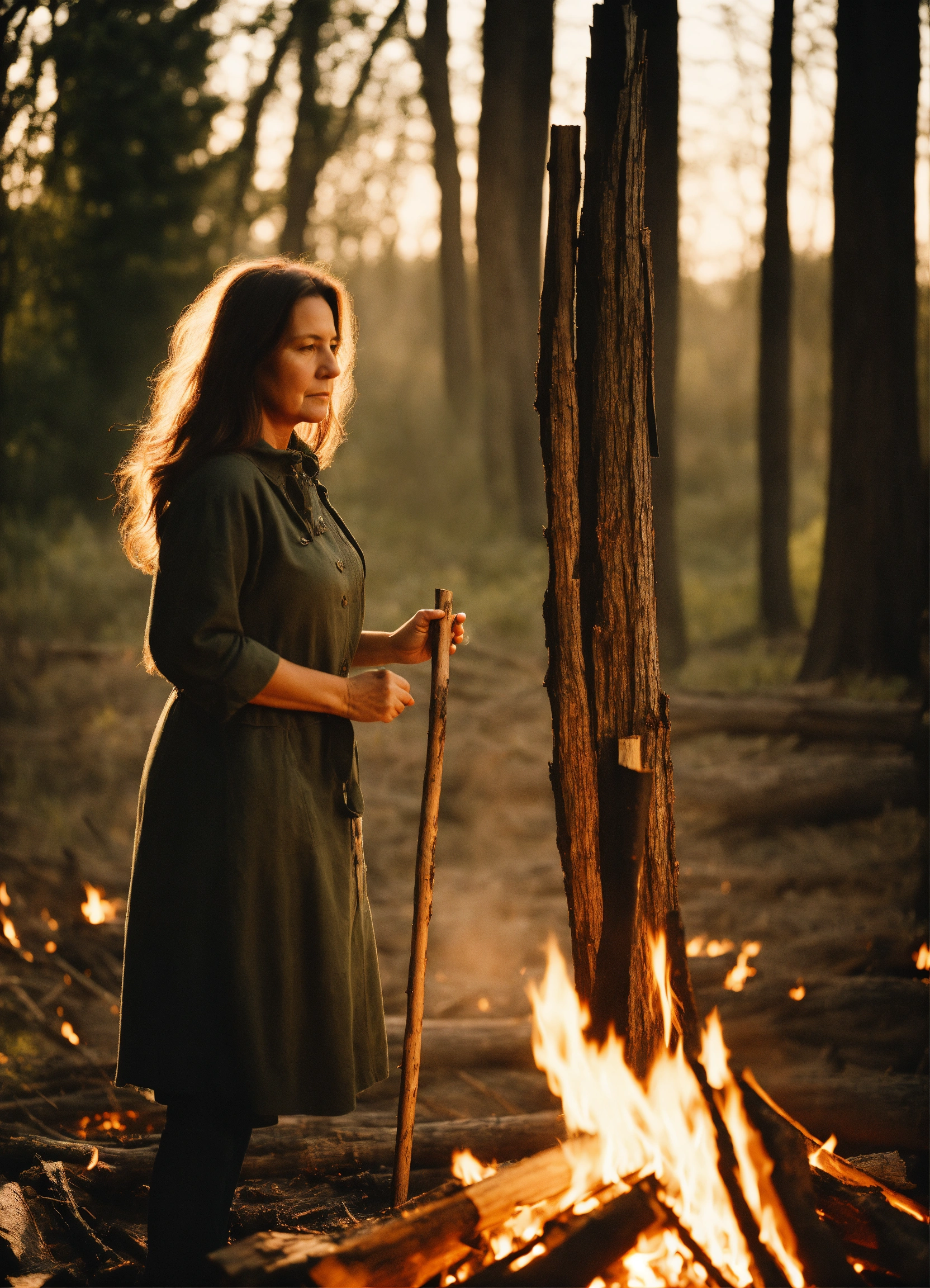 A photograph of a middle aged woman with long brown hair standing in a stake of bonfire wood, vintage kodak, shallow depth of field