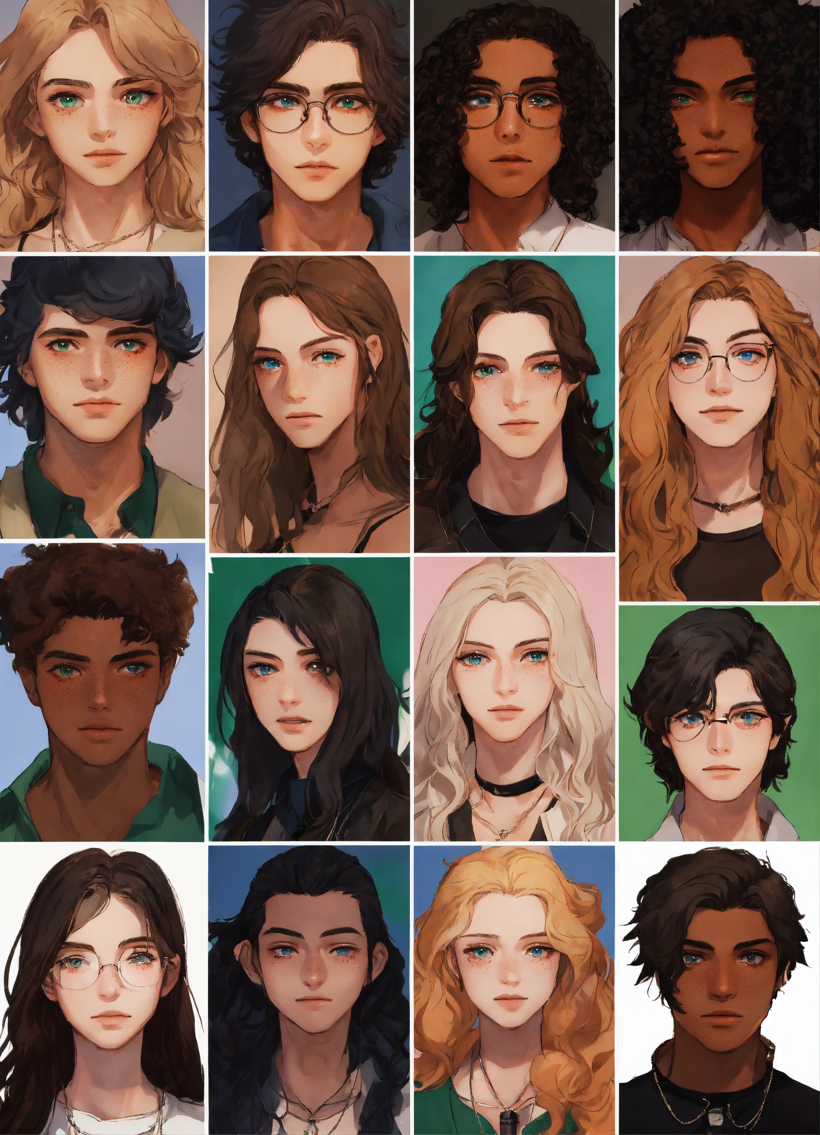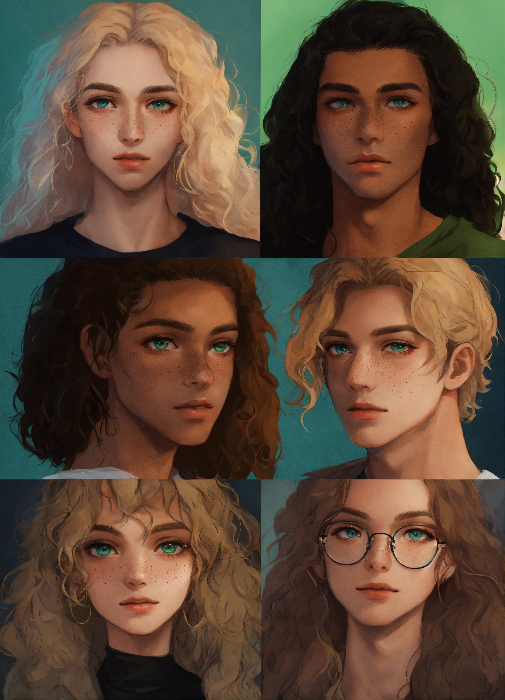 A group of 7 young adults. 1. is an 18-year-old girl with blond long hair, blue eyes and glasses. 2. is a 22-year-old man with dark brown hair, grey eyes and late 70s aesthetics. 3. is a black girl with long, dark hair, blue hair strands and bells in her hair, with amber eyes. 4. fourth is an 18-year-old boy with red, curly and short hair and green eyes, latino skin. 5. is a 19-year-old boy with short, black hair and dark blue eyes, aristocrat gothic aesthetics. 6. is a tall 25-year-old man with dark blond, long, wavy hair, freckles, stublles and green eyes. 7. is a 25-year-old woman with dark blond, short hair, freckles and green eyes. digital art, 8k