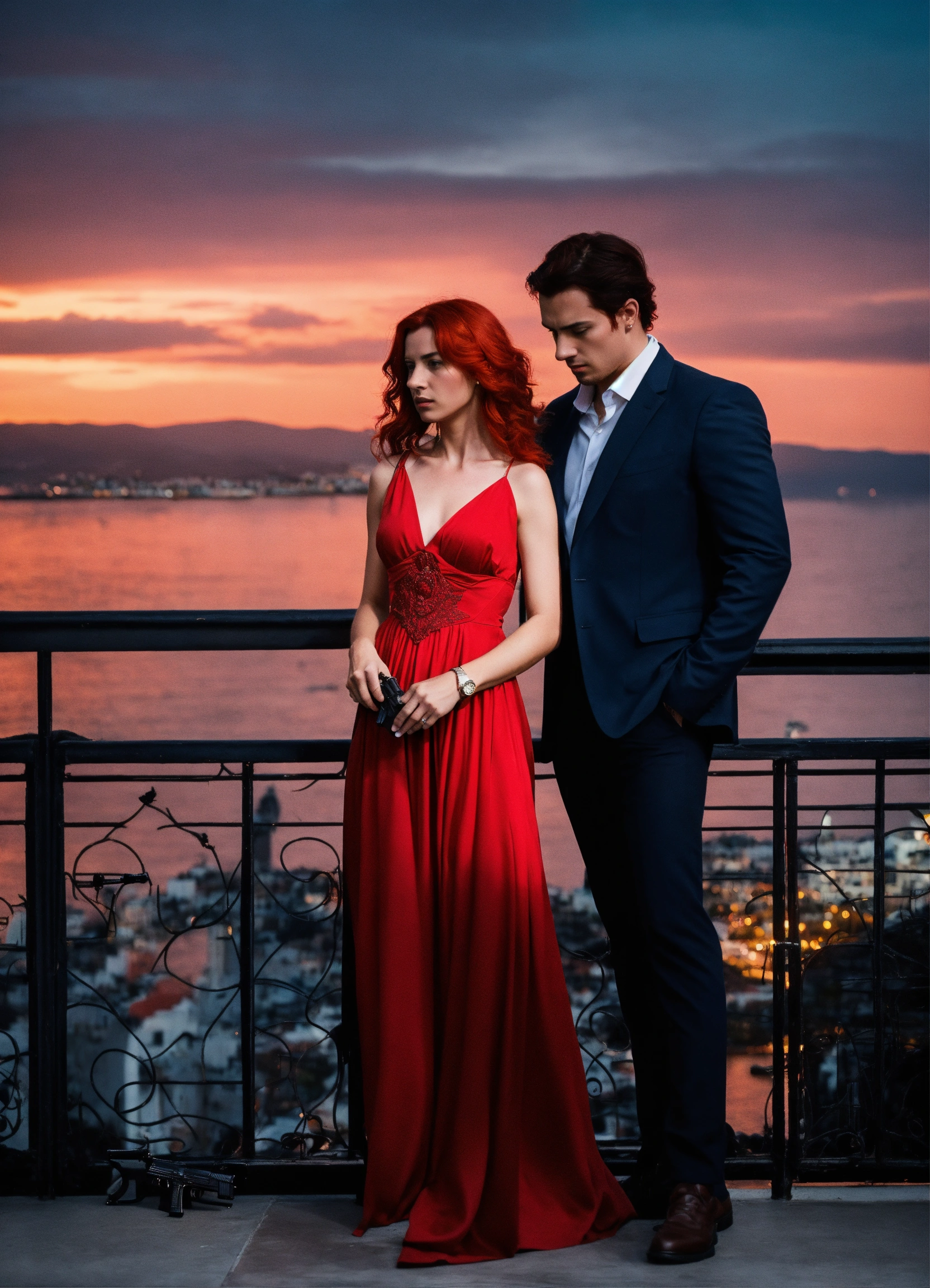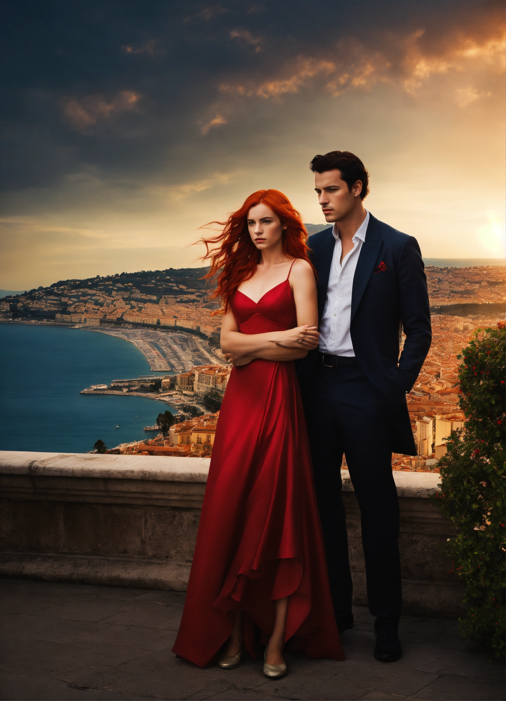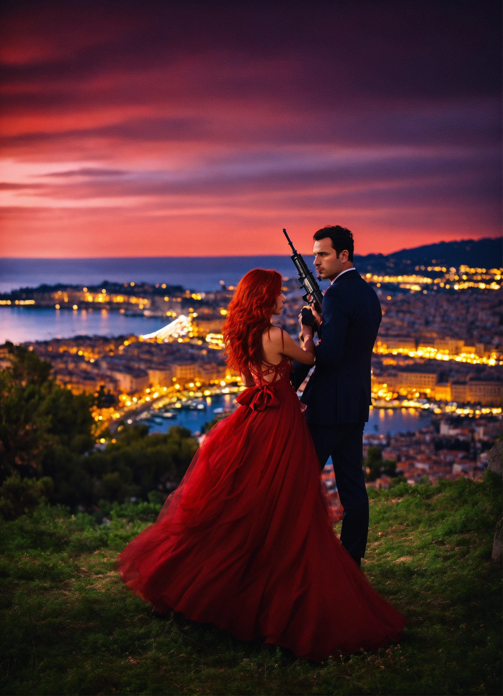In the modern and dark background is a large view of the bay of angel in nice, a man with dark hair has a gun in his hands and a woman with red hair with a long dress
