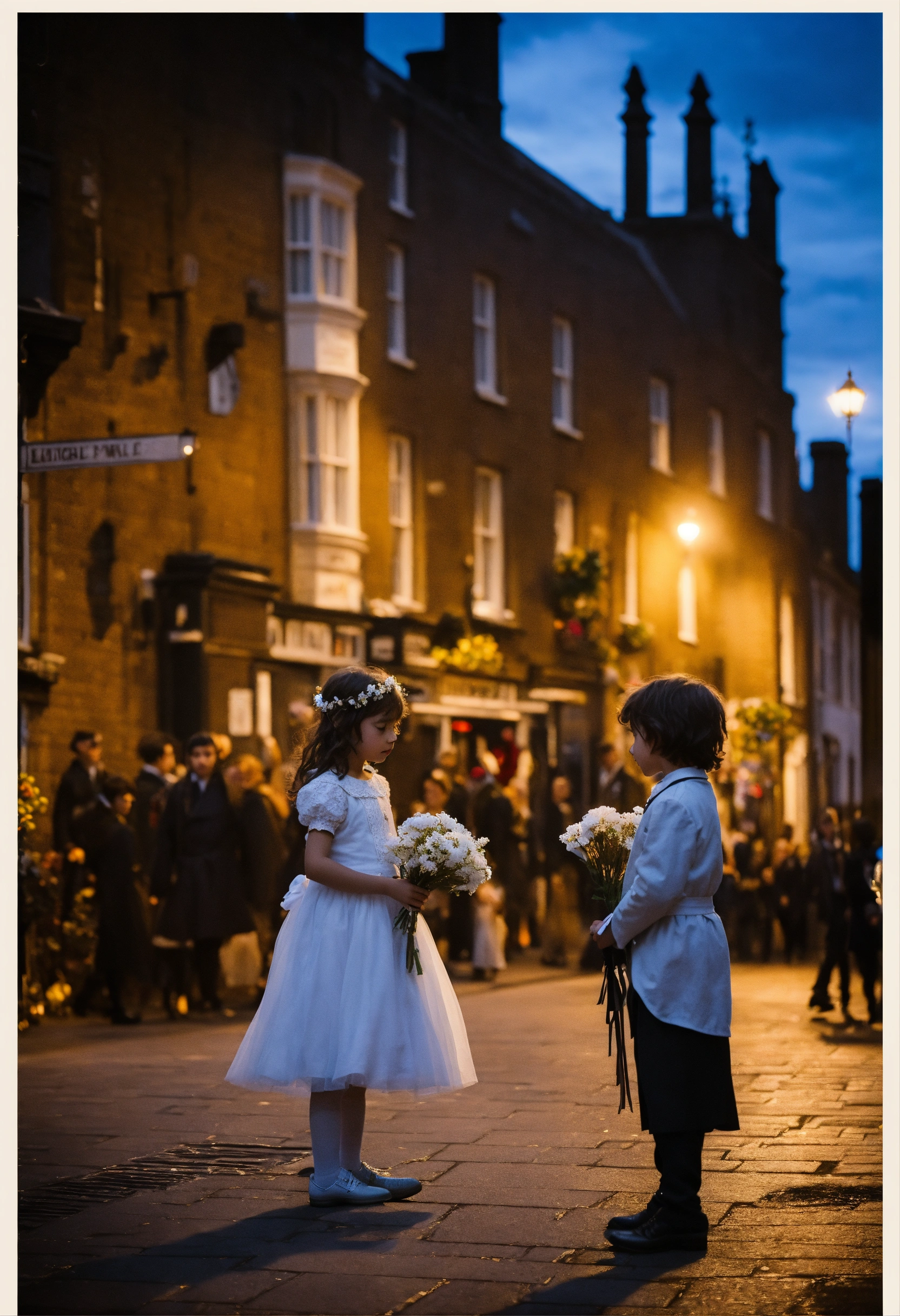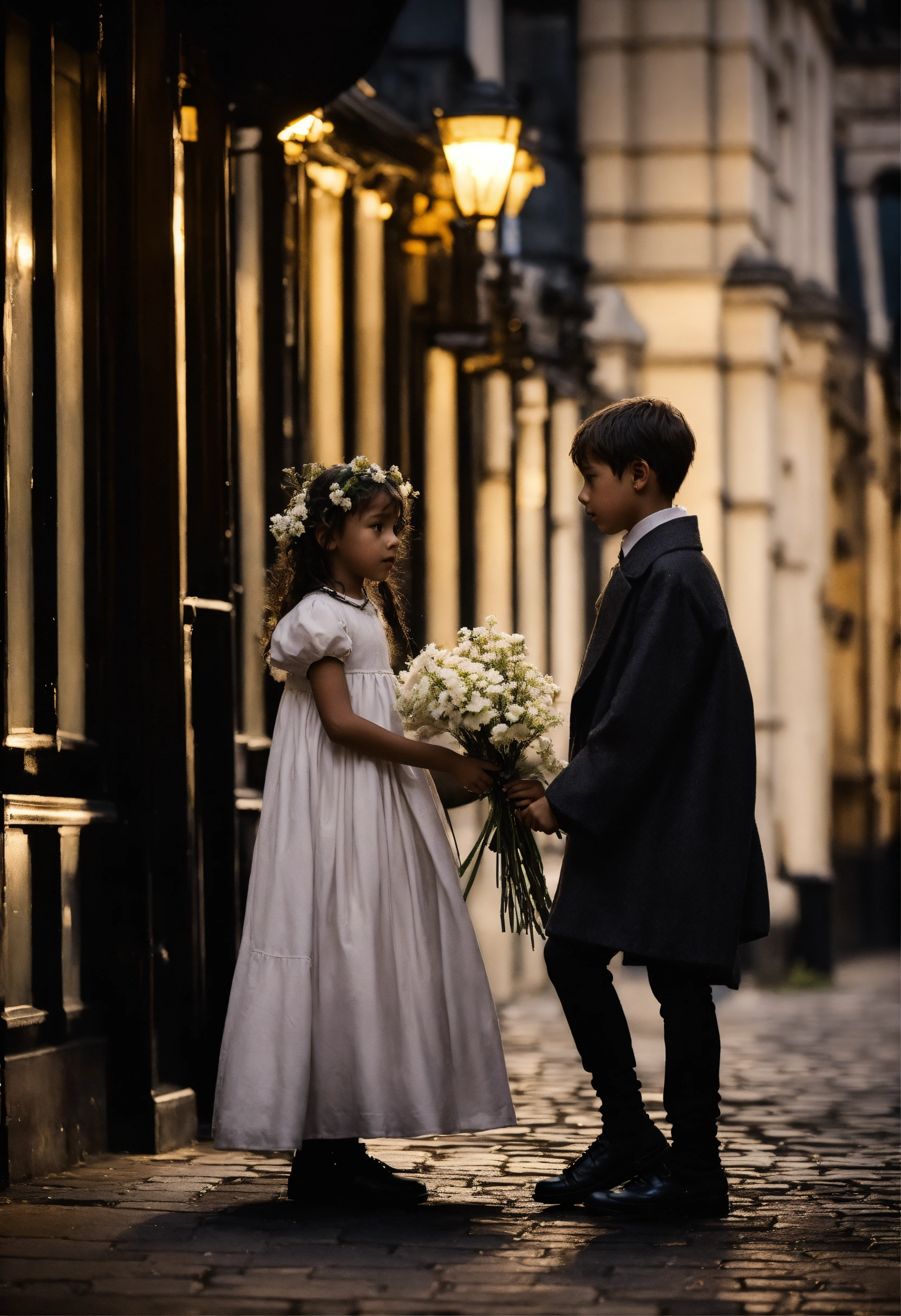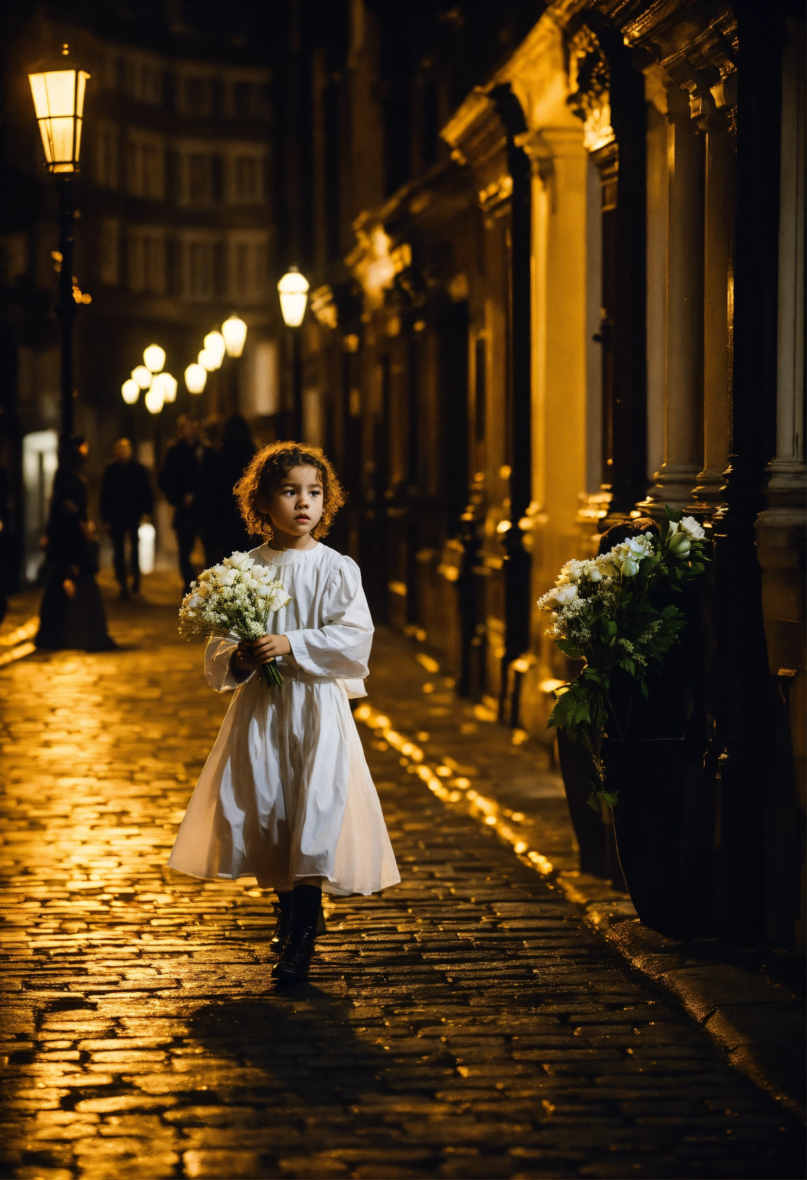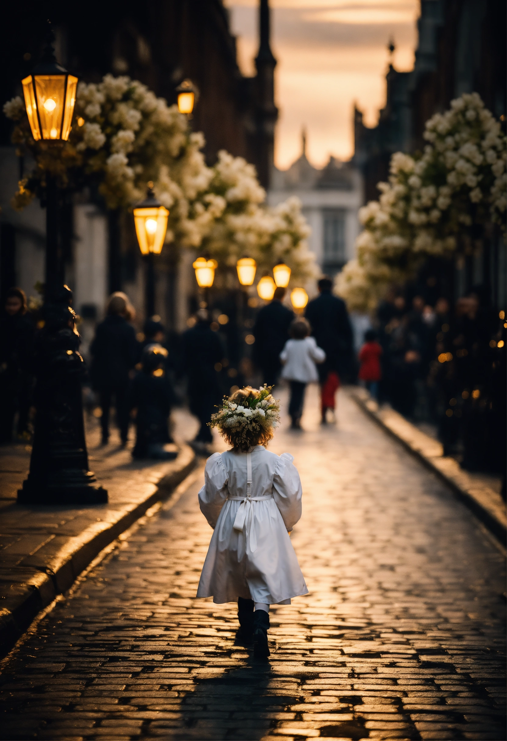 Dramatic film children in white holding flowers meeting man in knight clothing walking streets of london in the dark alone