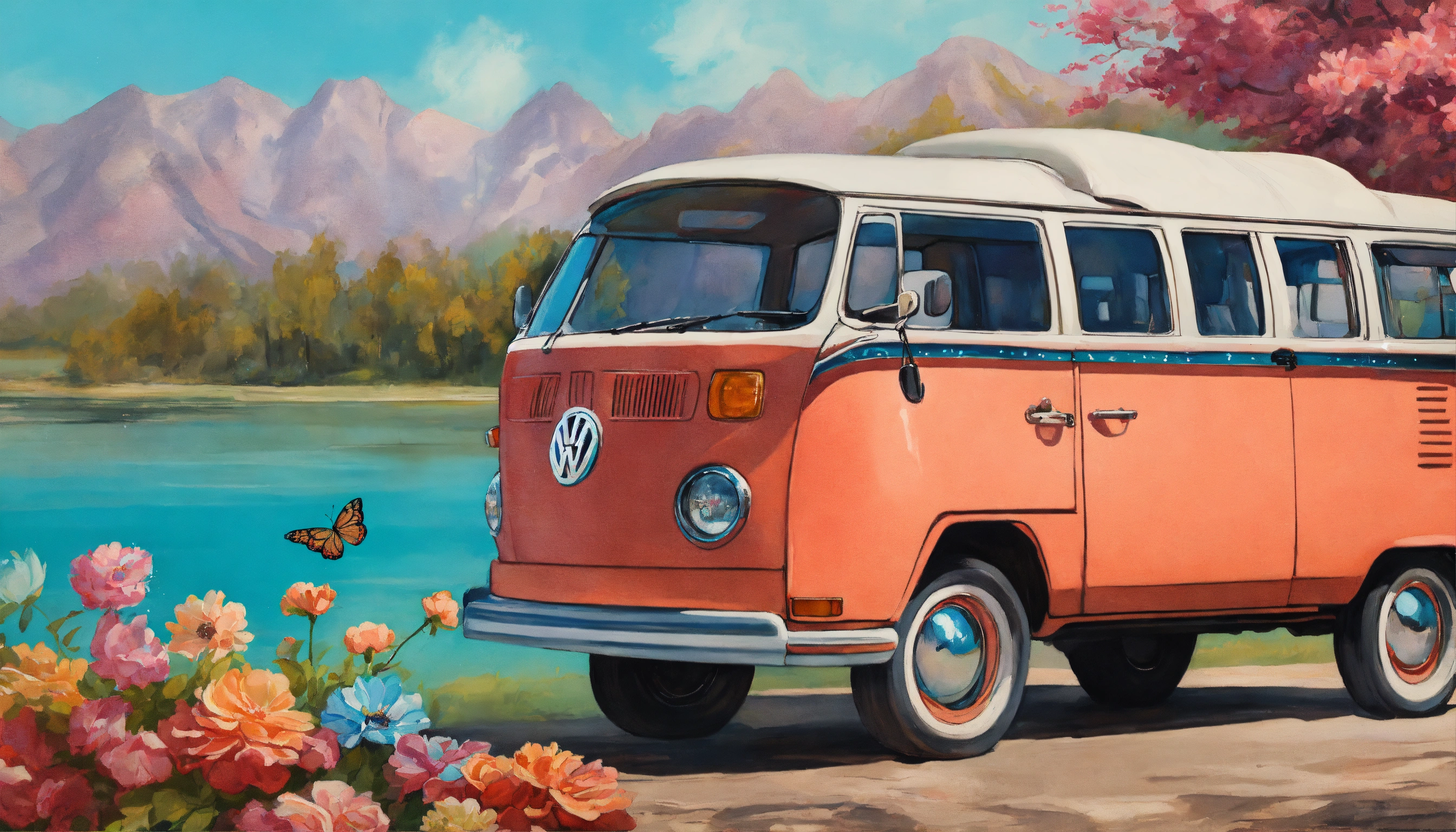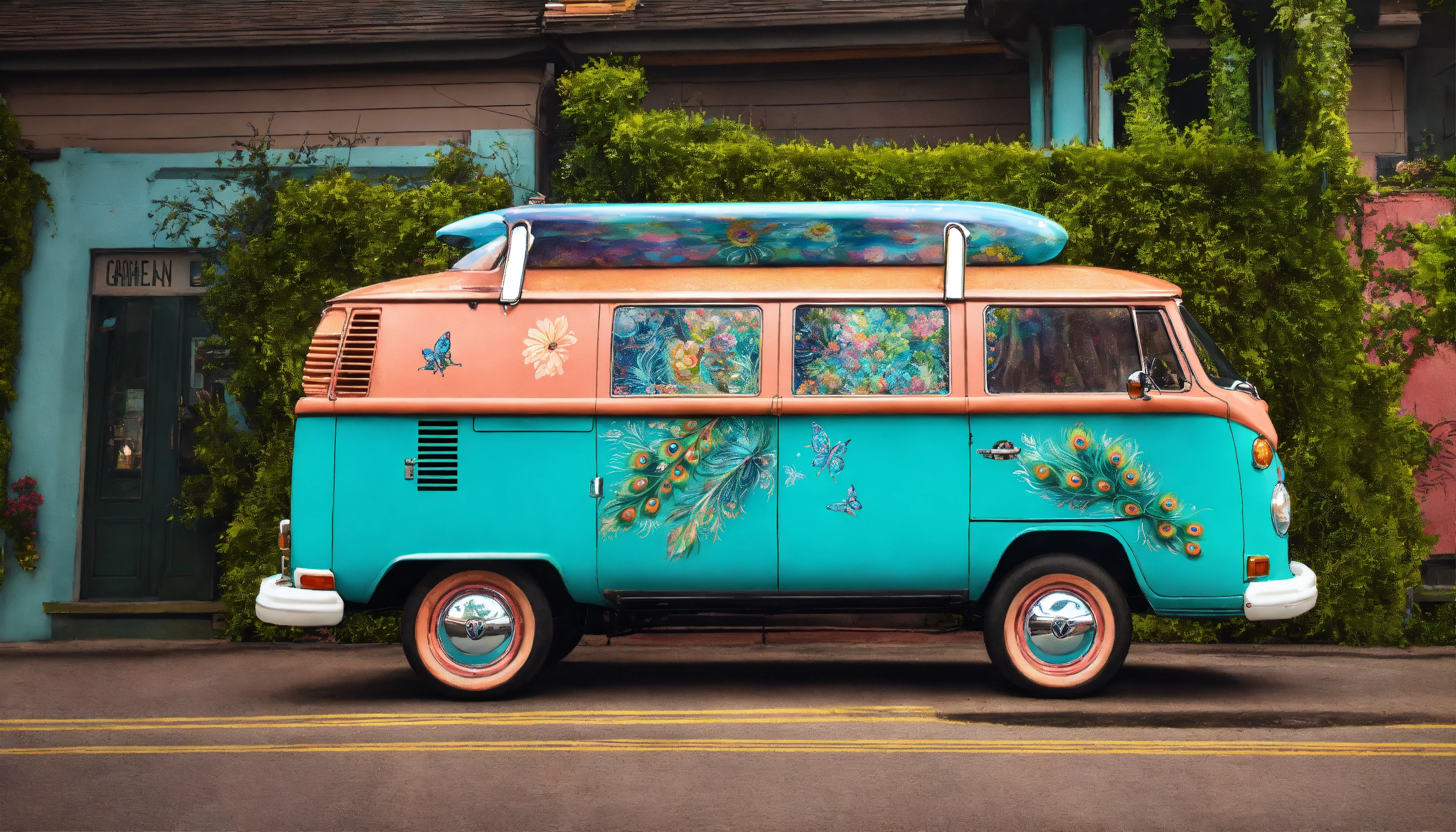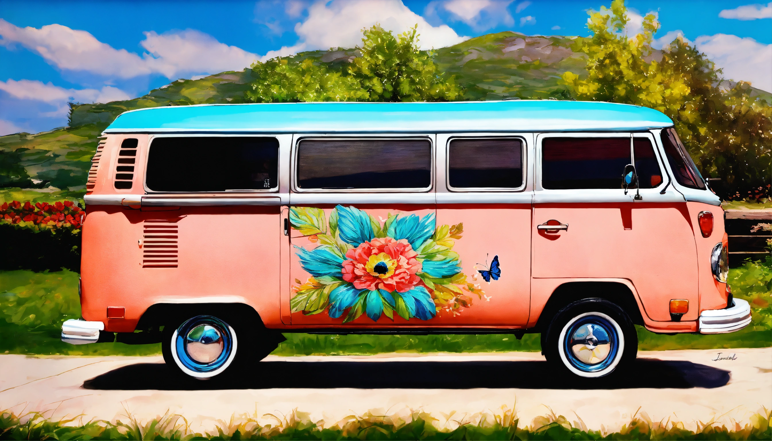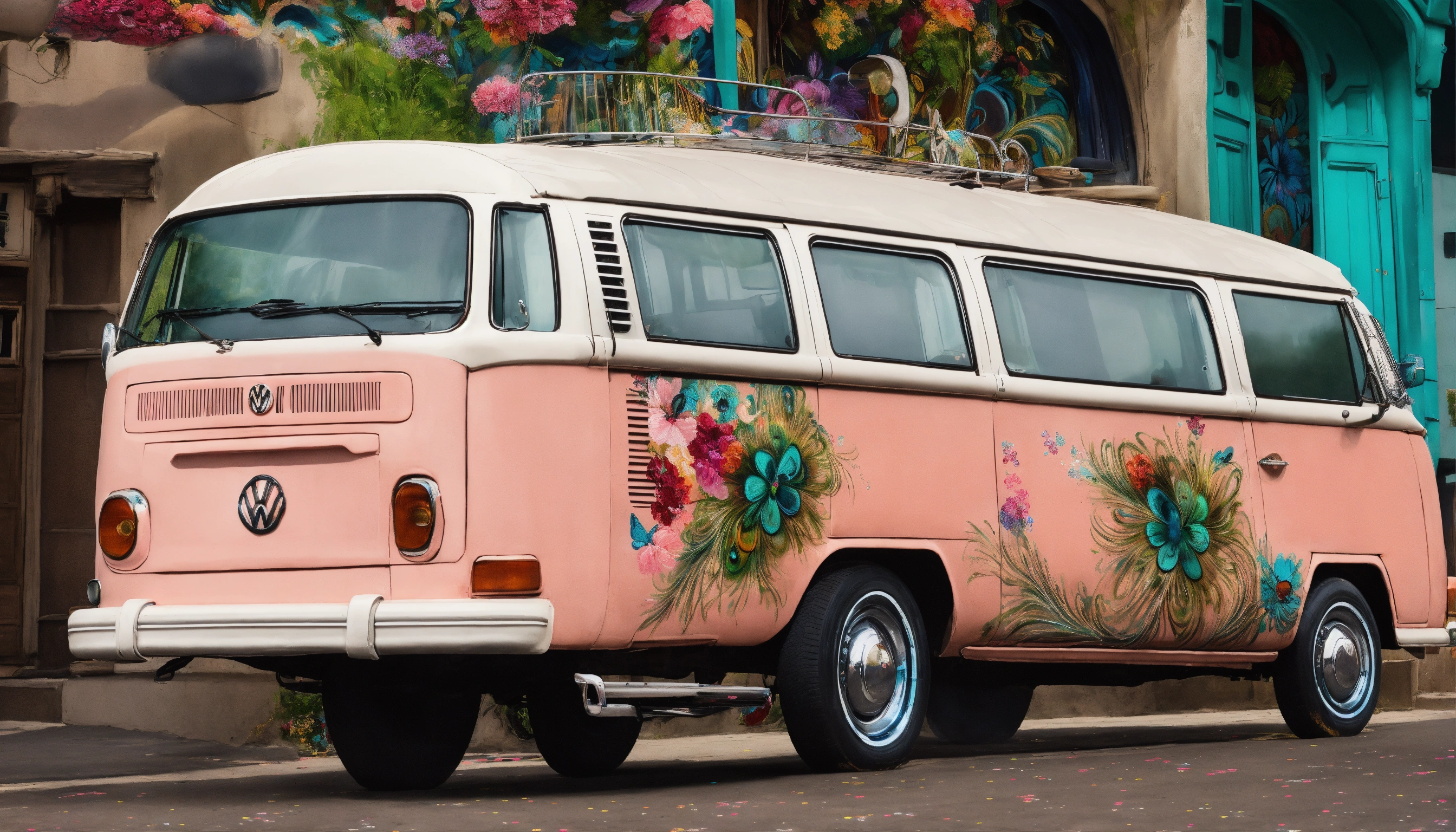 Concept art of salmon coral pink volkswagen bus, paint on side of bus, personalized, girly, feminine, handpainted, artsy, boho, hyper realistic, realistic, hyper realism, painted, beautiful, unique, floral, vintage, hippie, view from side, colorful, realistic, hyper realistic image, beautiful painted flowers on the side of the car, bohemian, decorated, perfect, painted peacock, sequins, glitter, glitter paint, beautiful embroidered curtains on windows, turquoise, glitter peacock painted on side with elaborate tail, detailed, intricate, butterflies painted, designs painted all over the van, sparkle