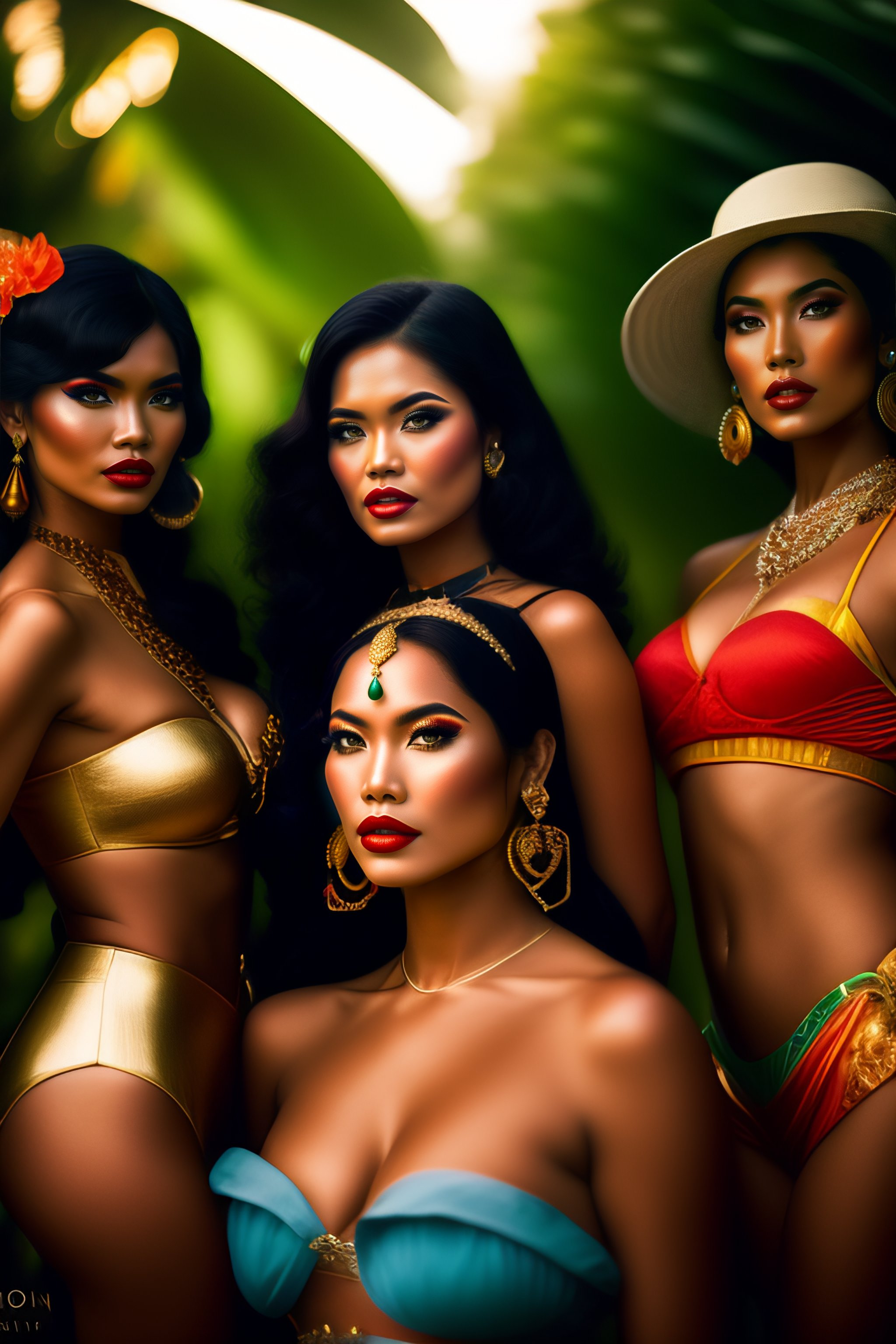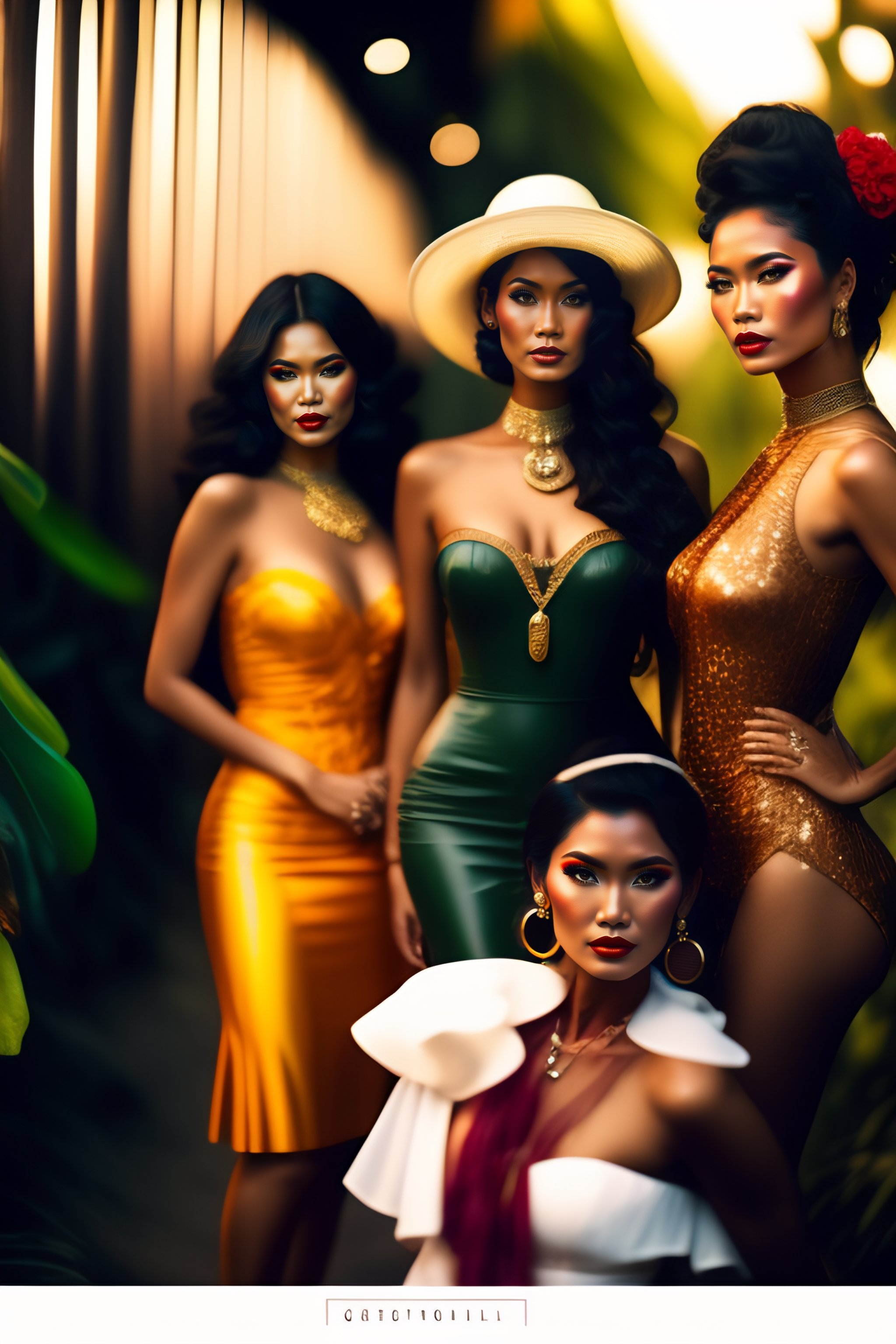 A group of full body filipino-italian pin-up women, near a rainforest, amazonian women with short skirts, cinnamon brown skin, surrealism, art deco, future art cubist designs borders lines decorations not a portrait, intrincated details, street photo, high fashion, film, renoir, hobo style, vogue italia, future, casual, jewelry, long hair, low light, night, party, romance