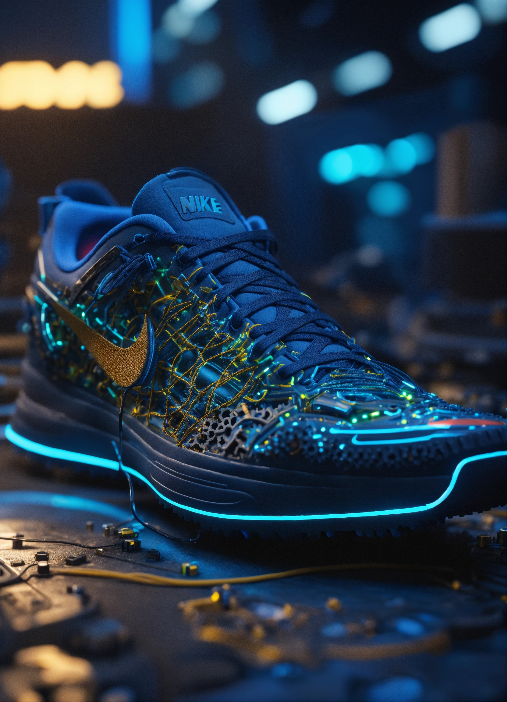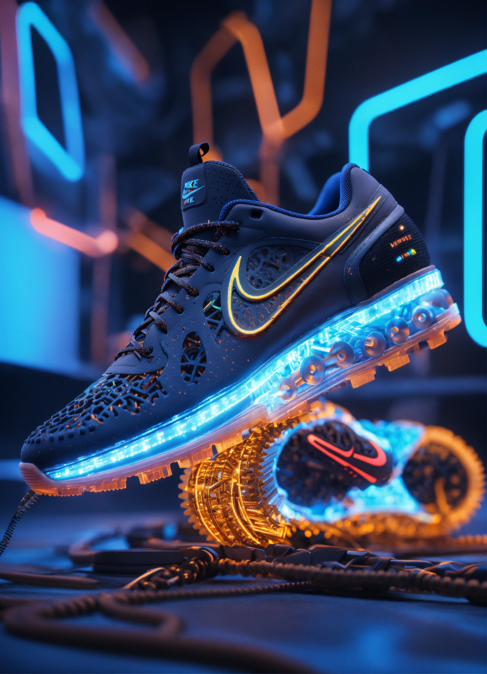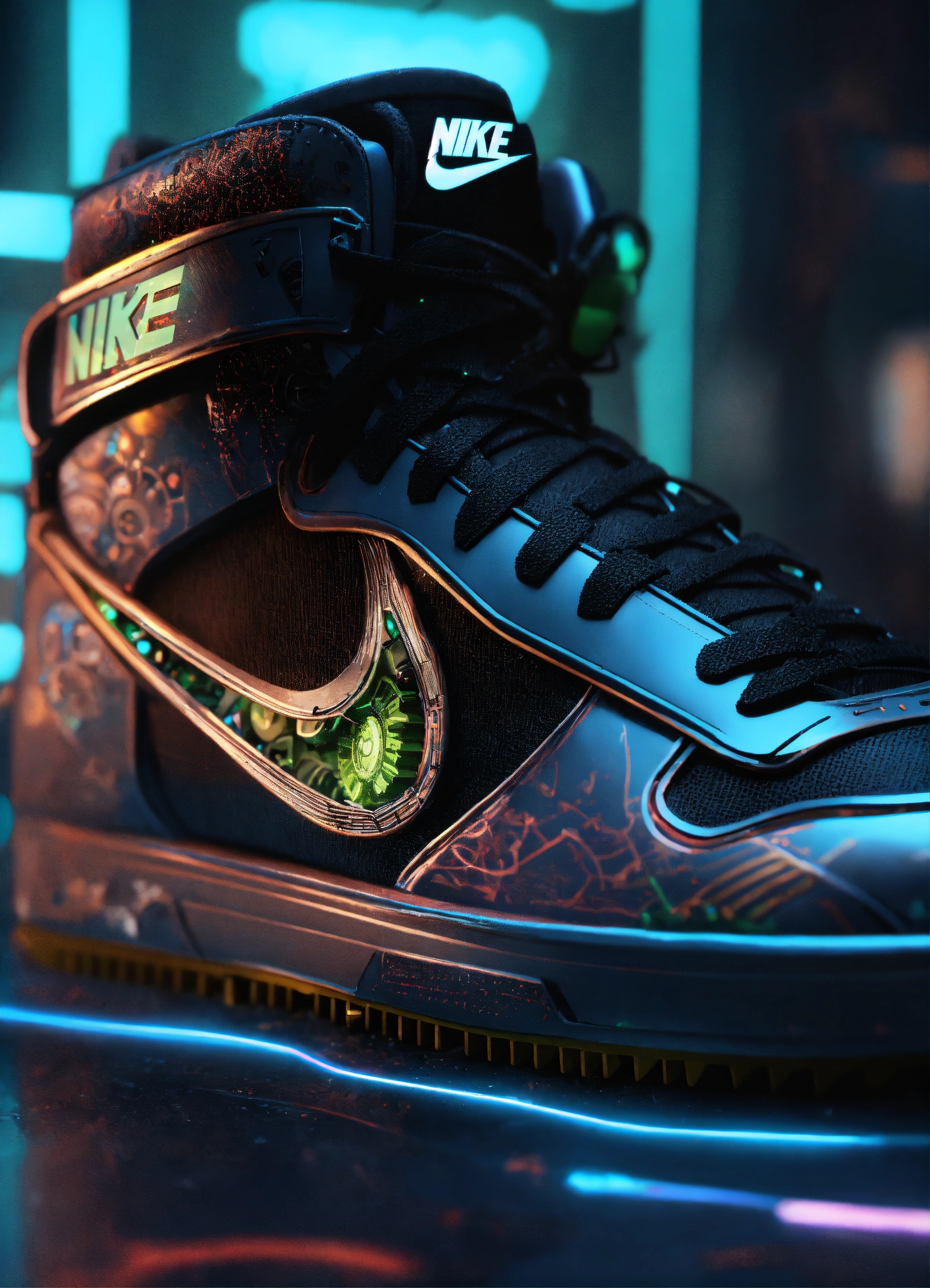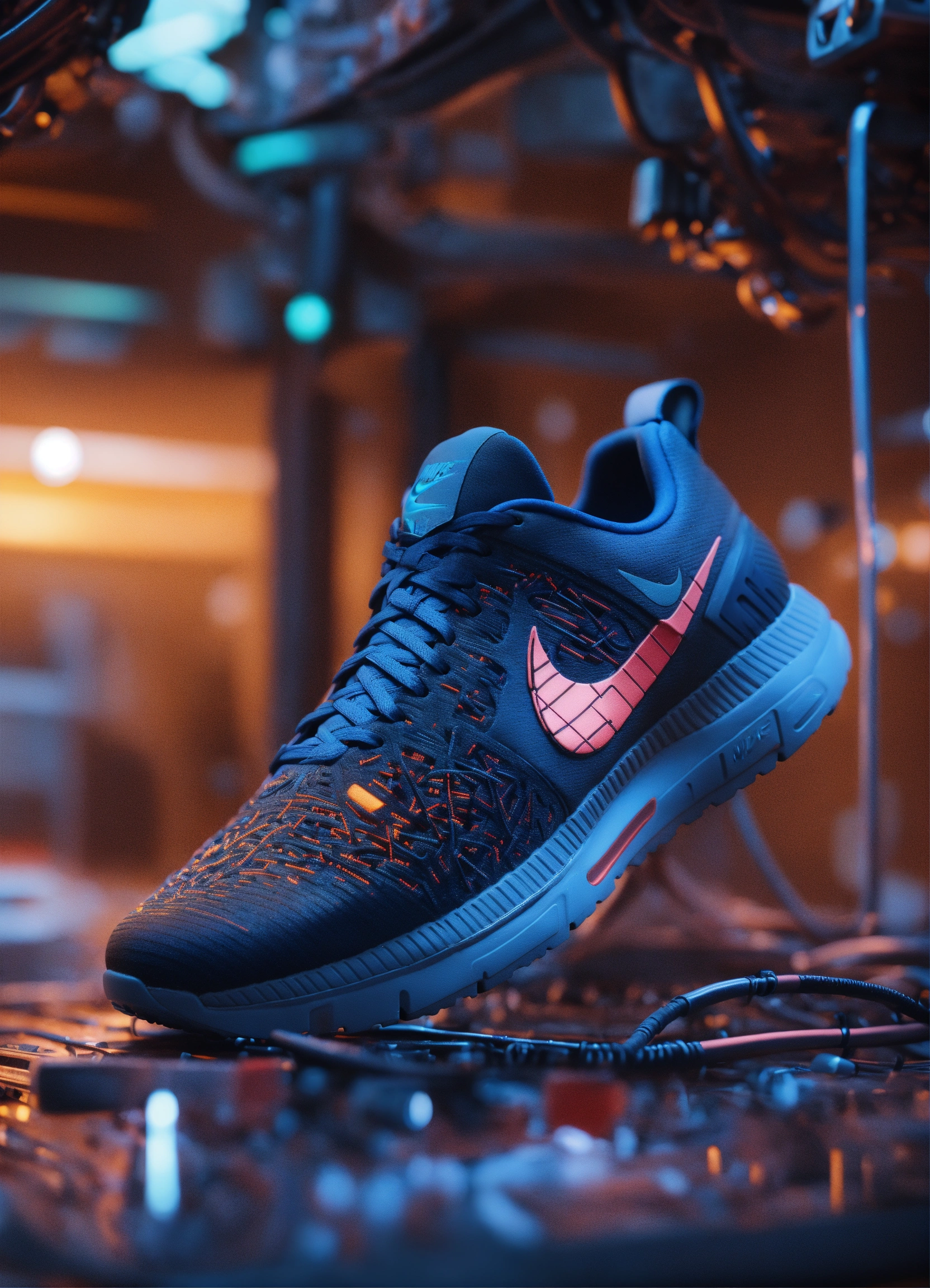 Nike sneakers made out (gears, wires, mechanical, electronics), pcb, hyper-realis, futurist, stunning unreal engine render 8k, hyper-realistic. surrealism, dark hues