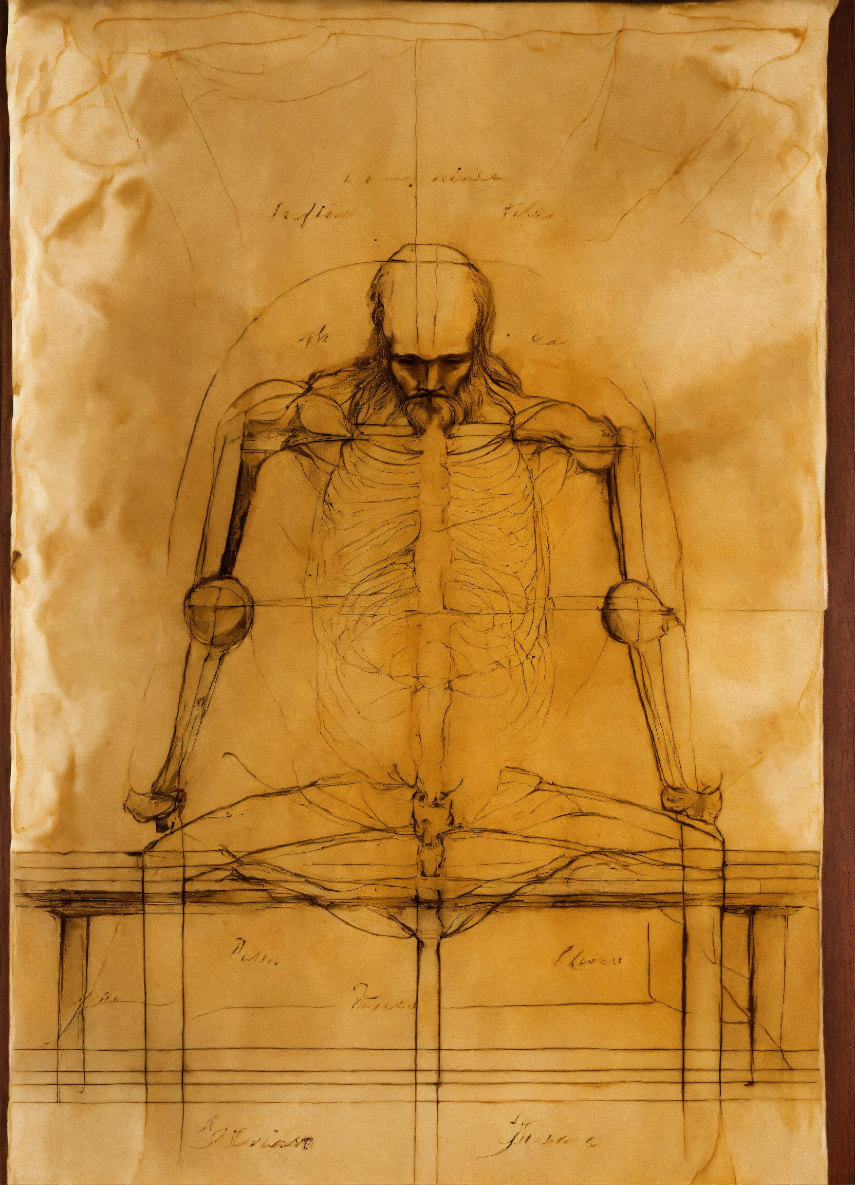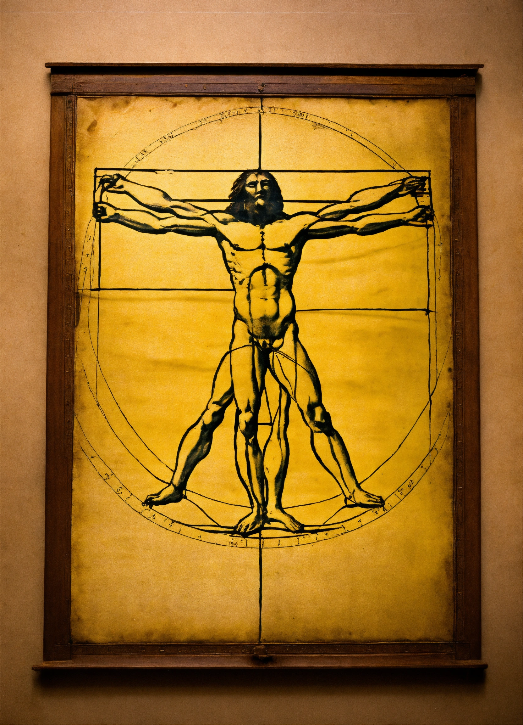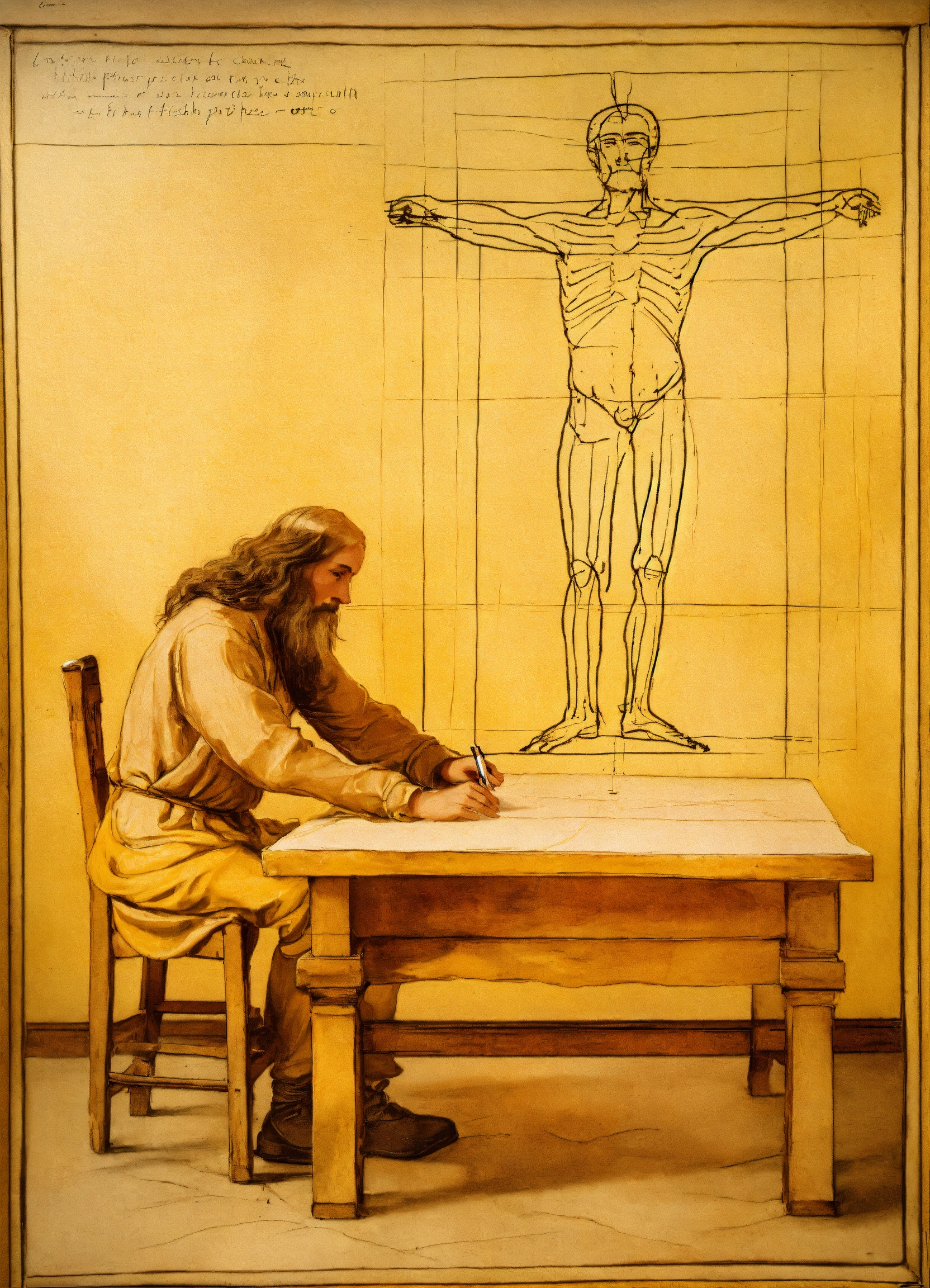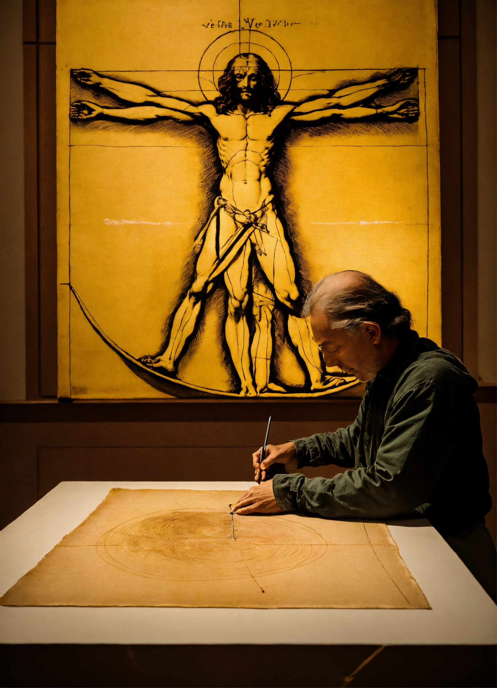 Image with photograph technique, by leonardo da vinci observing the initial stroke on a yellowish parchment on a table, the vetruvian man, in a florentine environment