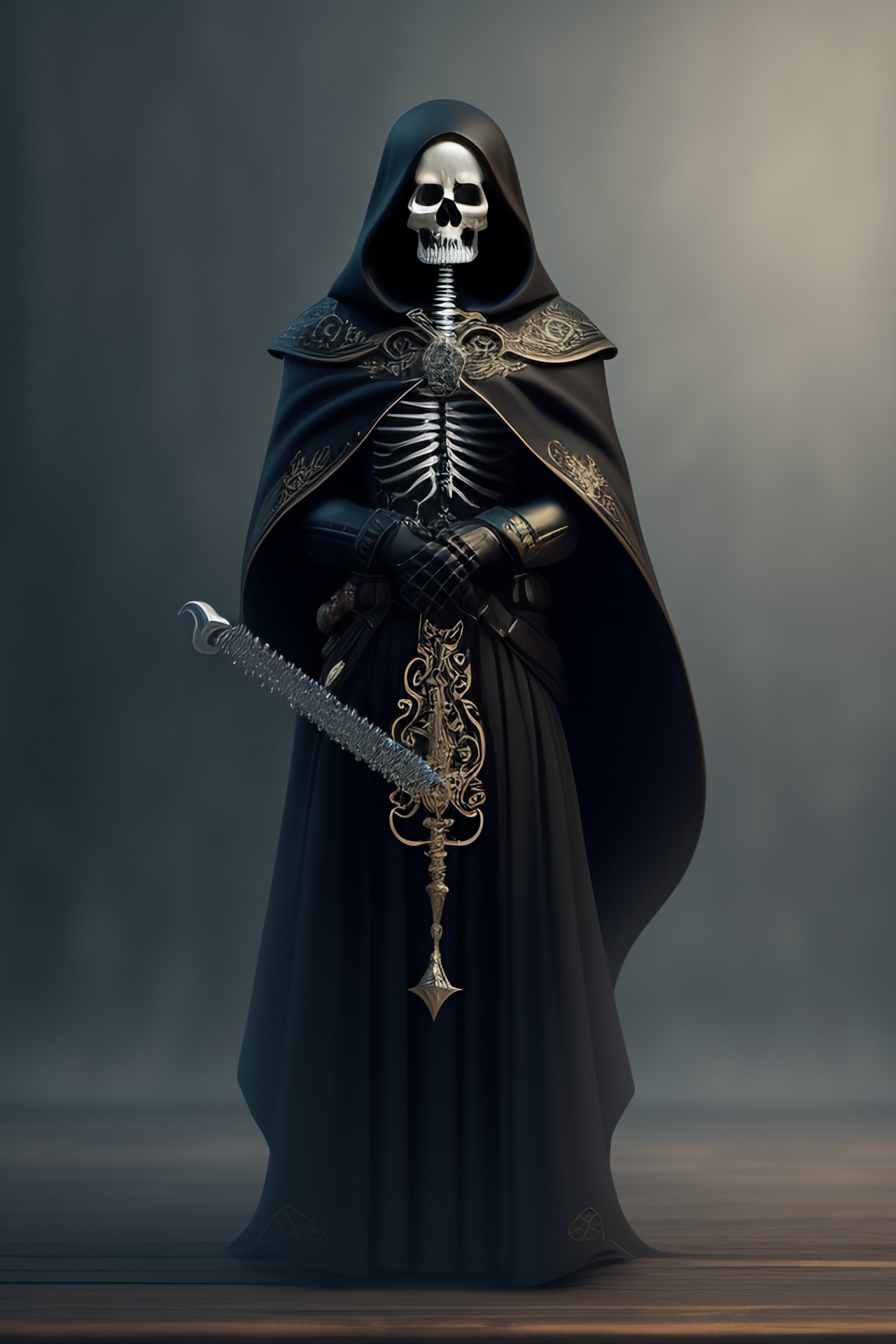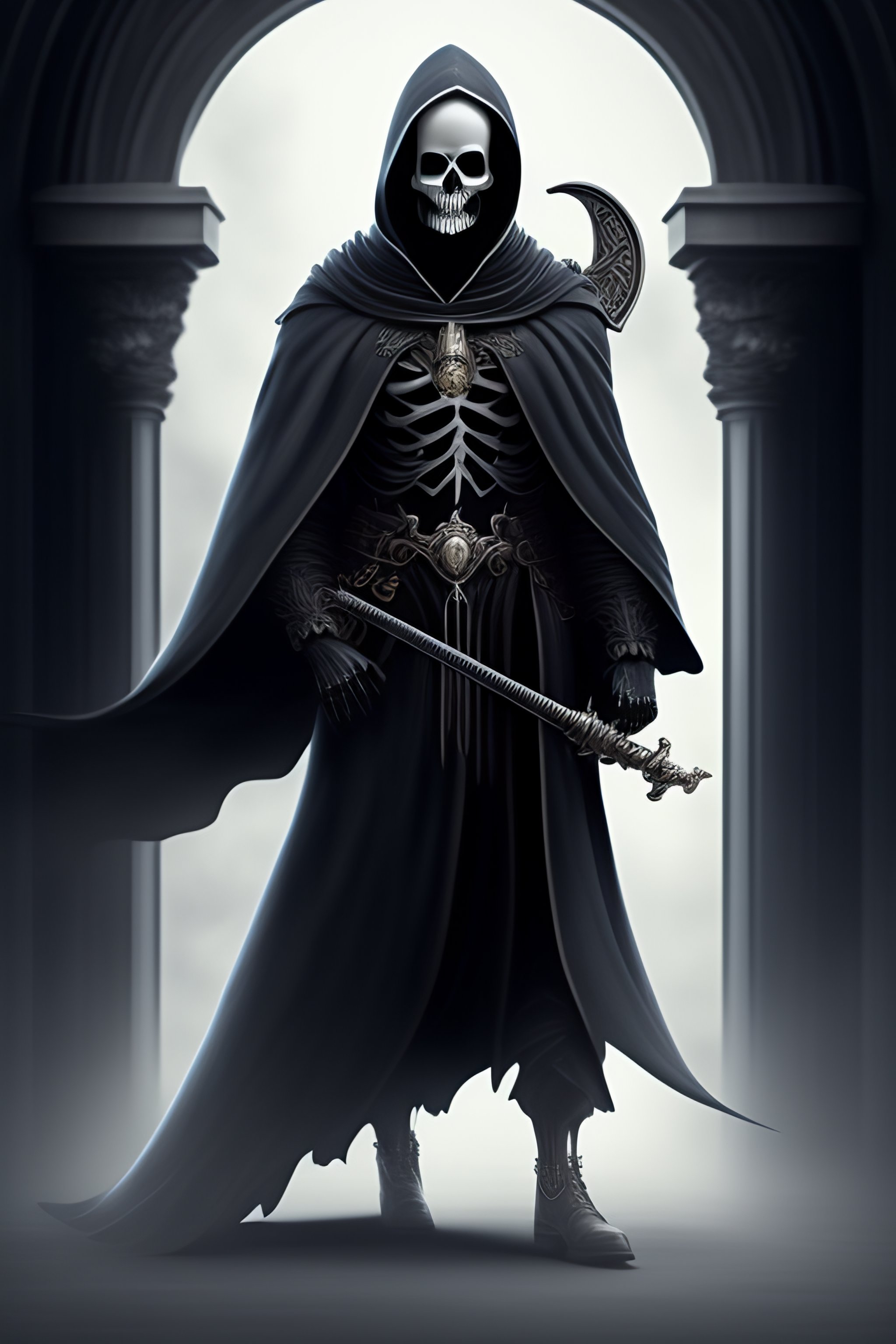Grim reaper skeleton in a gray ceremonial dress, carrying a scythe in one hand and a book in the other, having an hourglass in his belt, dark fantasy style