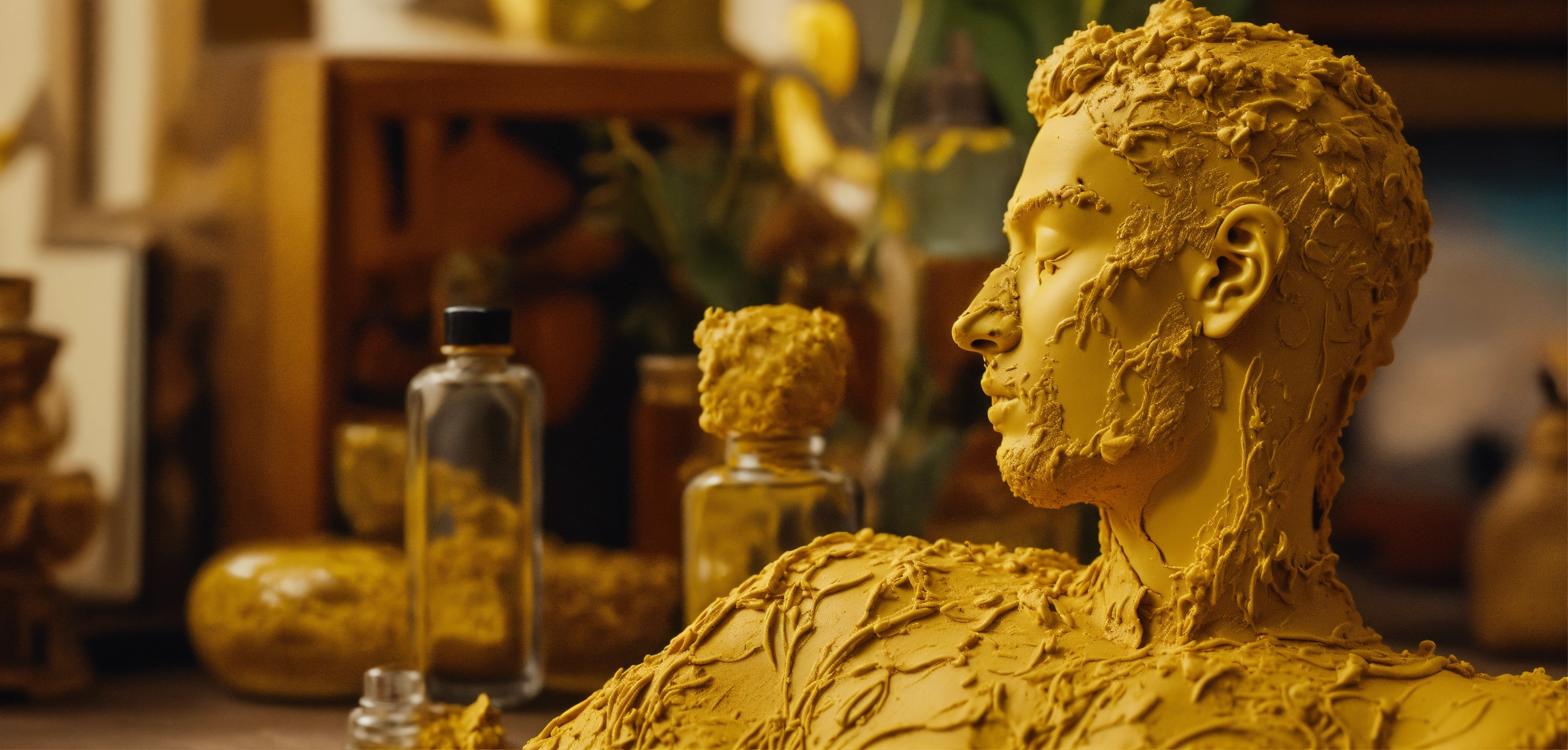 3d abstract modeling clay man body, egon schiele inspiration, skin enveloping experience, salvador dali room inspiration, close-up view of perfume bottle