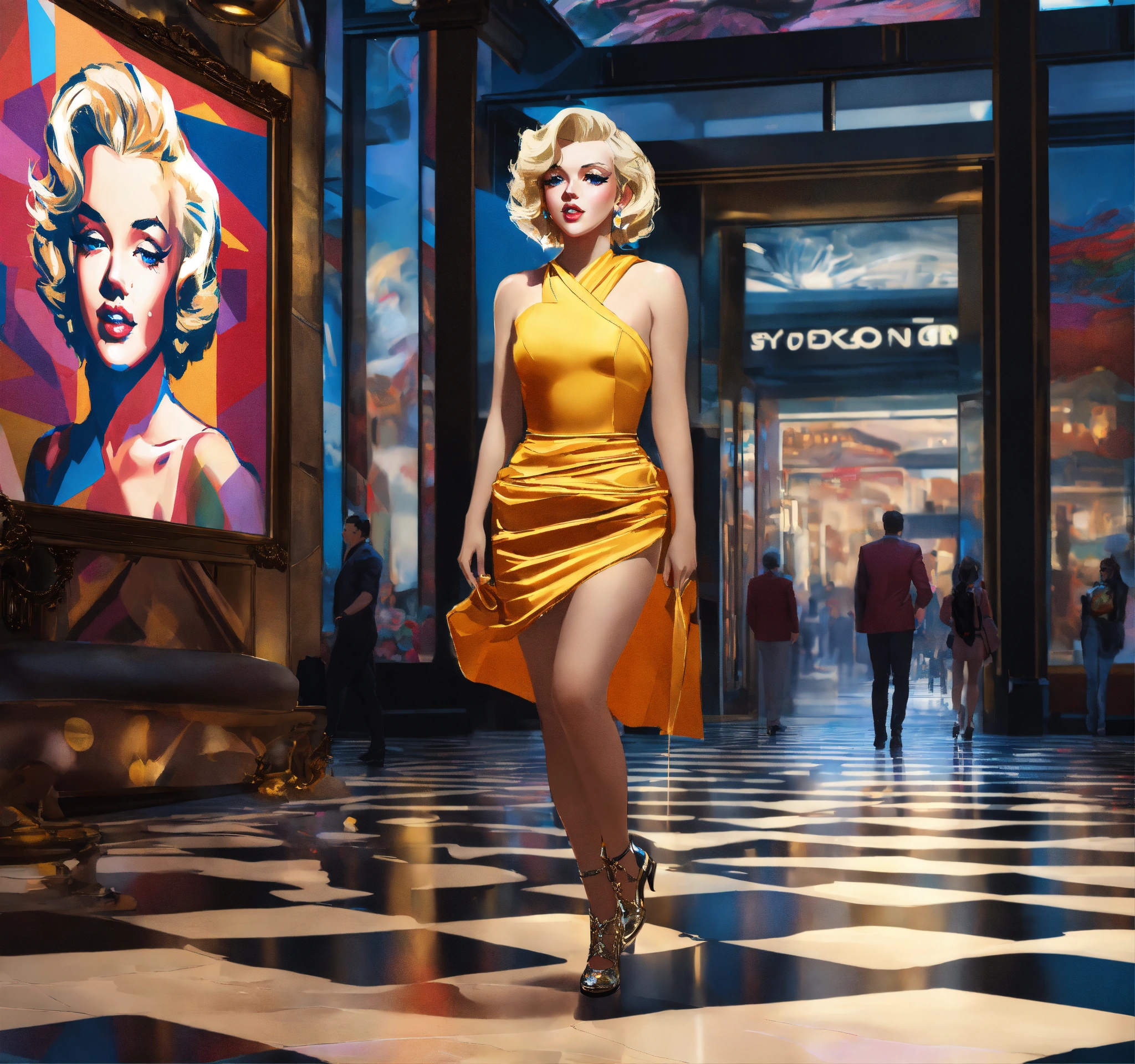 Full body pop art, hyperrealist portrait of young "marilyn monroe" walking in a fancy mall in background, fantasy art, photo realistic, dynamic lighting, artstation, poster, volumetric lighting, very detailed faces, 4 k, award winning