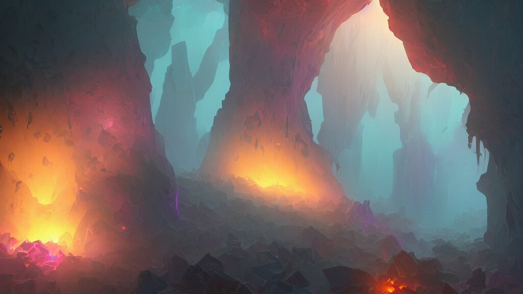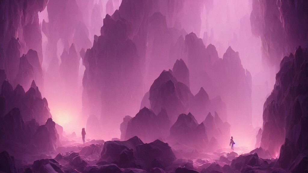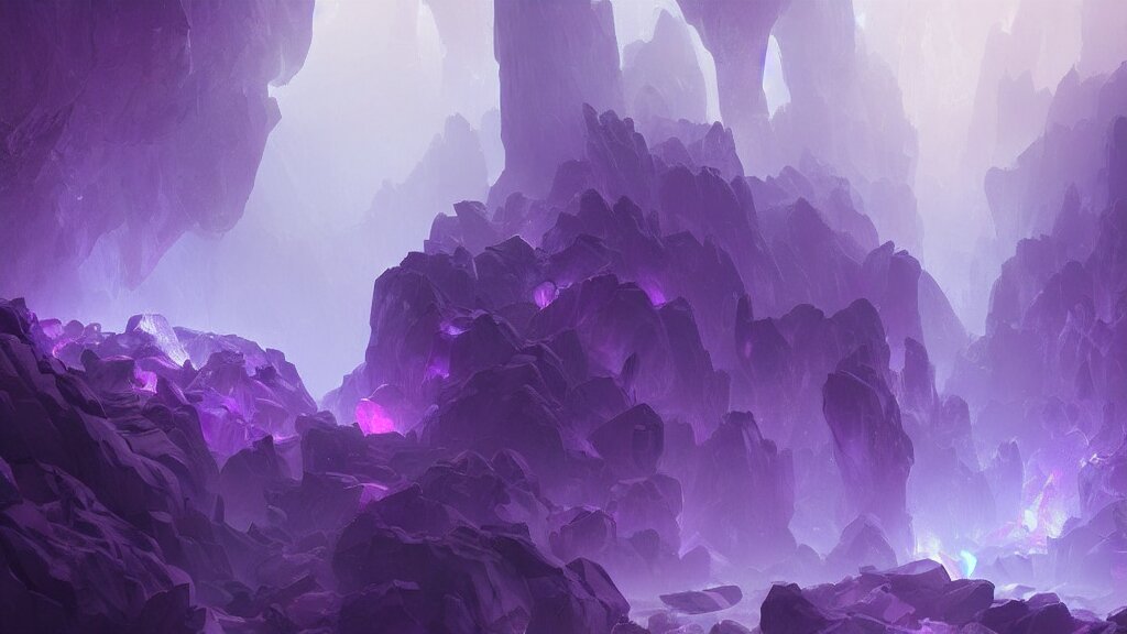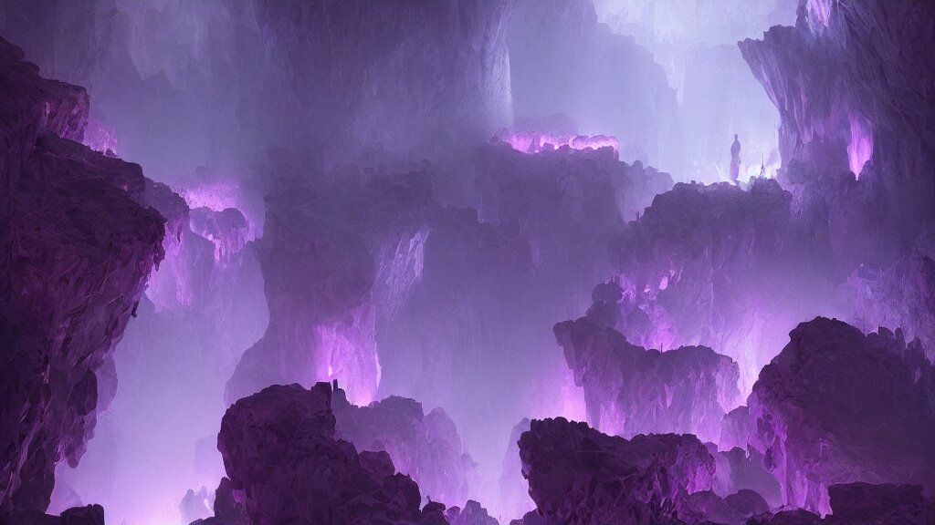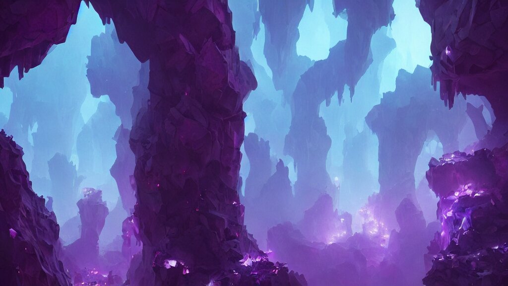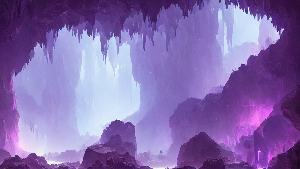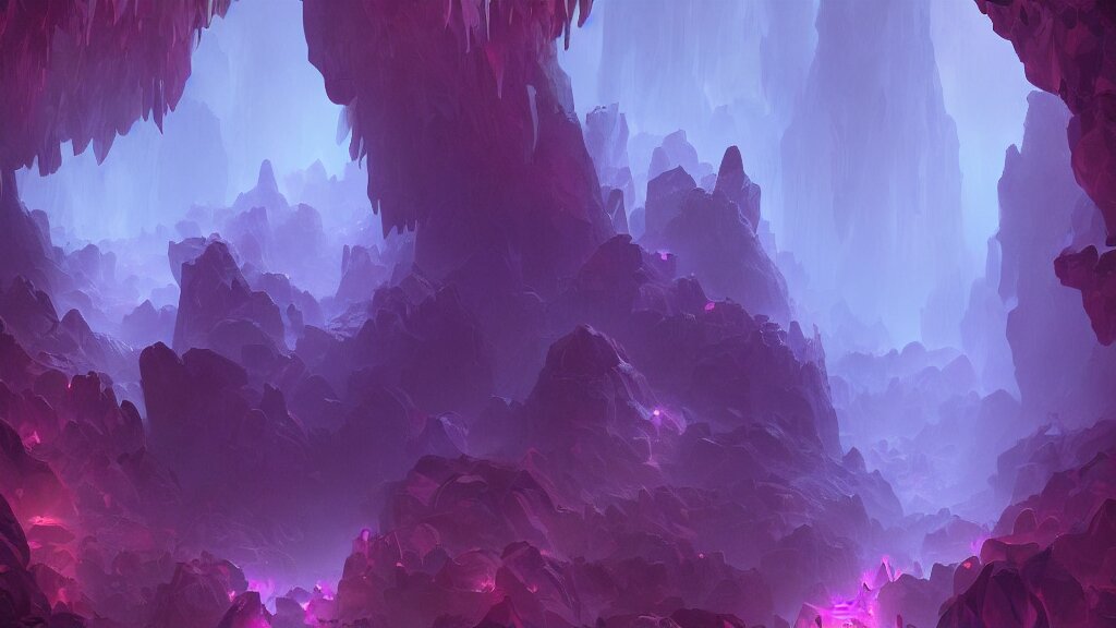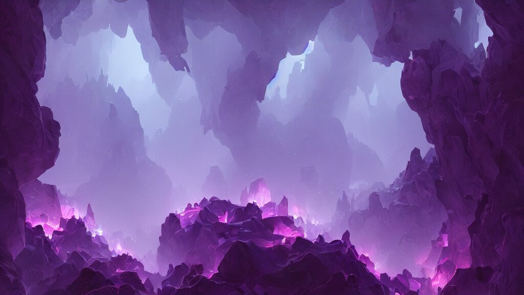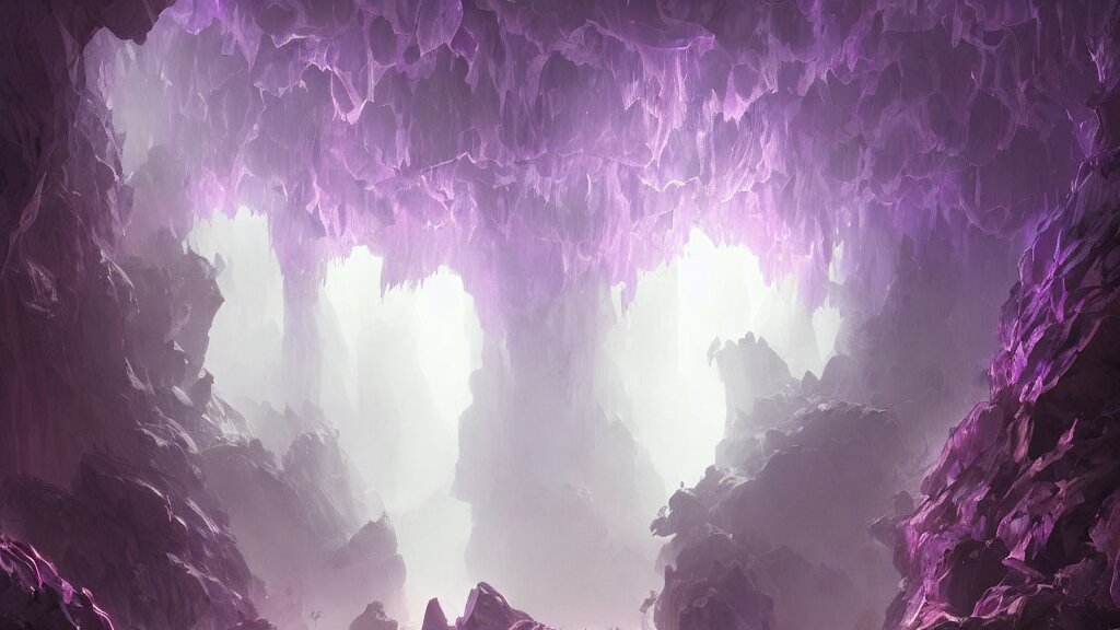 A dark cave illuminated by large glowing violet crystal shards and veins, glowing!, foggy, by sylvain sarrailh, rossdraws, ambient light, ultra detailed, fantasy artwork, 8 k, volumetric lighting, trending on artstation, award winning, beautiful scenery, very very very very very very very beautiful.
