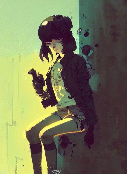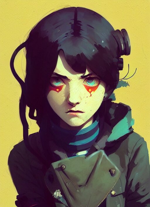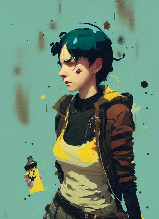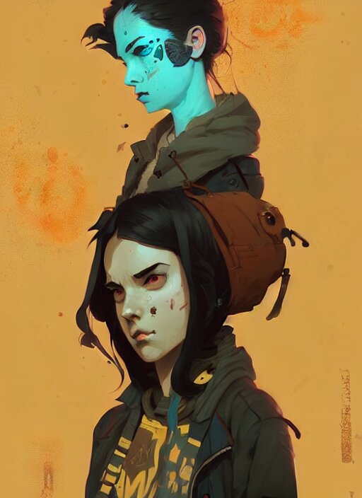 Highly detailed portrait of a moody sewerpunk young adult lady by atey ghailan, by greg rutkowski, by greg, tocchini, by james gilleard, by joe fenton, by kaethe butcher, gradient yellow, black, brown and cyan color scheme, grunge aesthetic!!! ( ( graffiti tag city background ) )