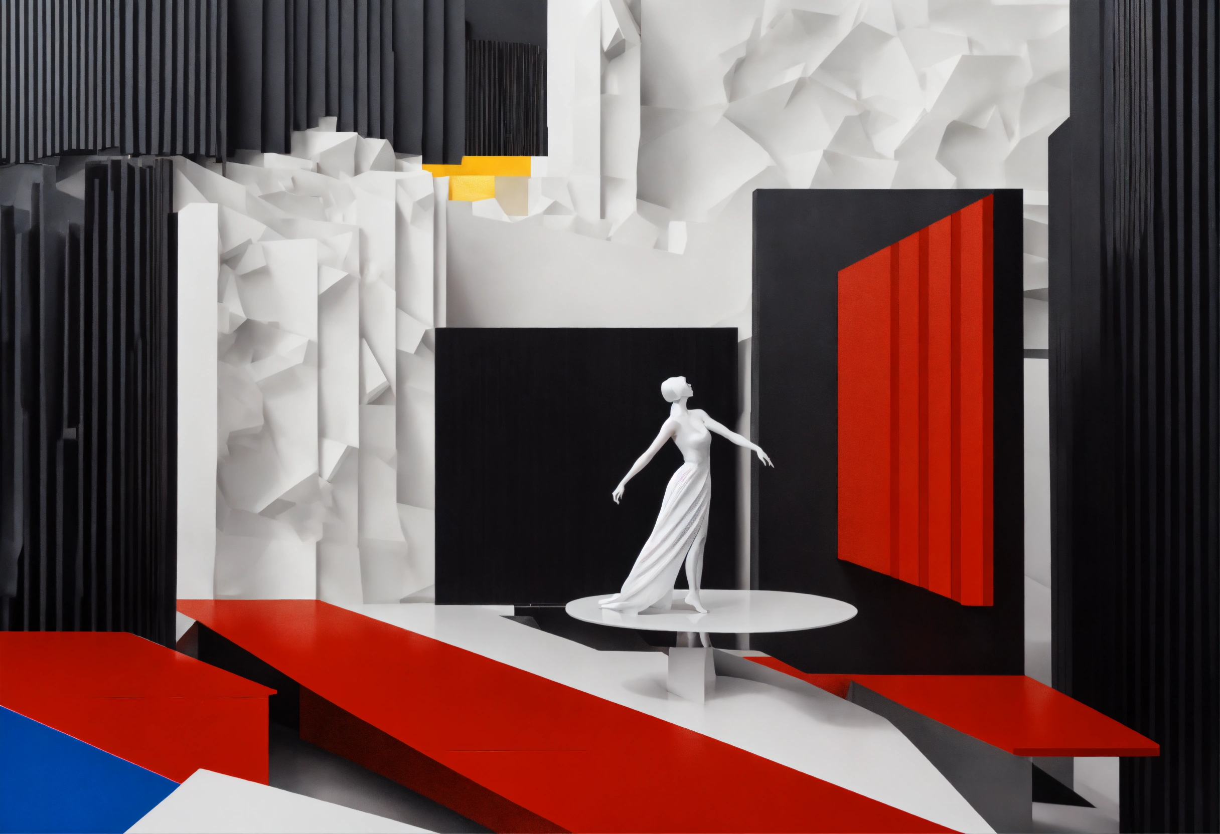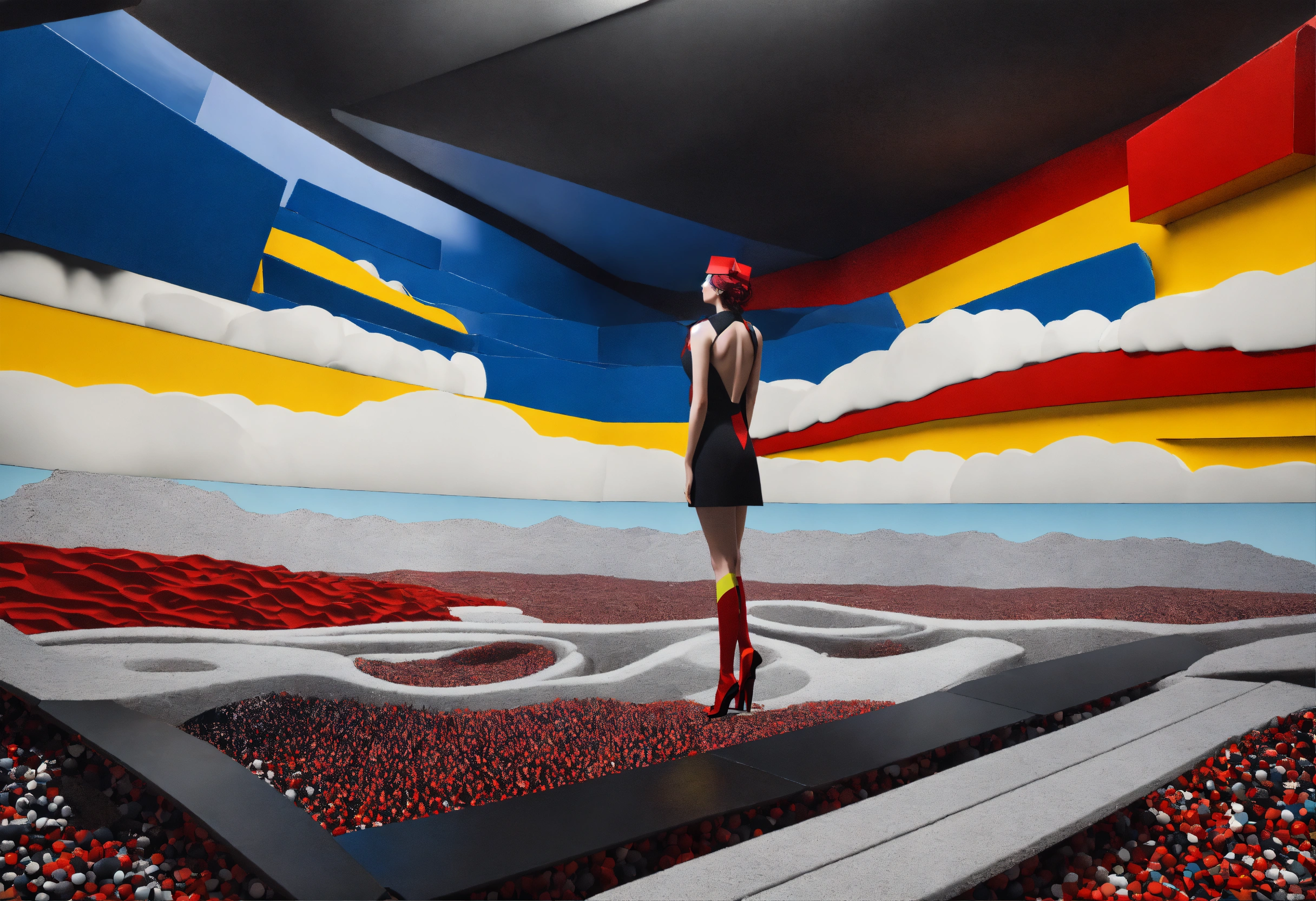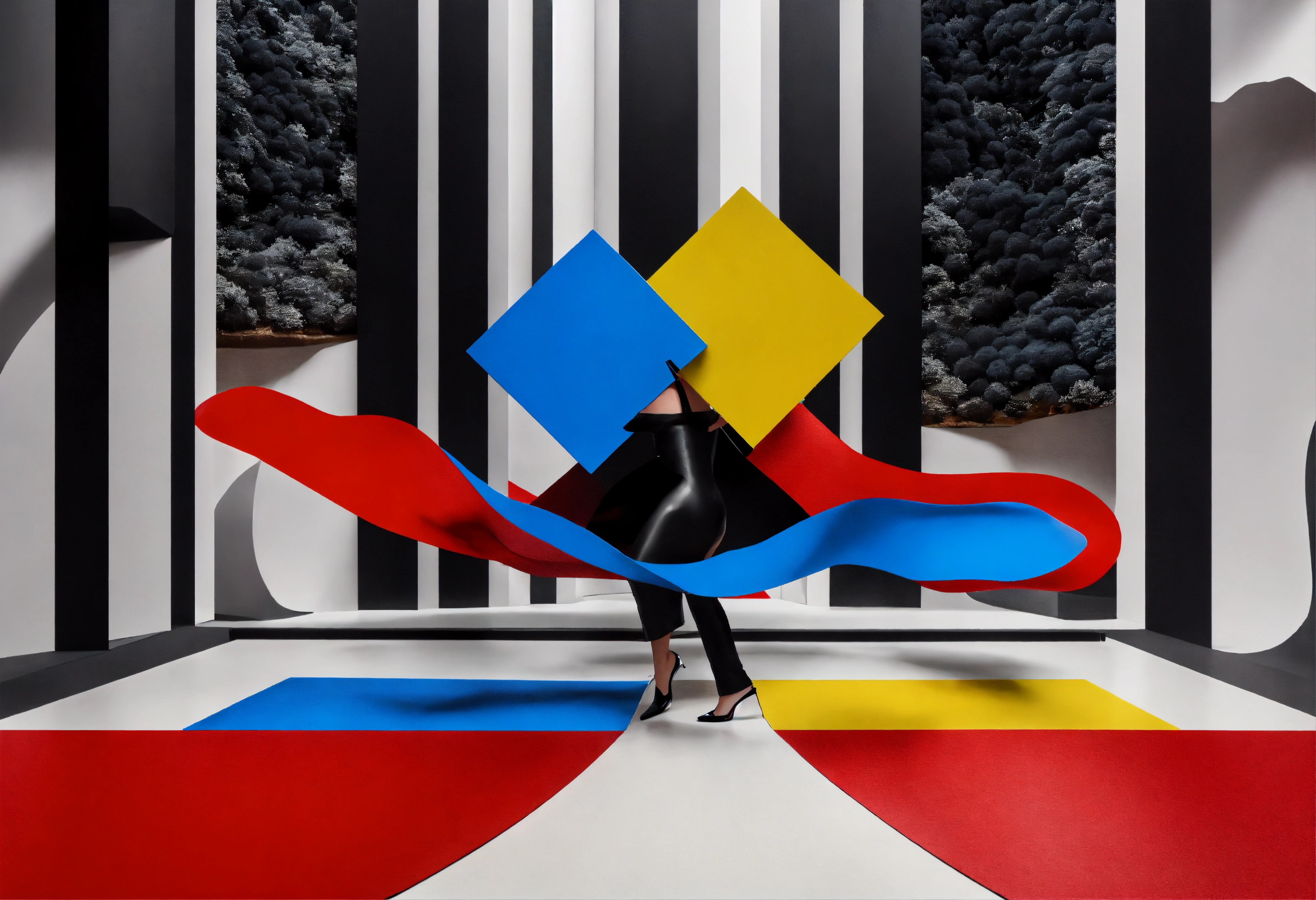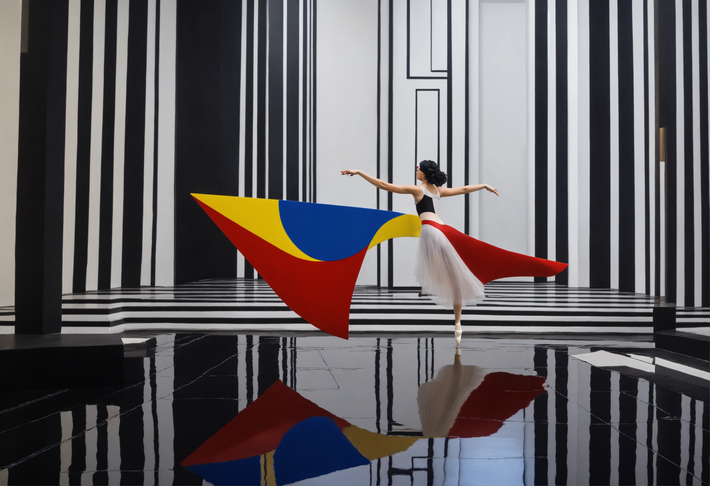 Black and white, primary colors, 3d abstract landscape, close up view of dancer, immersive-inspired art deco, inside and out landscape, rene magritte inspiration.