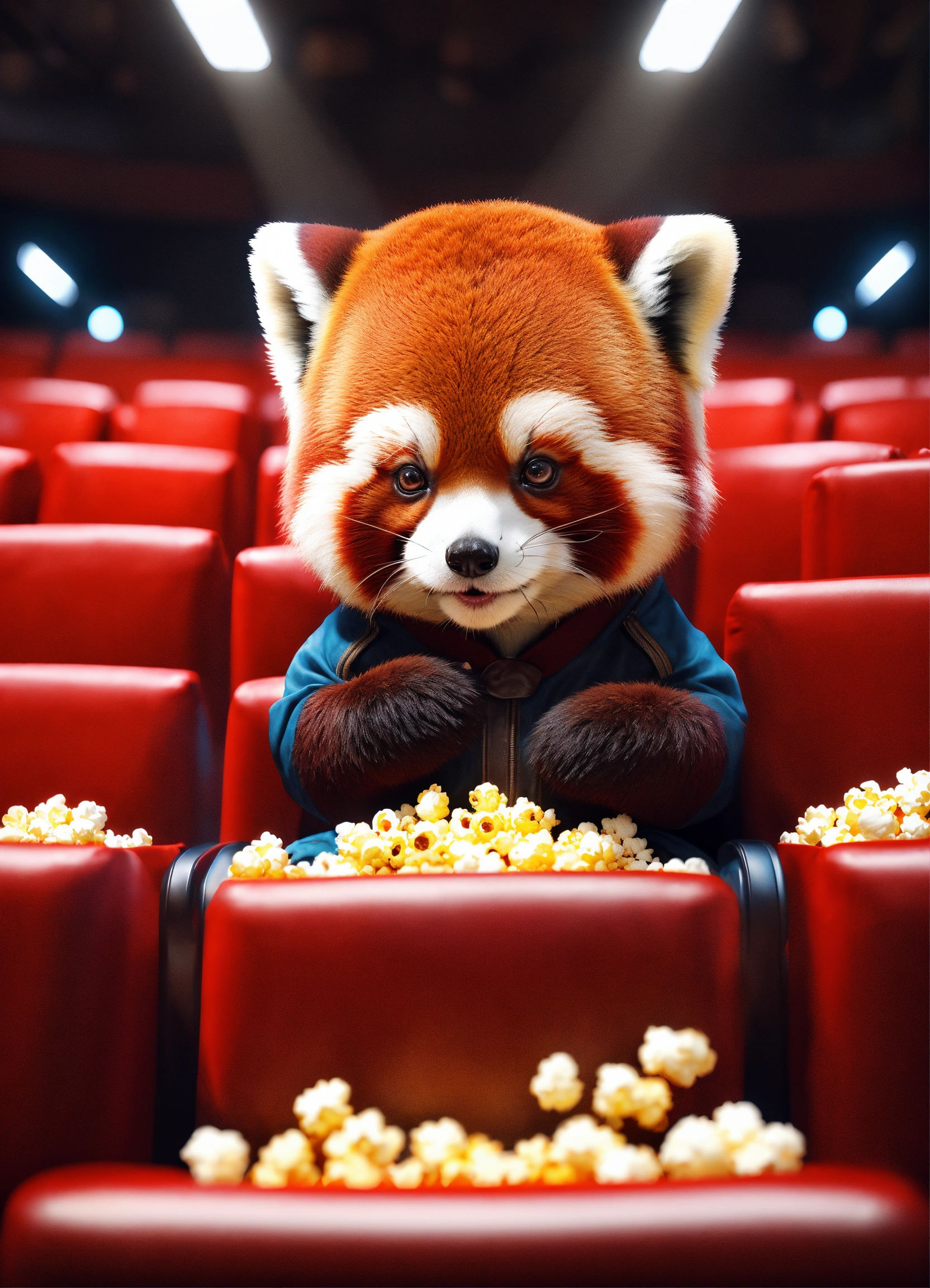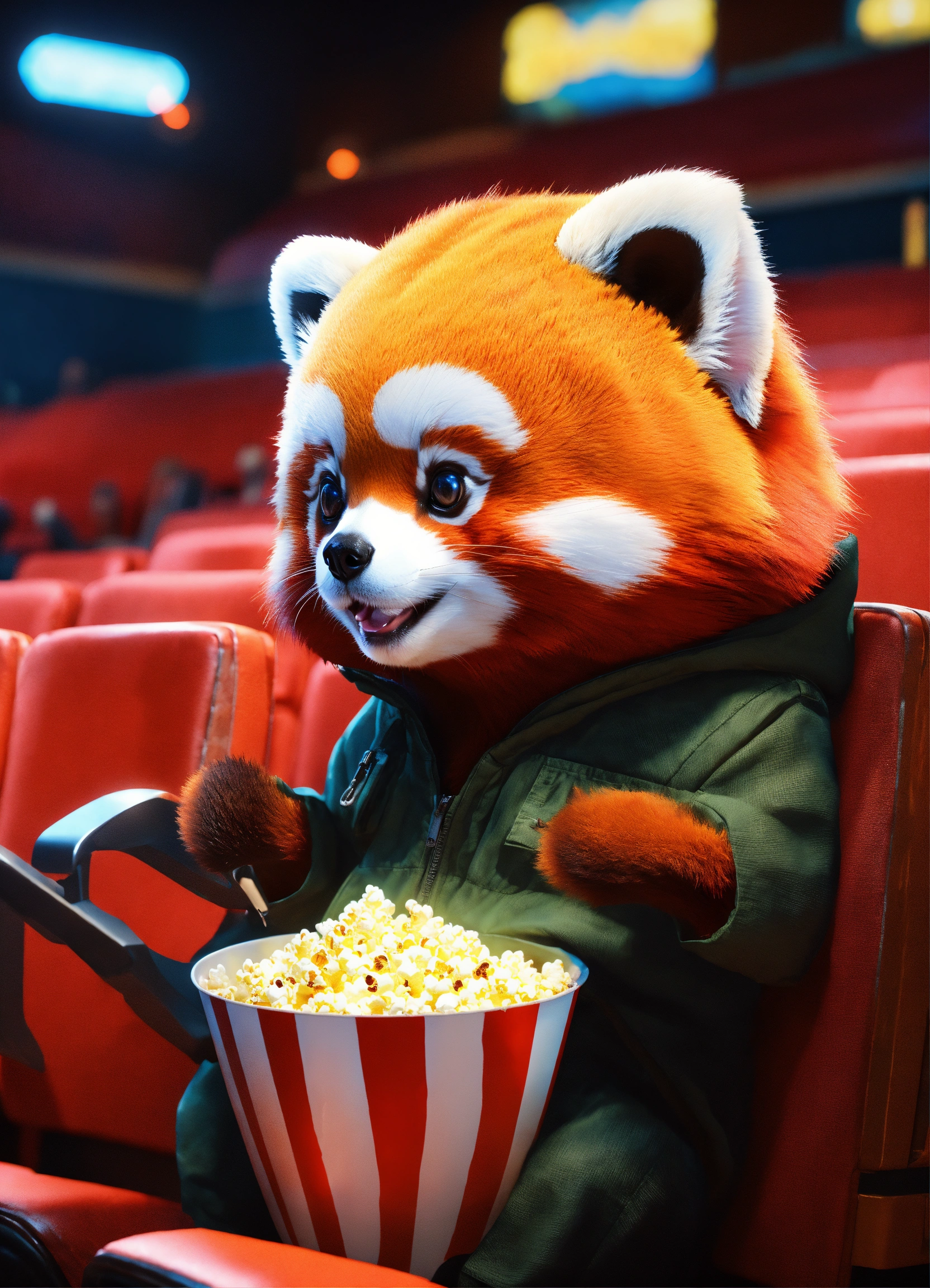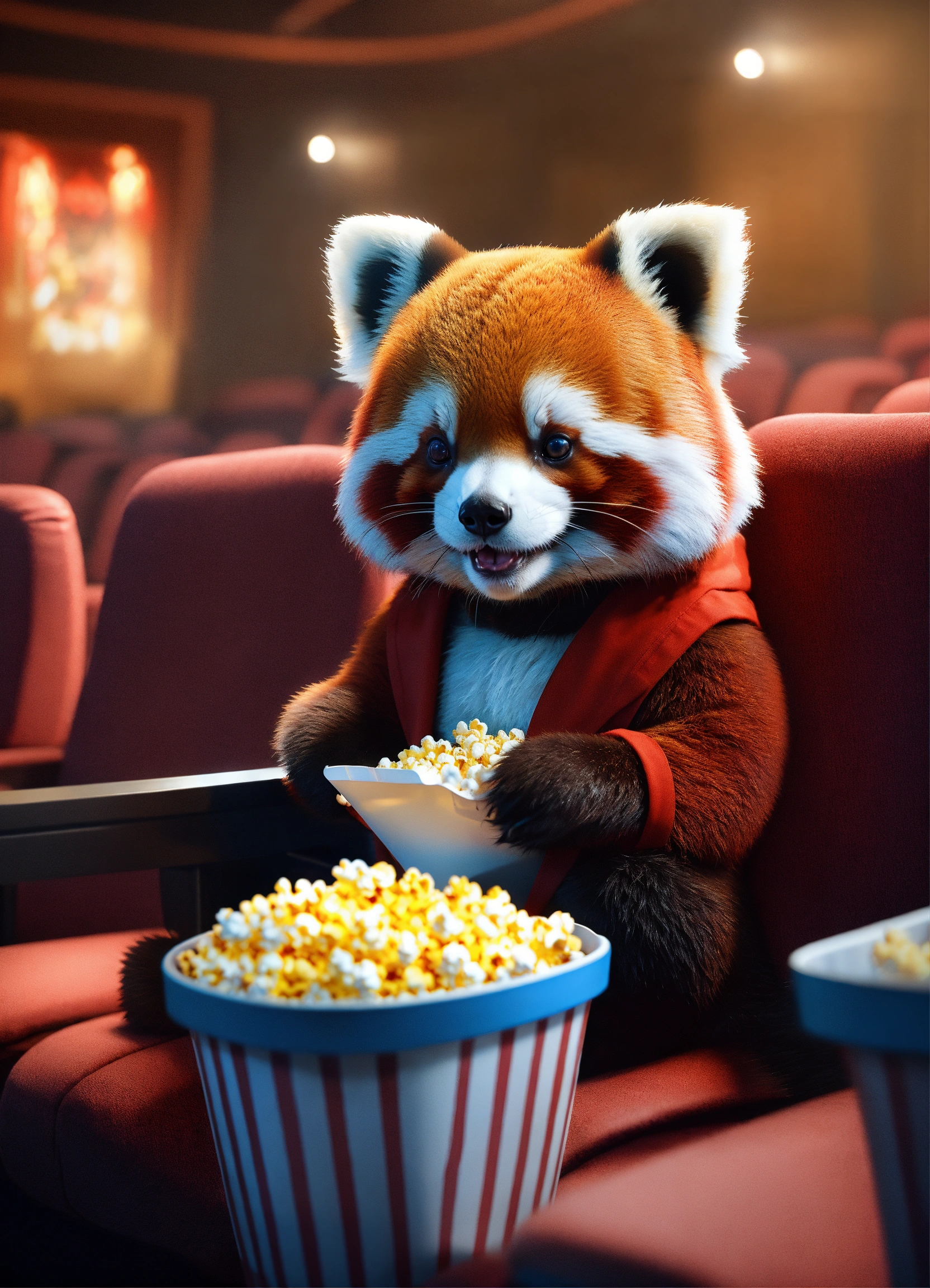 Cute small humanoid red panda sitting in a movie theater eating popcorn watching a movie, unreal engine, volumetric, warm indoor lighting, artstation, detailed, digital painting, cinematic, character design by hayao miyazaki, unreal 5, daz, hyperrealistic, octane renderer, arnold renderer, 8k, matte
