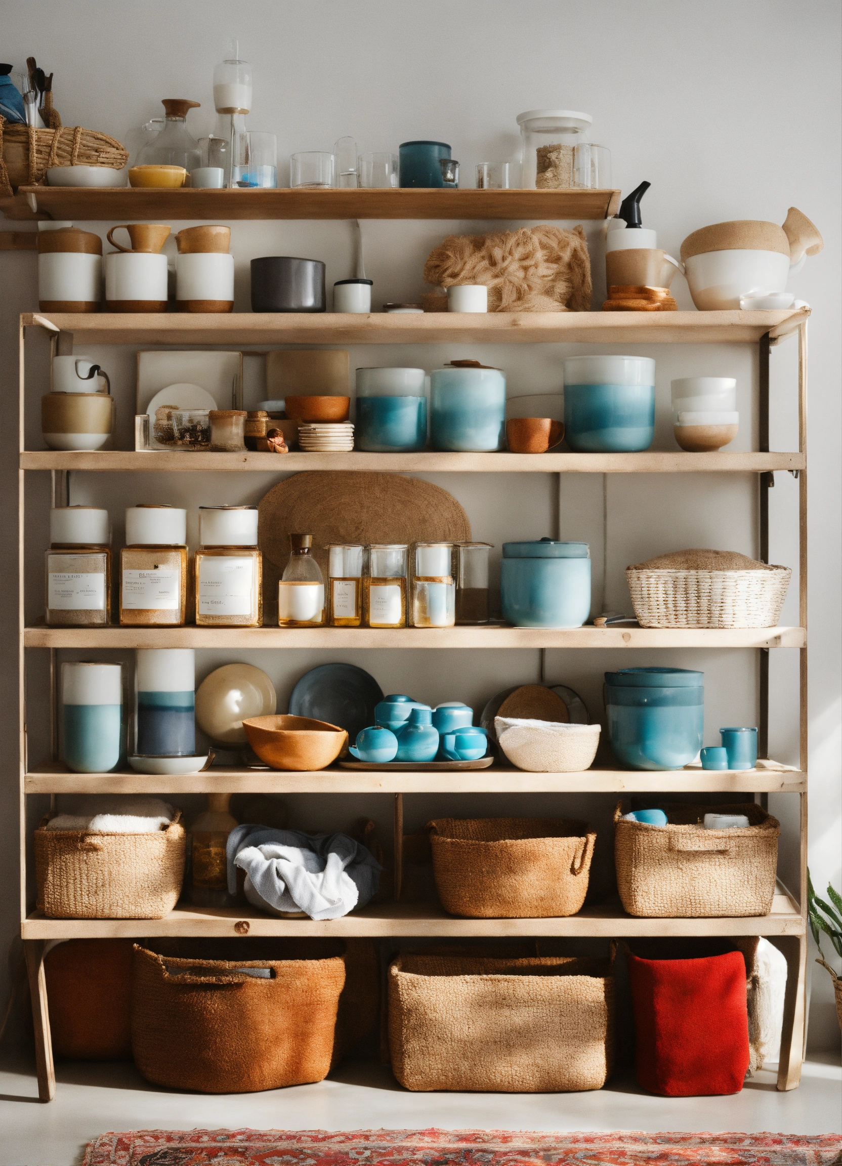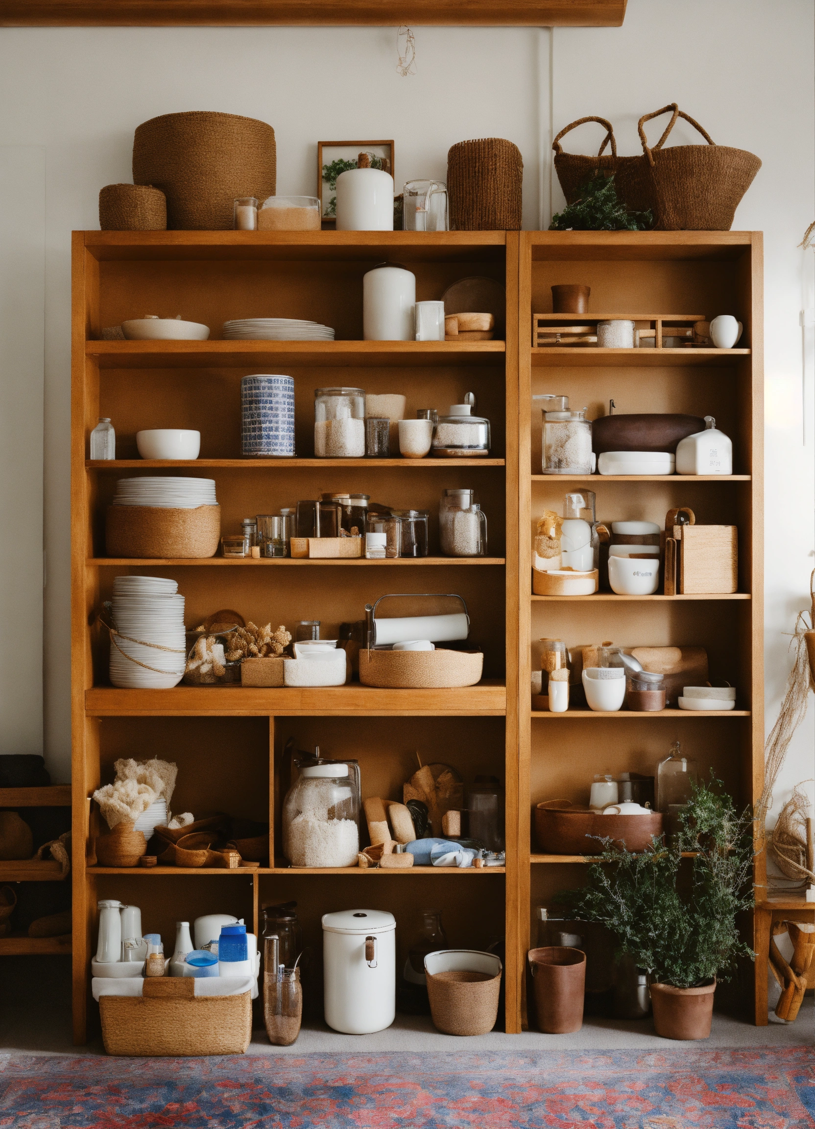 A photo of a wide selection of household items, the items are neatly organized on shelves, the background is a white wall