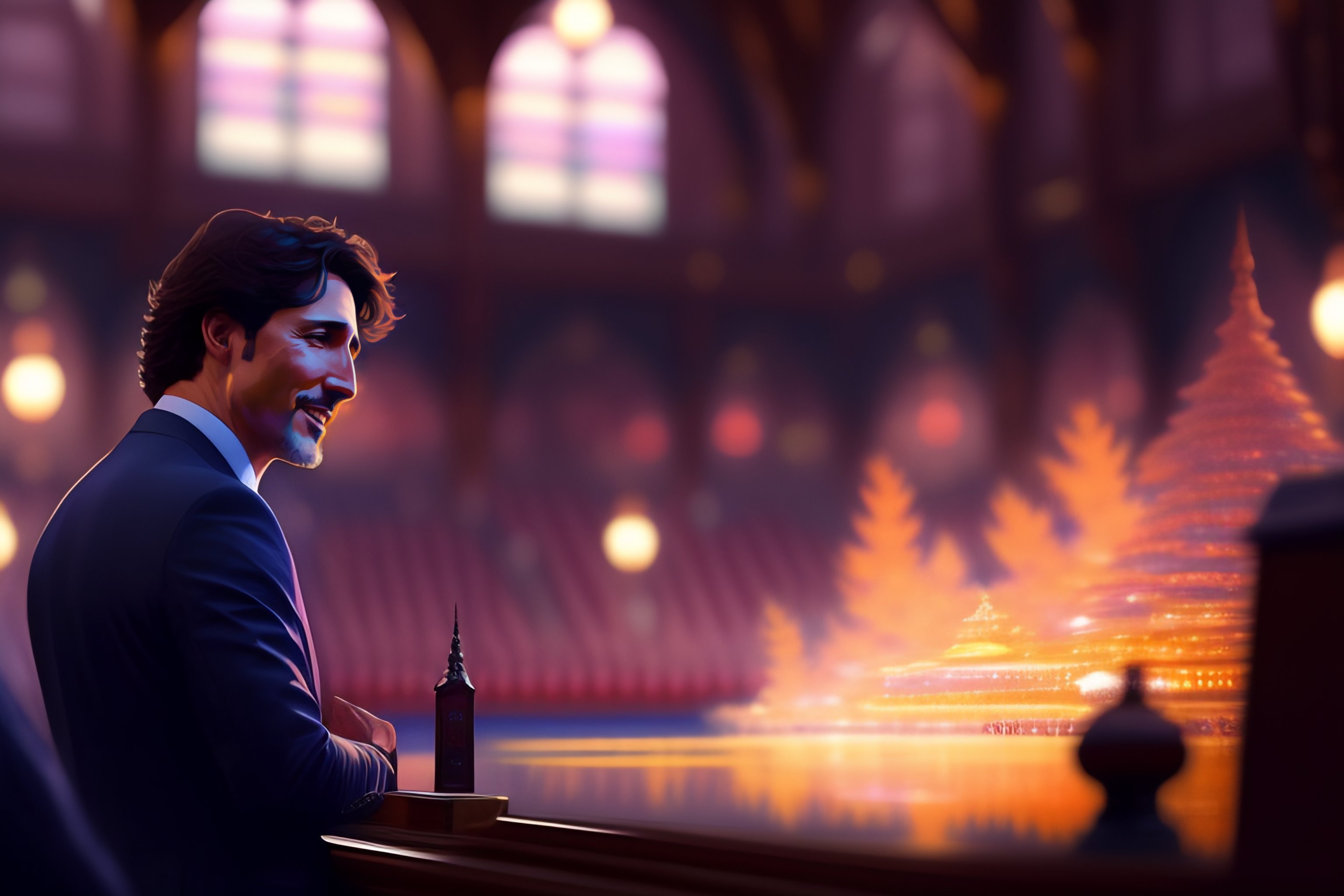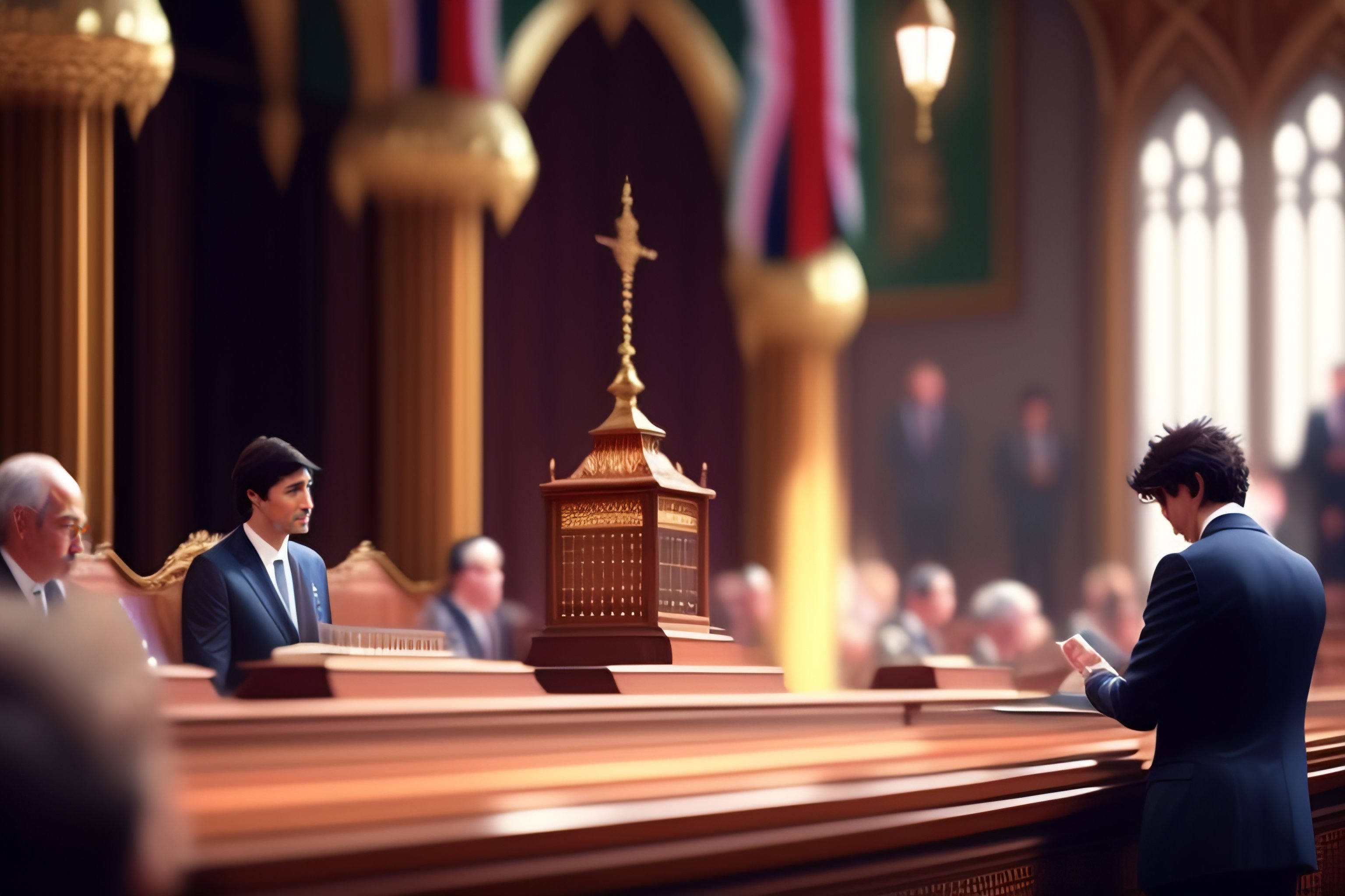 Justin trudeau making an apology speech in the house of commons, main focus facing forward, psychedelic, patterns, art by wlop, greg rutkowski makoto shinkai kyoto animation key art feminine mid shot