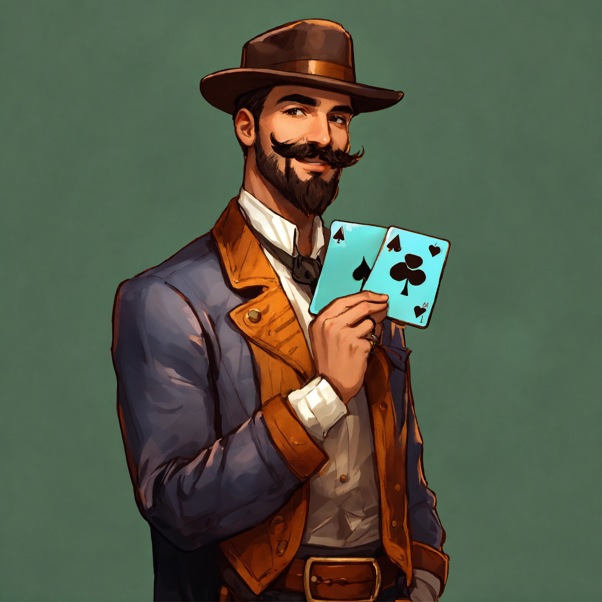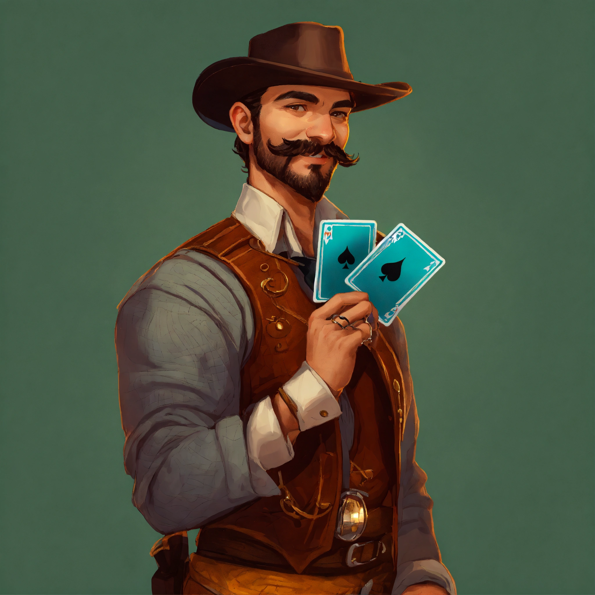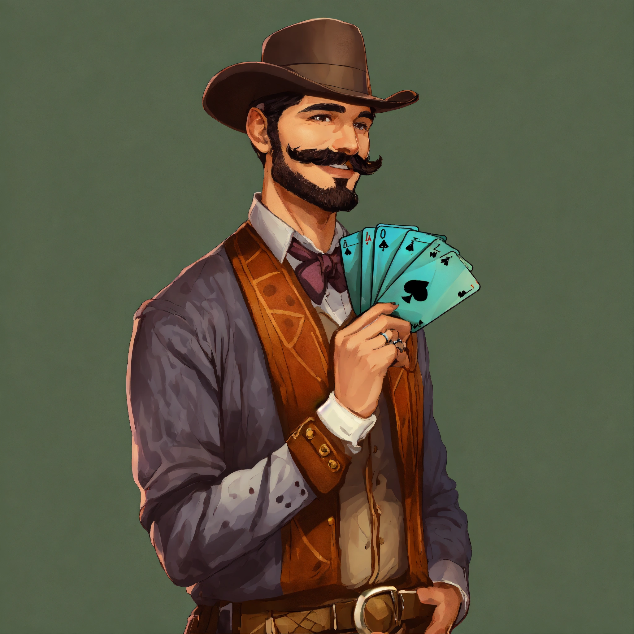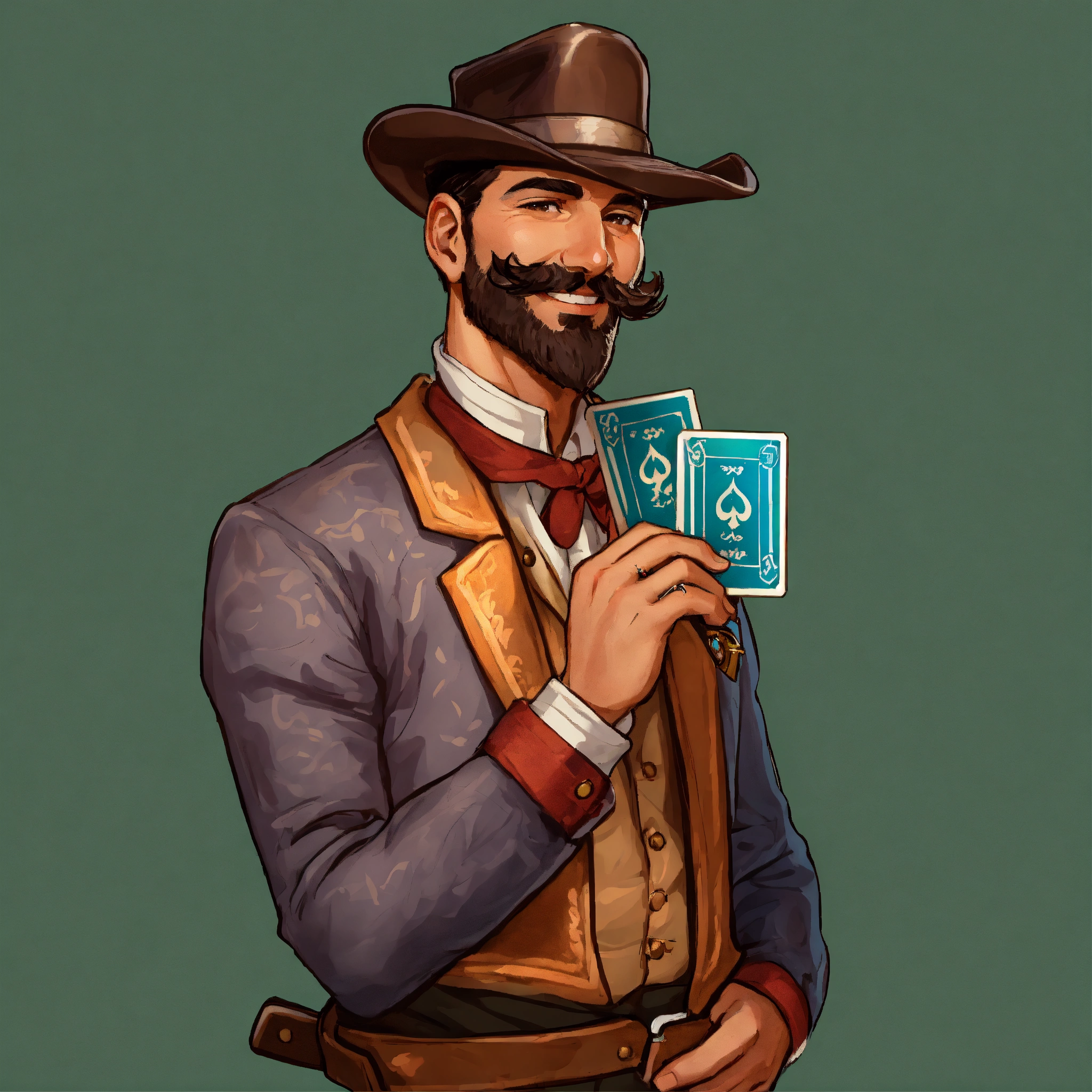 Rich smiling brown eyed western man with a small beard and mustache and a bowler hat on his head, with rings on his hands, holding 2 poker cards in his hand - 2d and hand drawn game, realism, western theme, colorful