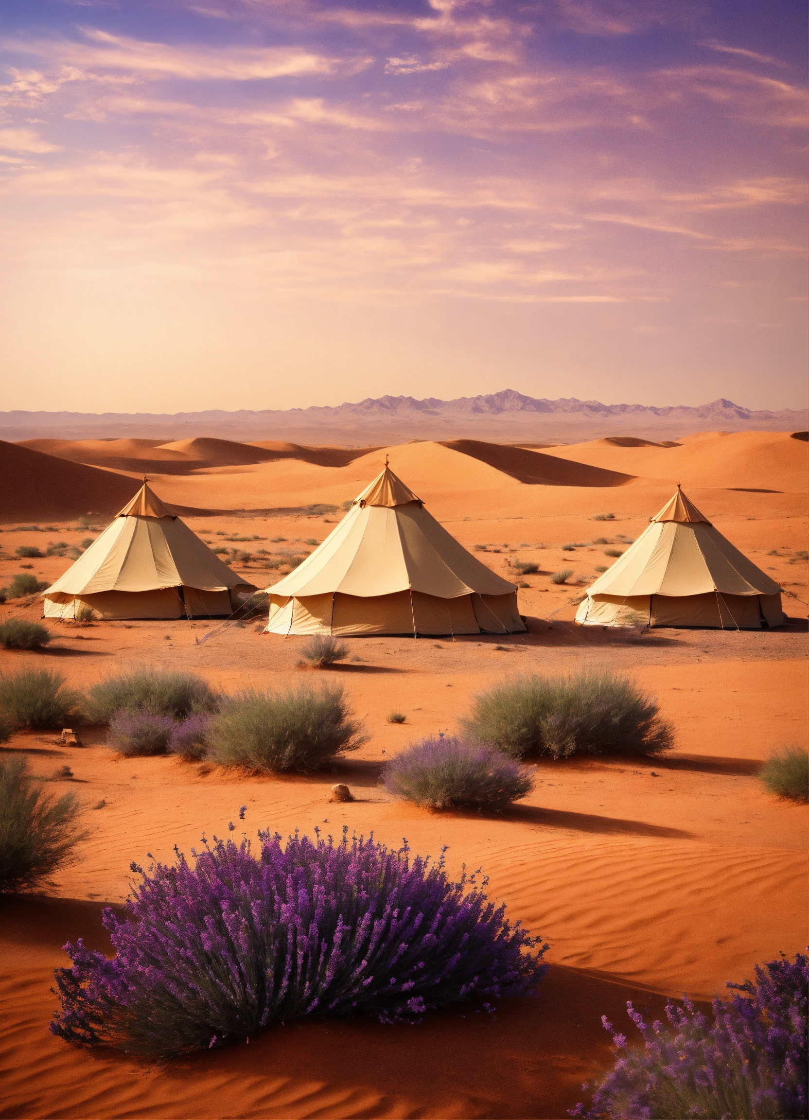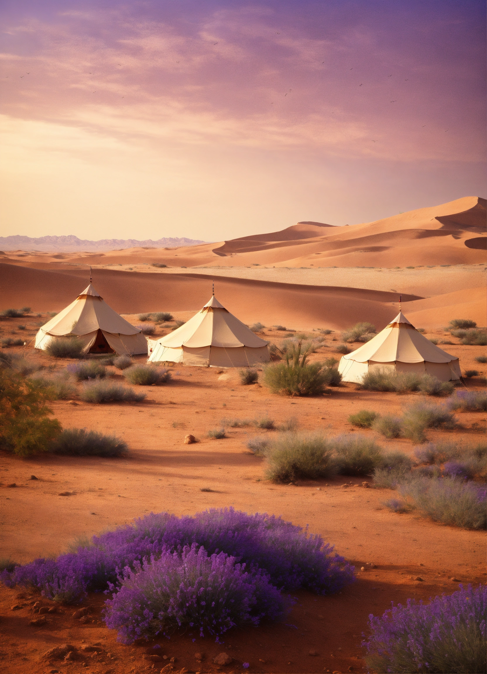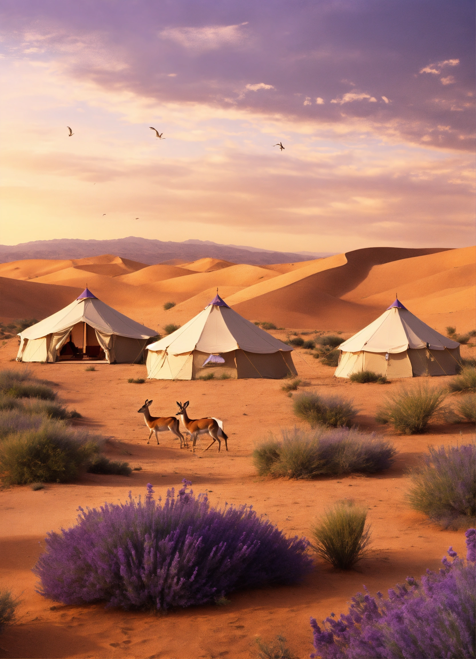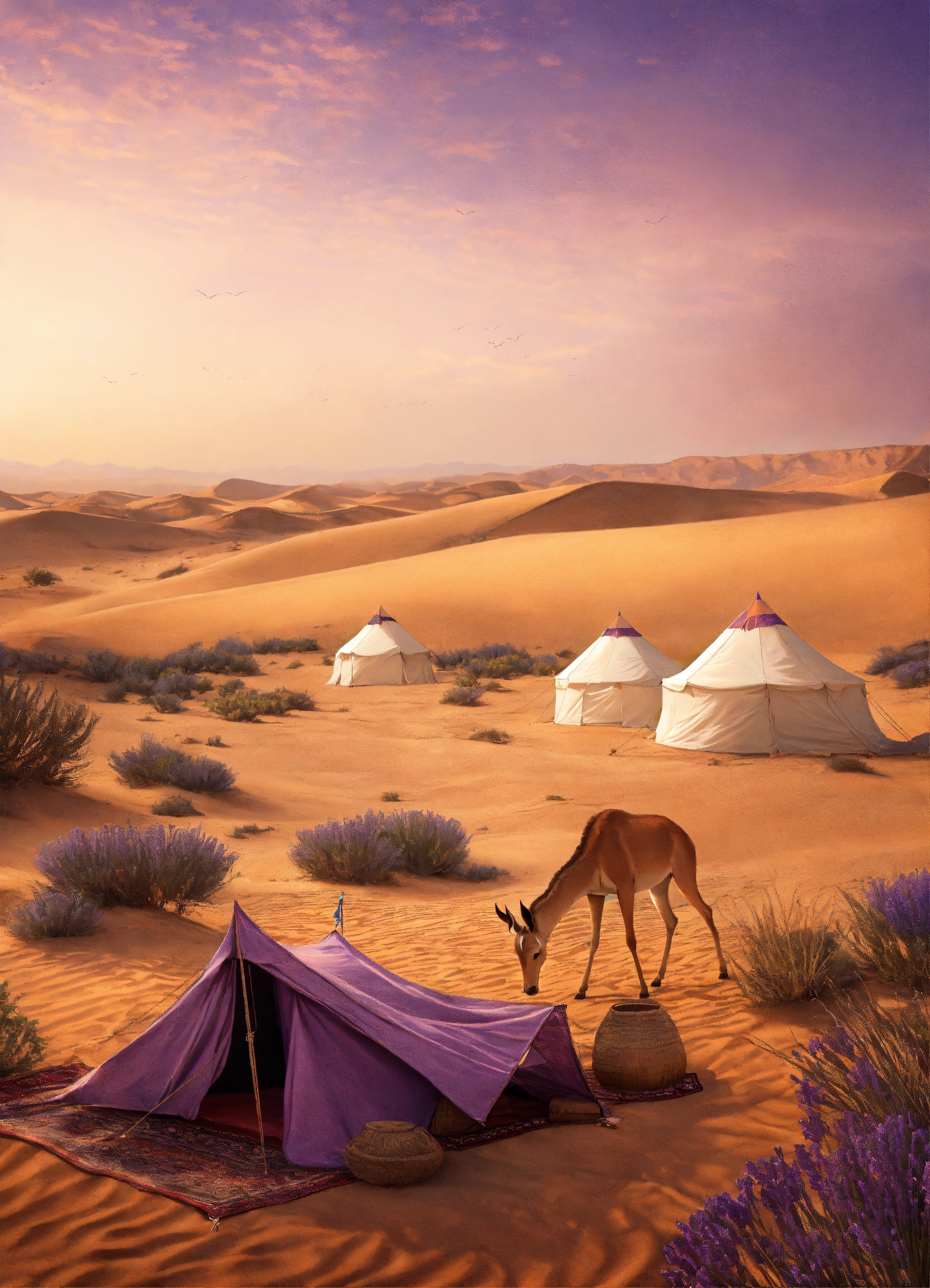 A desert background with some grasses in the spring season, with some lavender flowers in with female arabian antelope and two arab two tents from verse appear in the distance