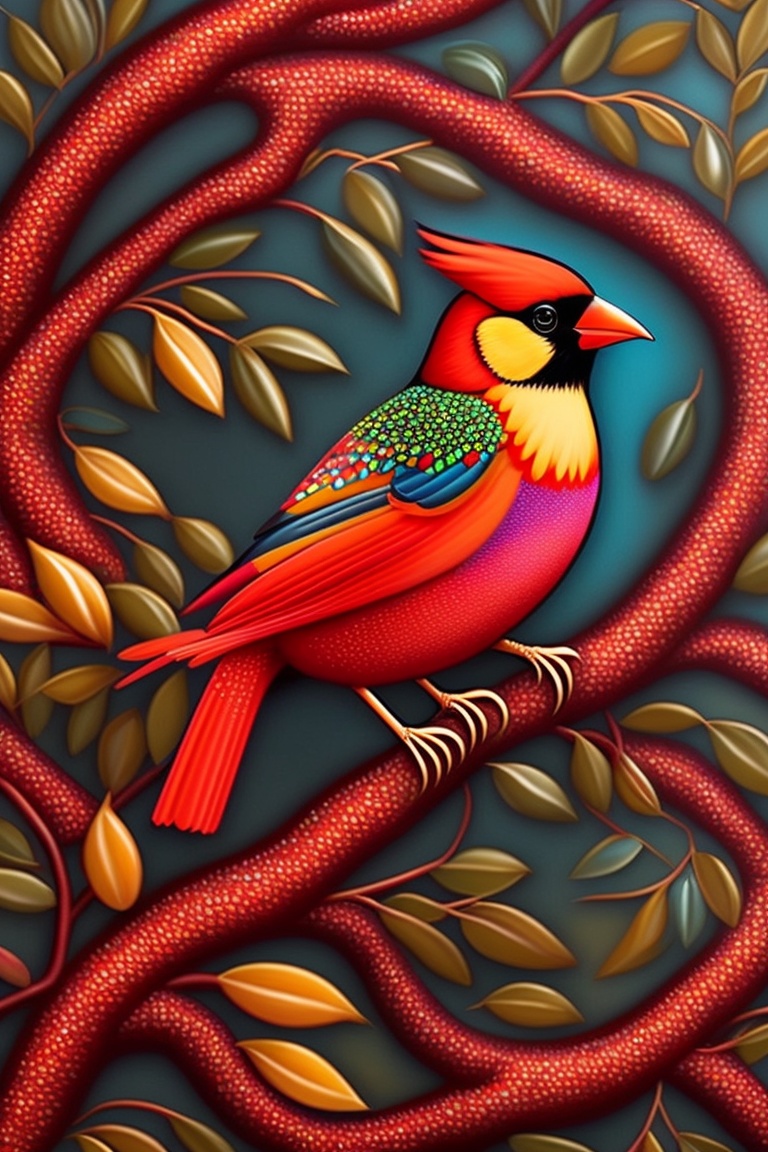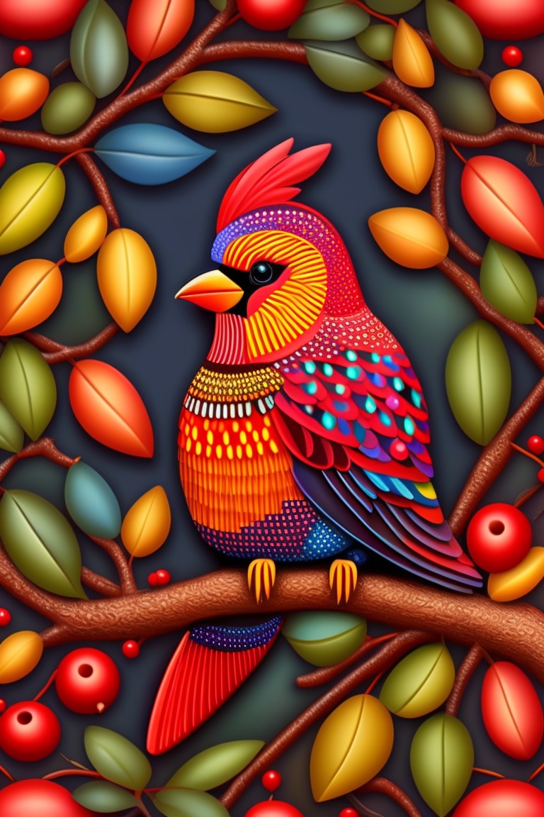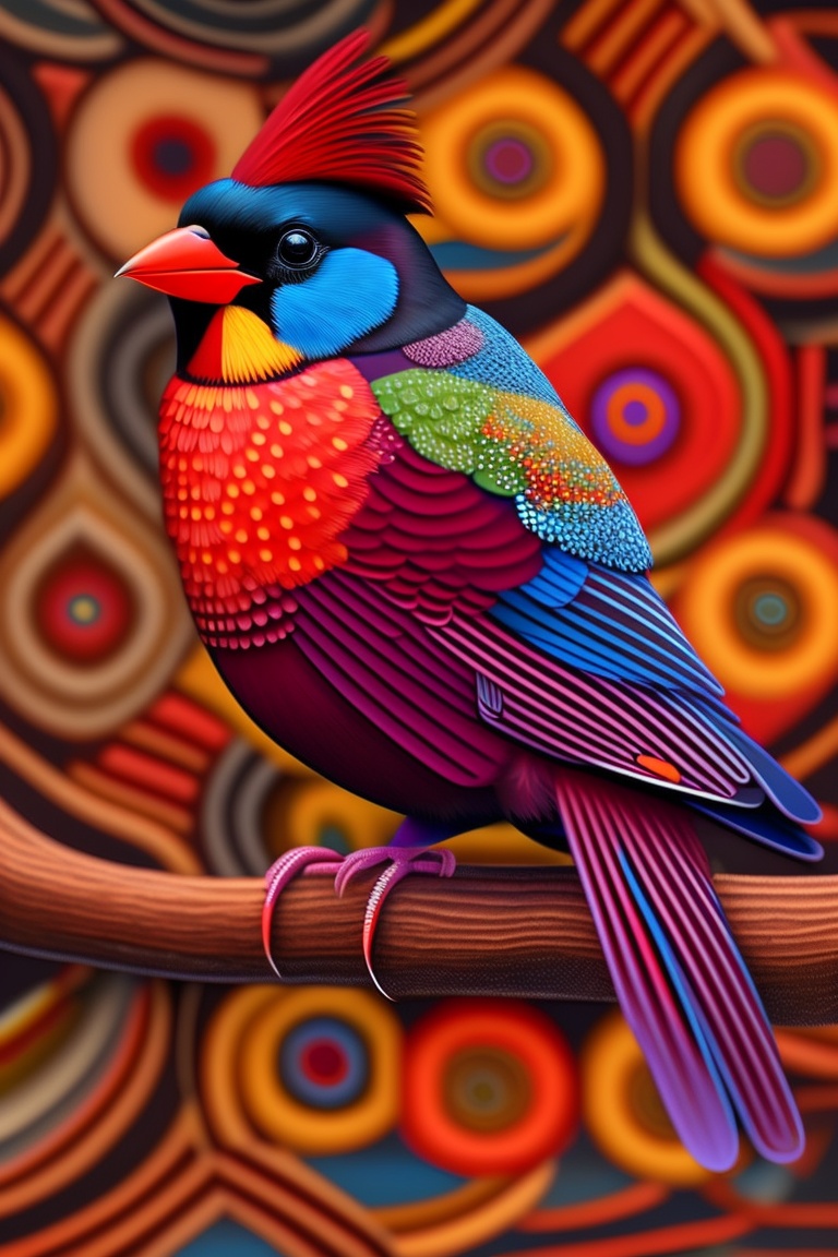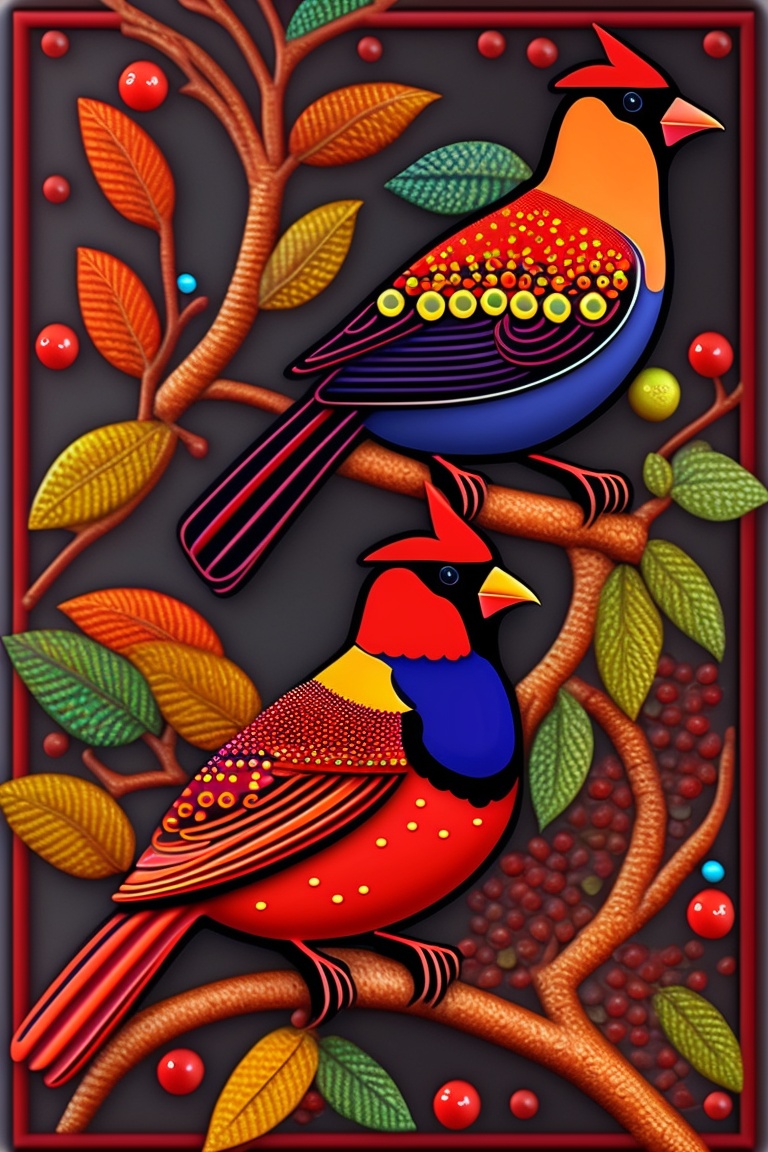 **aboriginal dot art 2 cardinal birds sitting on a tree branch very bright colors, complex pattern, highly detailed