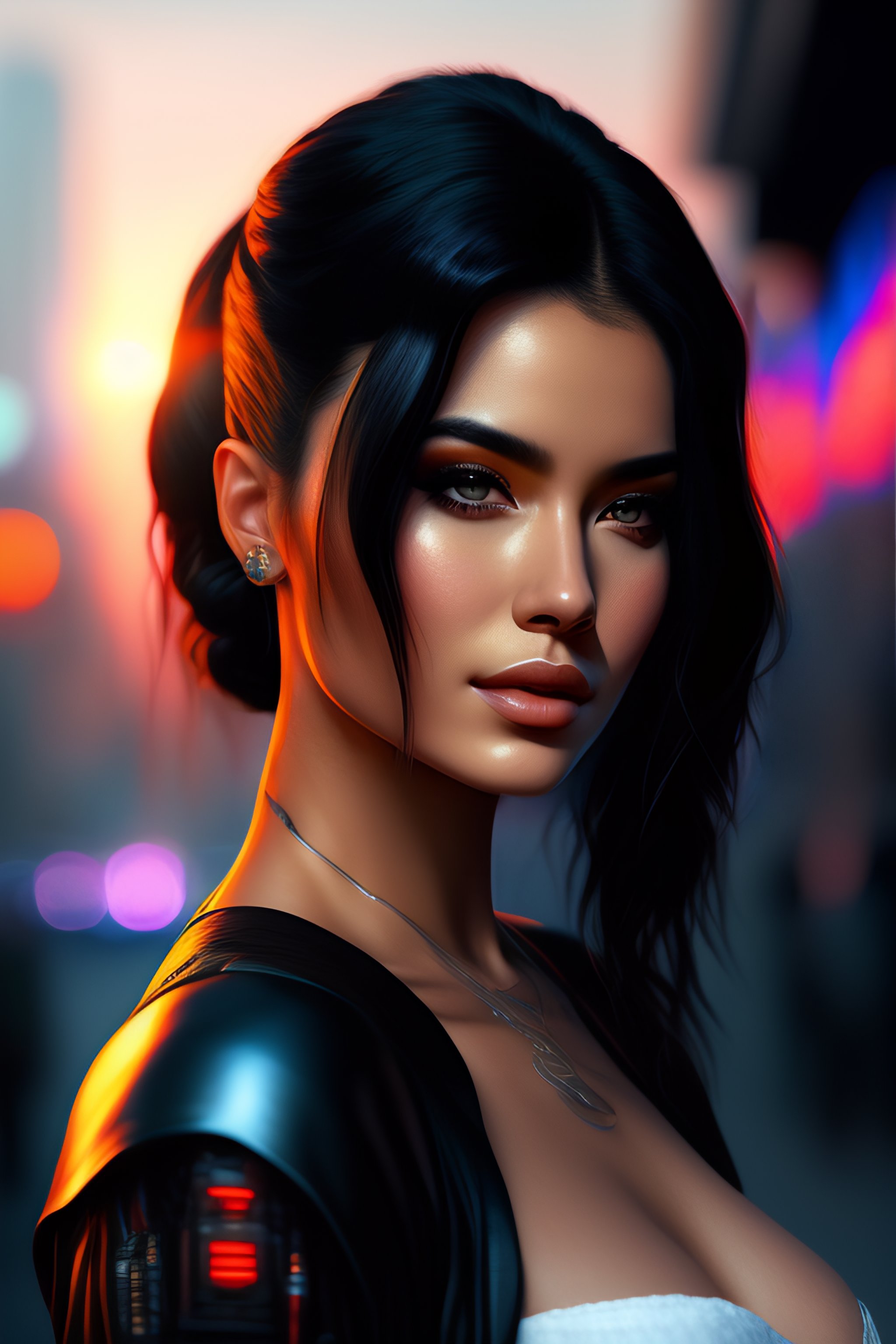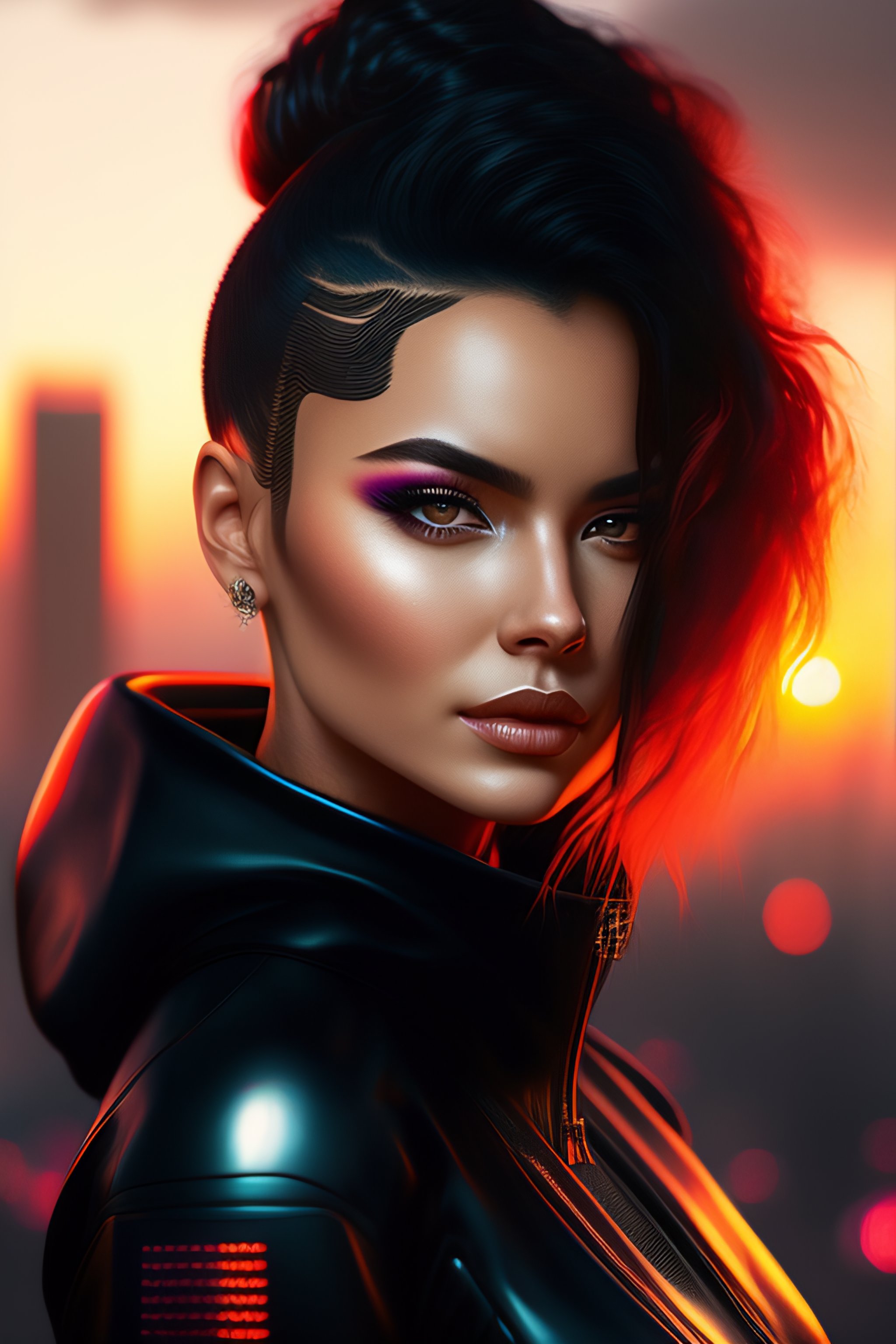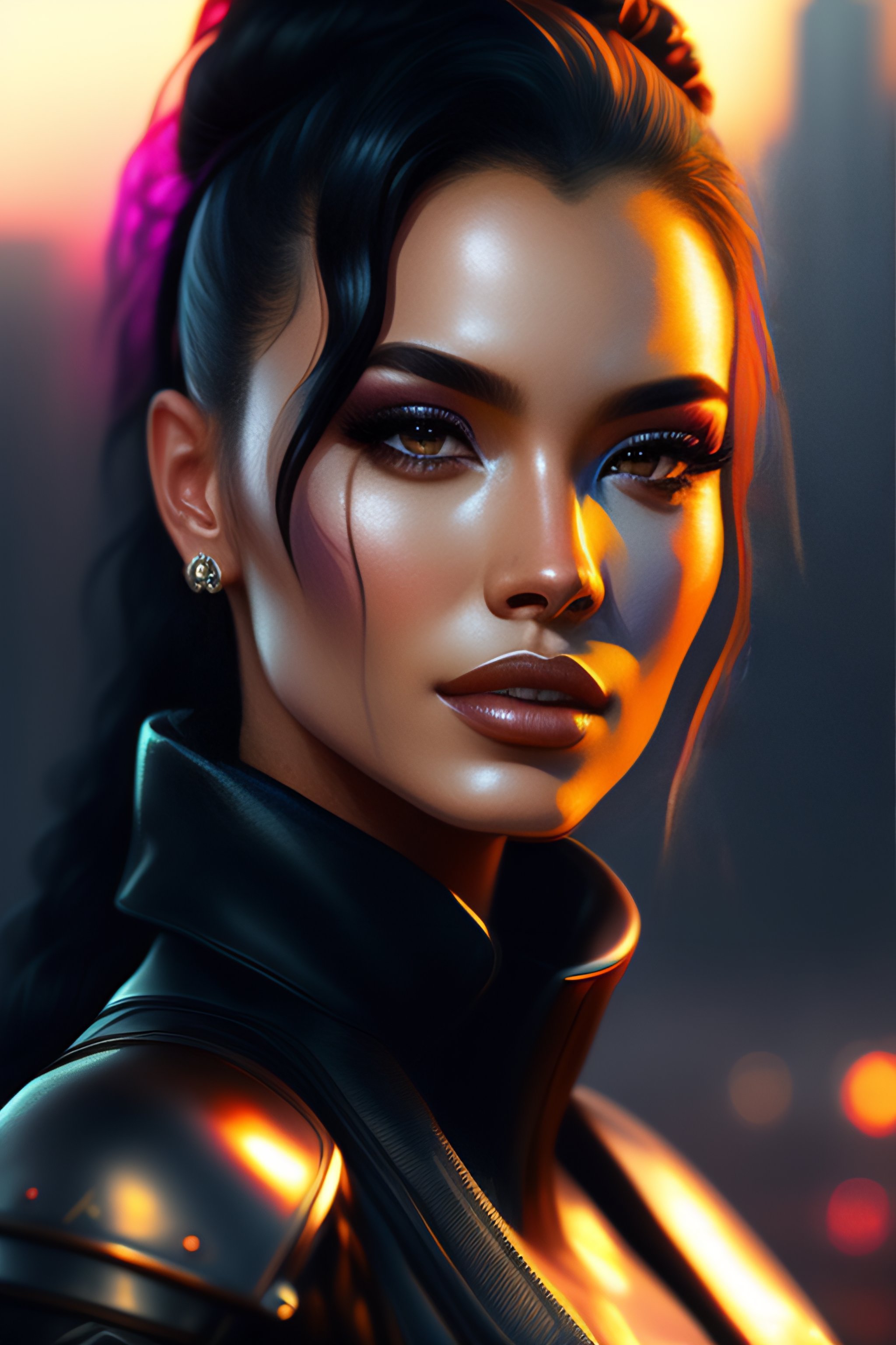 Closeup portrait of a young beautiful cyberpunk woman, mirror eye implants, black hair in a rough bun, sunset, neuromancer, street samurai, cyberpunk city background, megacity, gorgeous view, depth, painted by seb mckinnon, high detail, digital art, black sexy dress, blonde, painted by greg rutkowski, trending on artstation
