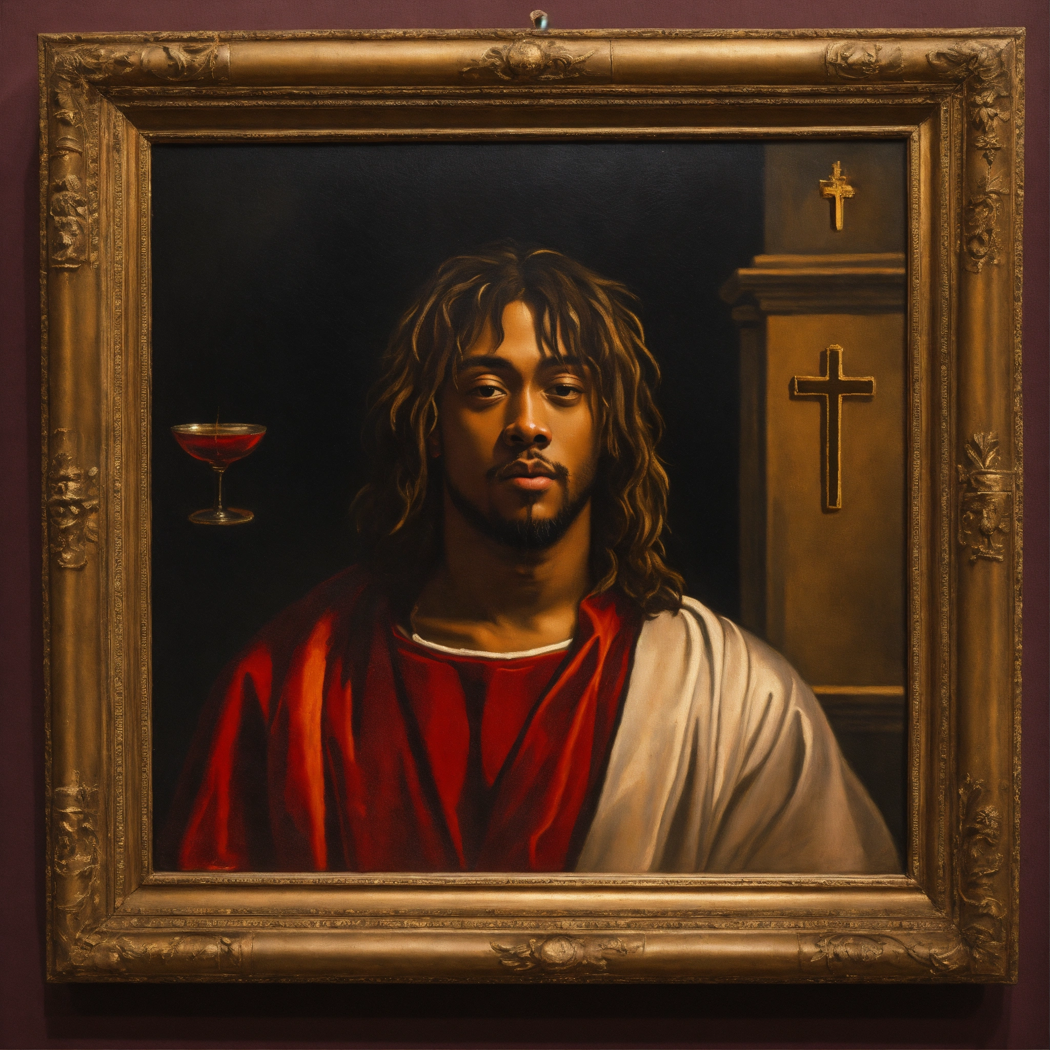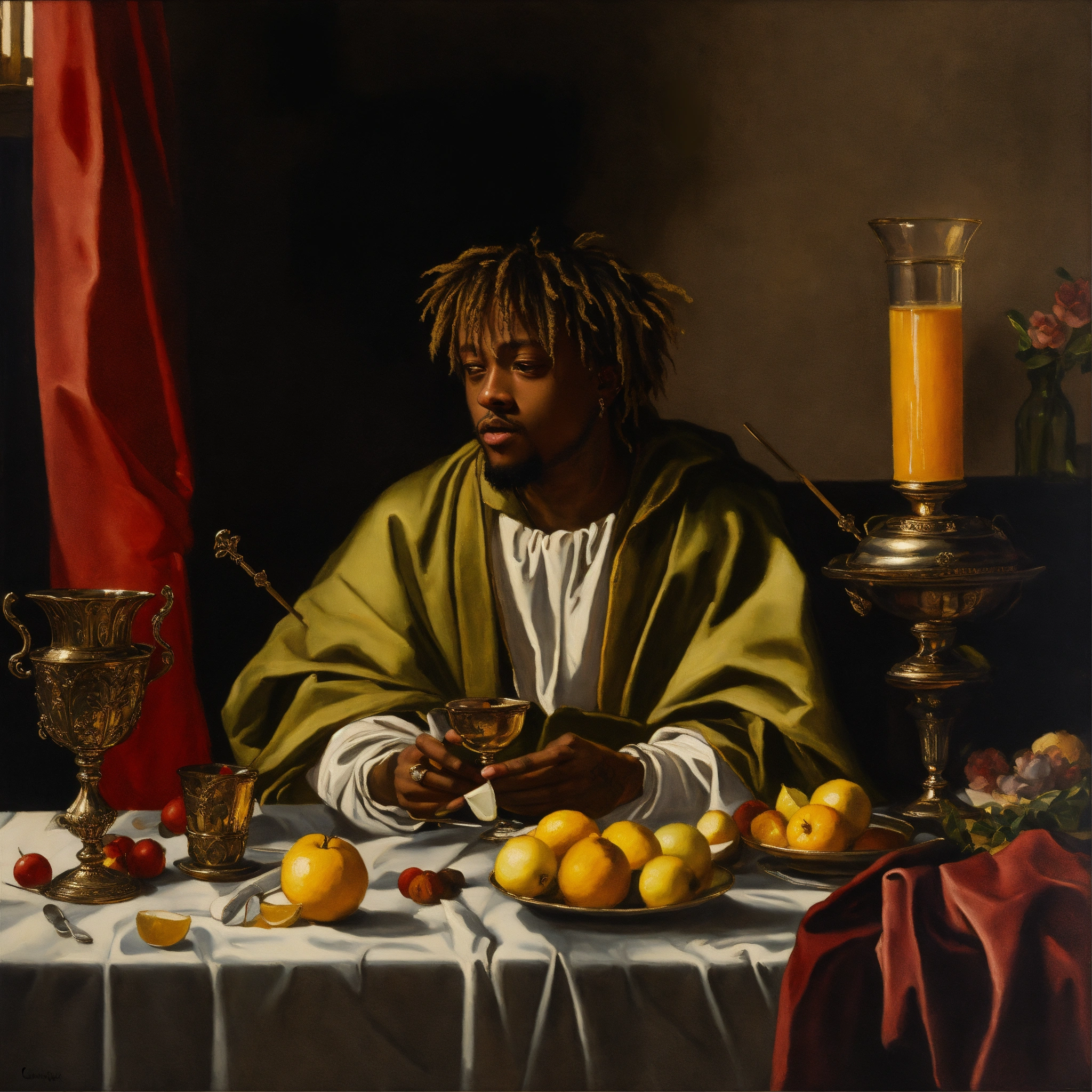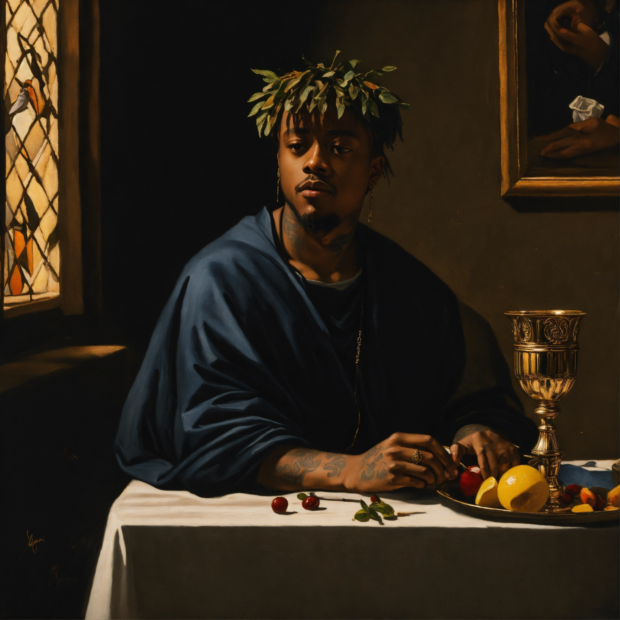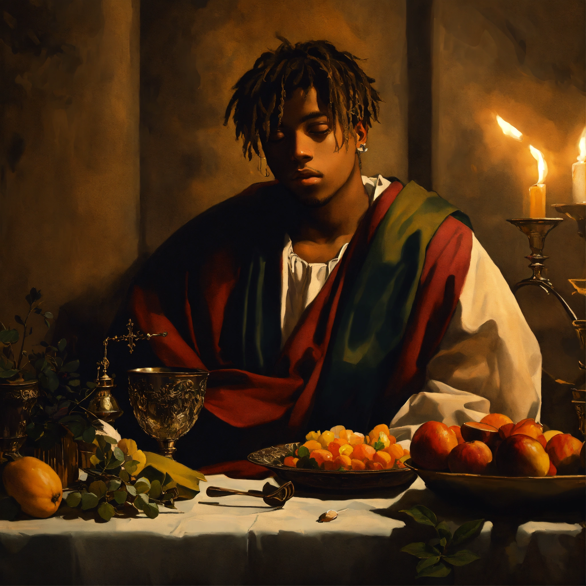 Juice wrld, in the style of caravaggio, in the style of the supper at emmaus, photorealistic additional notes focus on juice wrld's face, making sure to capture his unique features and expression. use caravaggio's signature chiaroscuro lighting to create a dramatic and atmospheric effect. pay attention to the details of juice wrld's clothing and accessories, as well as the setting of the painting. optional add other elements of christian iconography to the painting, such as a chalice, a cross, or a dove. include other figures in the painting, such as jesus christ or his disciples. set the painting in a different location, such as a church, a tavern, or a forest.