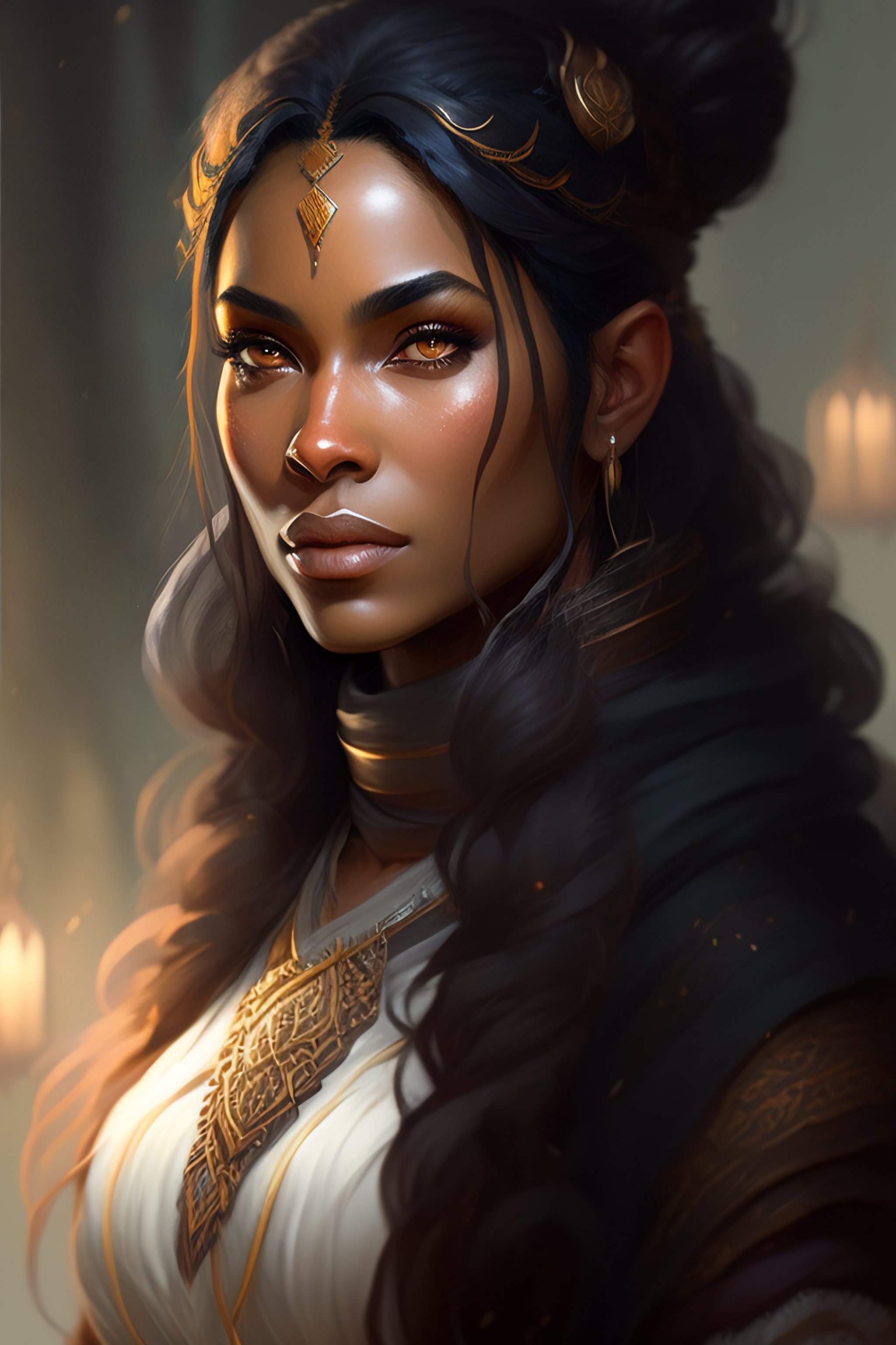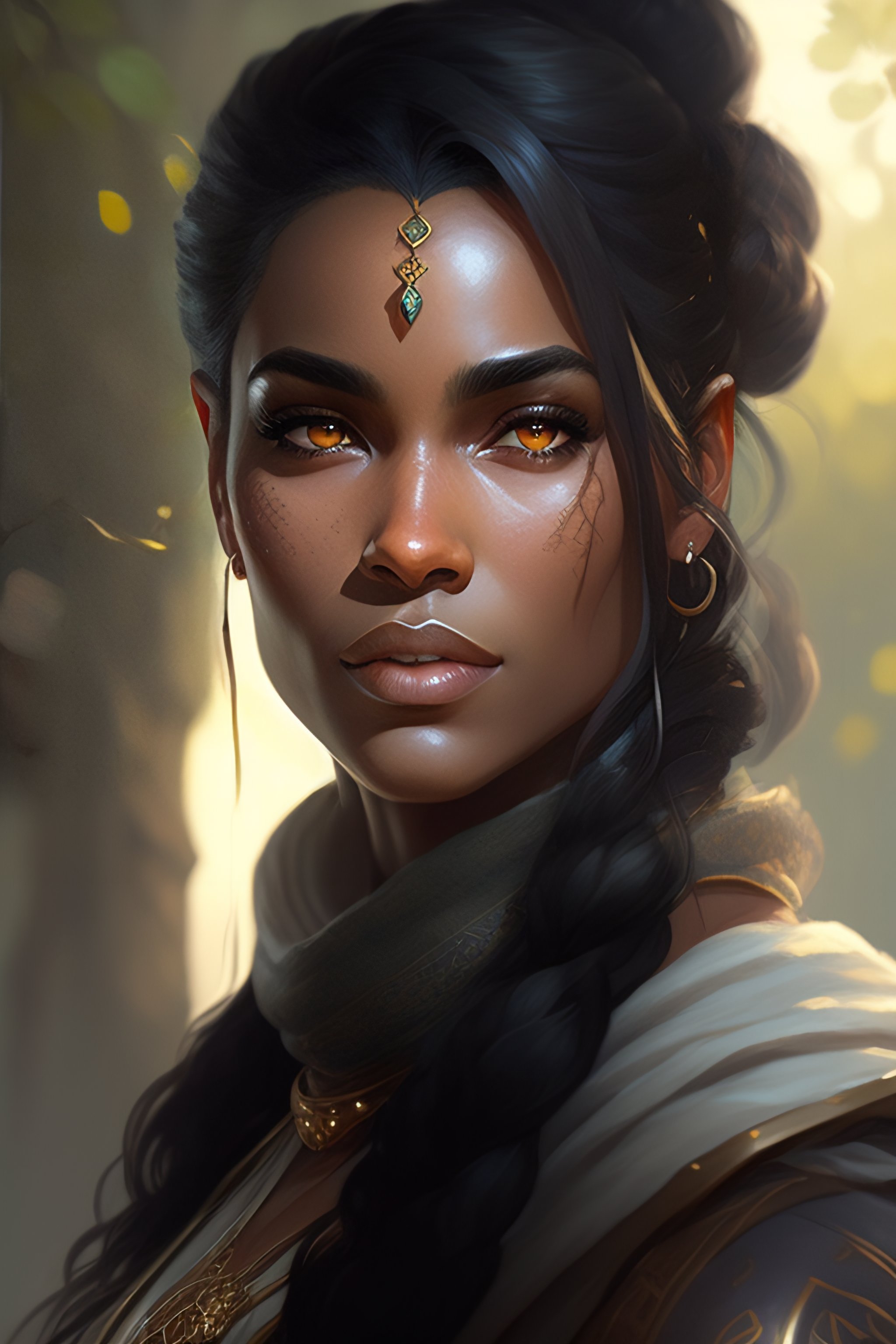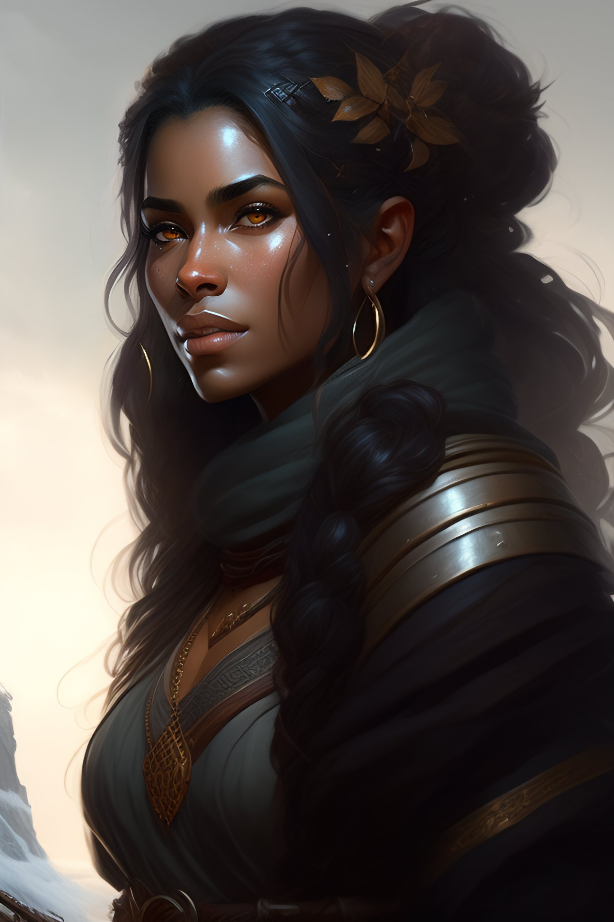 A female dwarf, druid, dark gray hair, brown skin, florest, realistic, intricat, concept art, by greg rutkowski