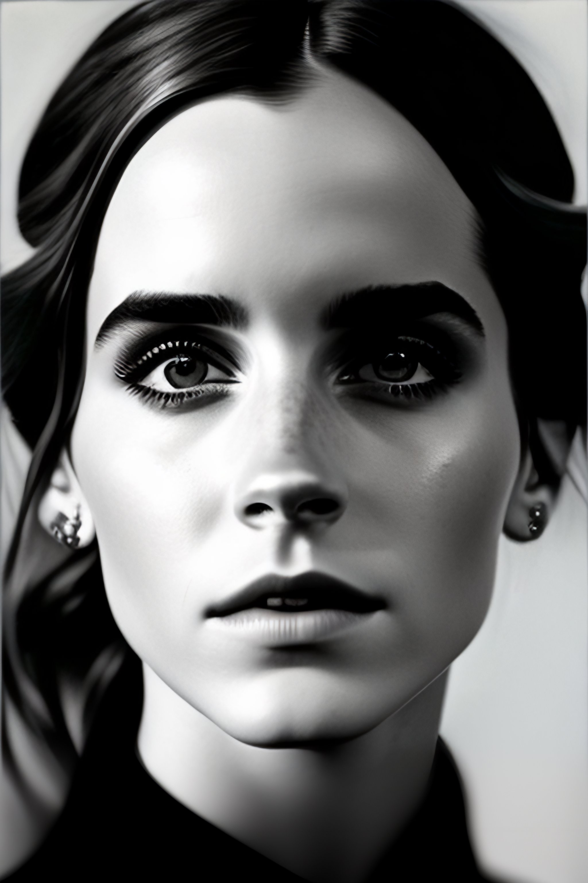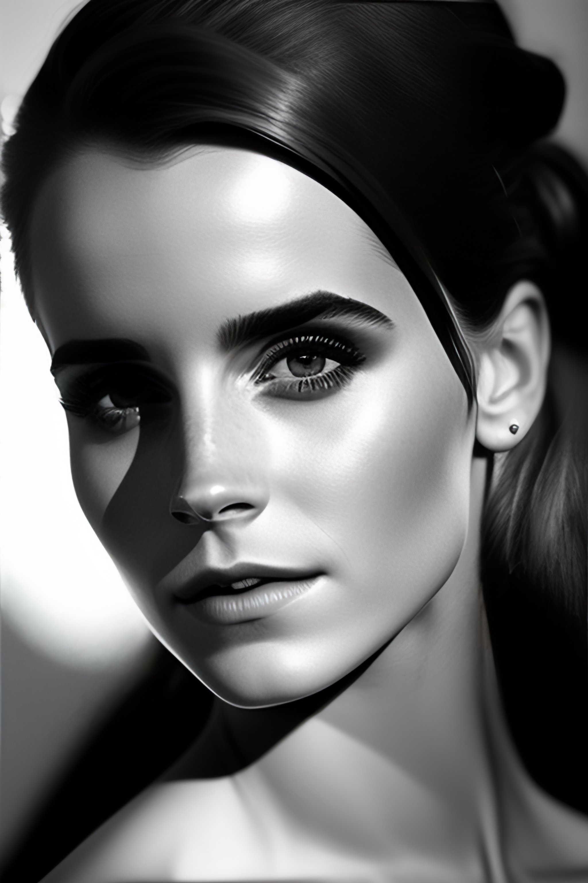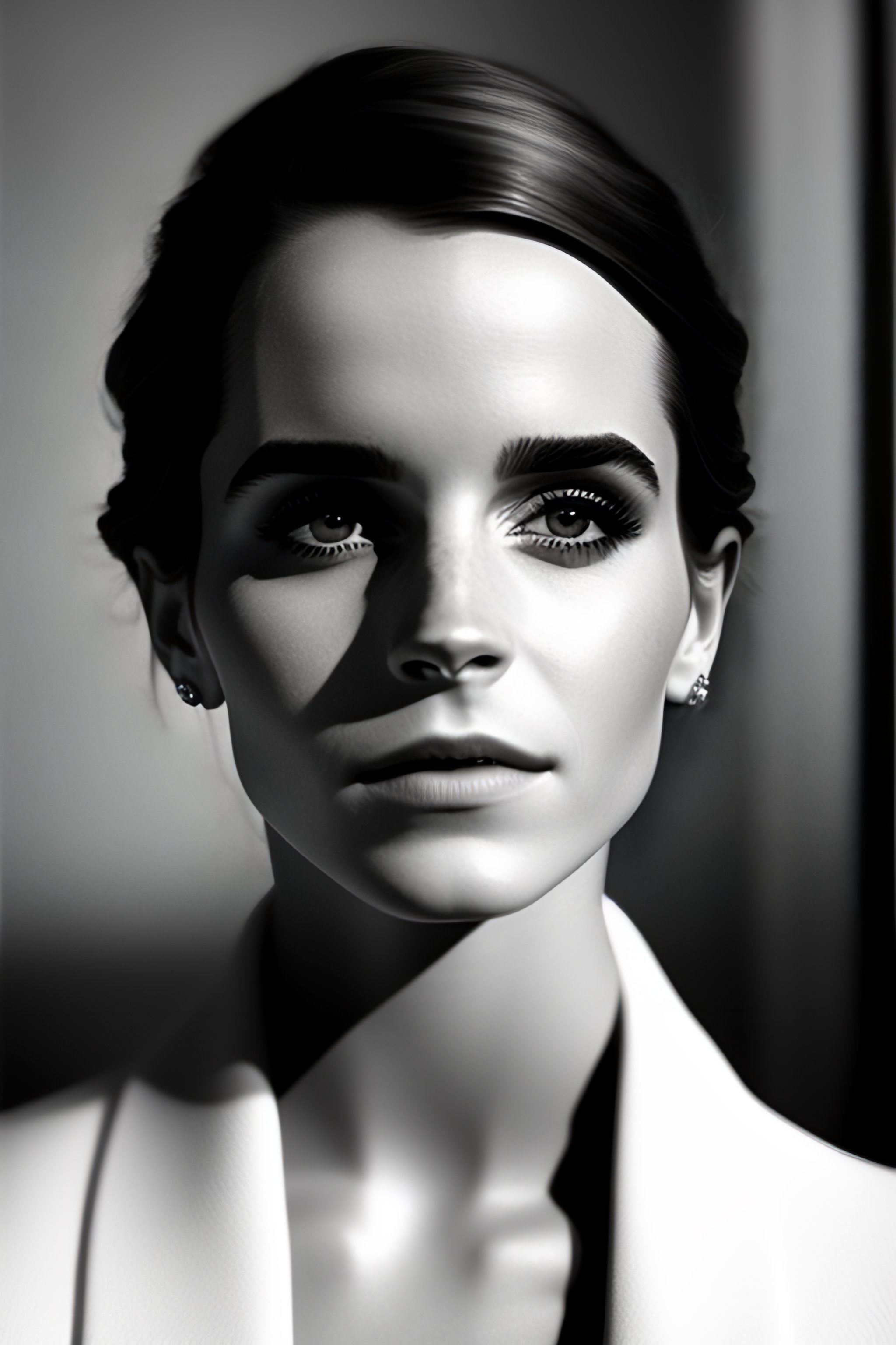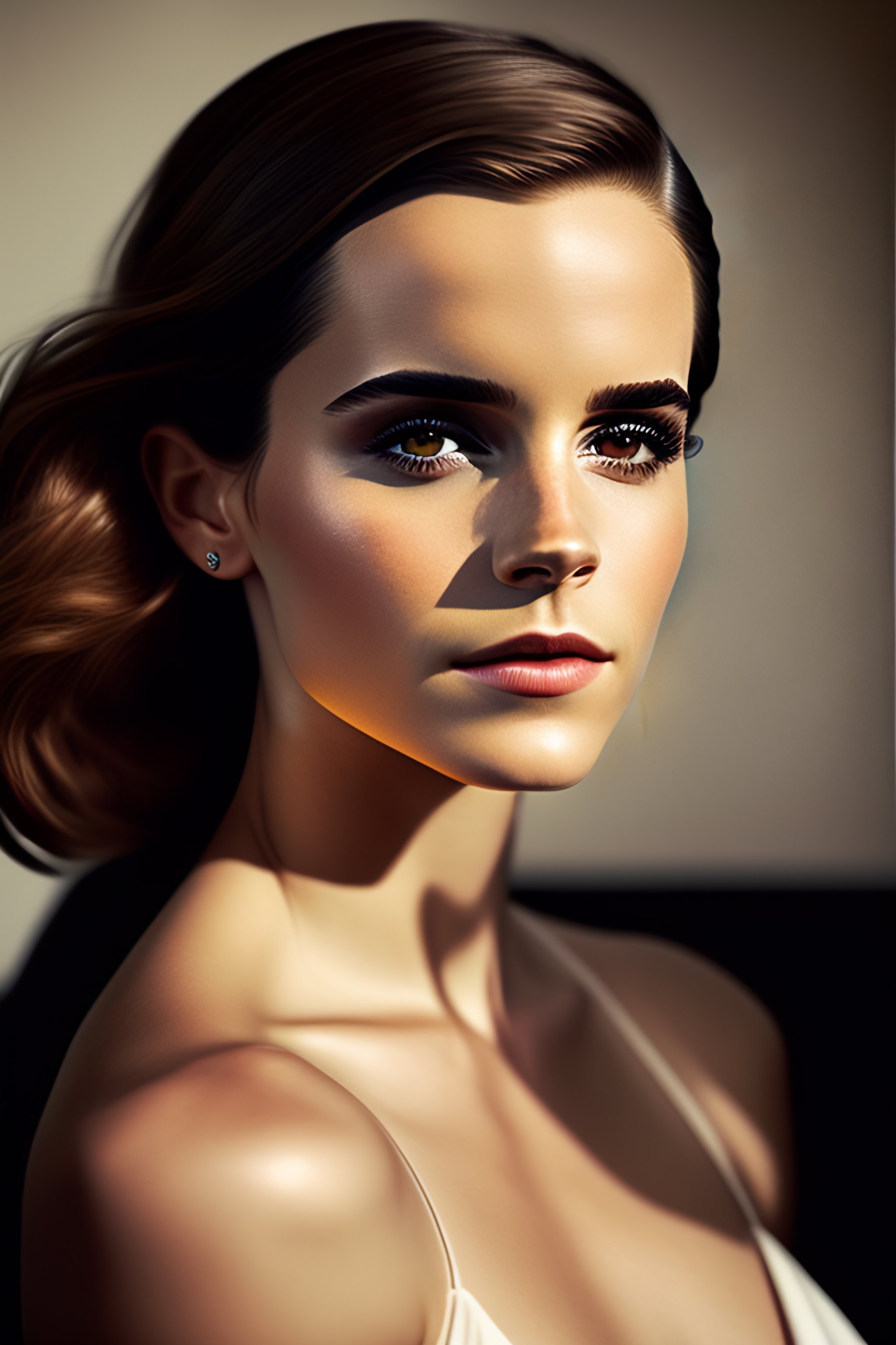 A beautiful close - up shot of emma watson, beautiful soft light falling on her face, studio photography by helmut newton