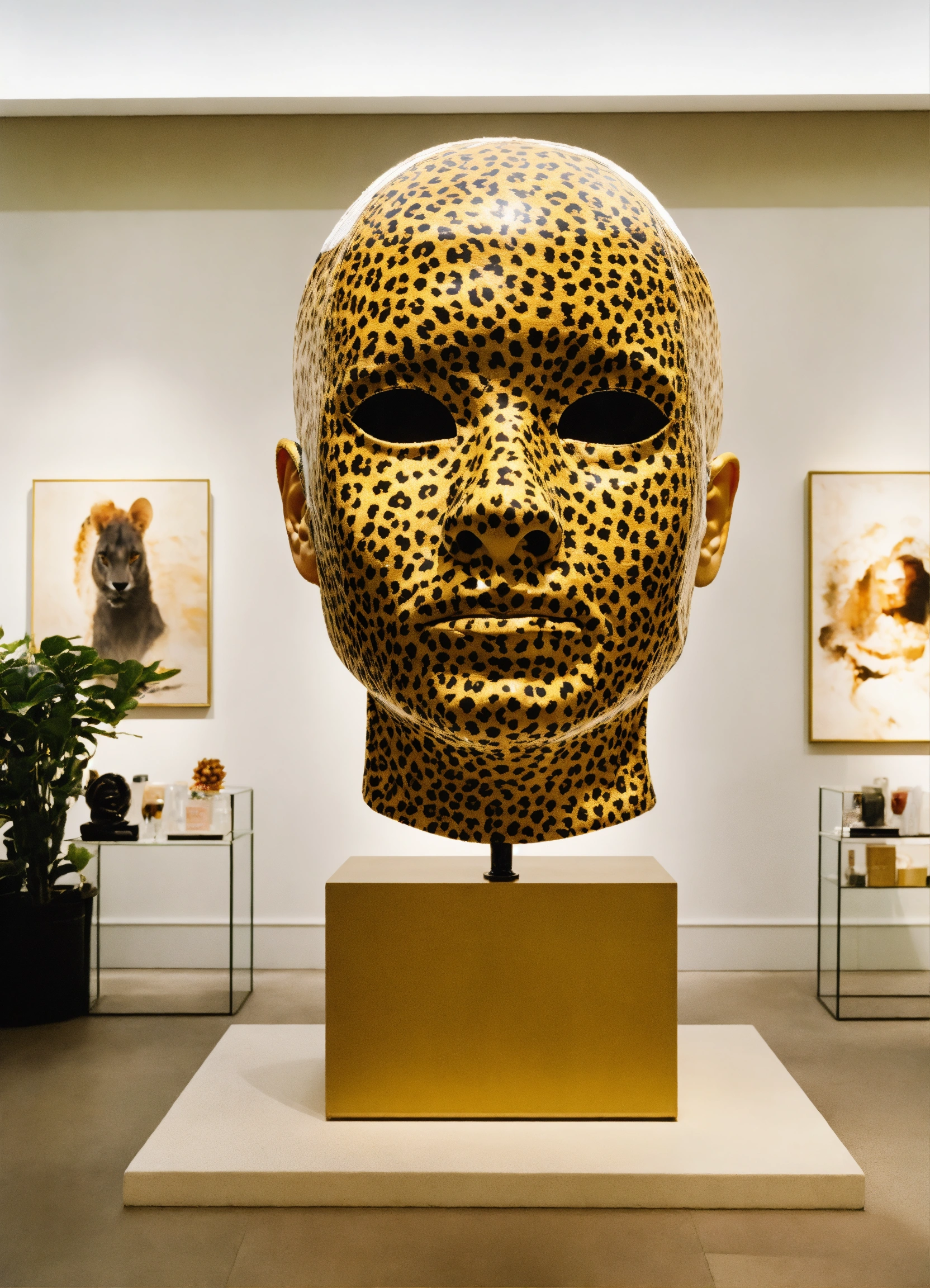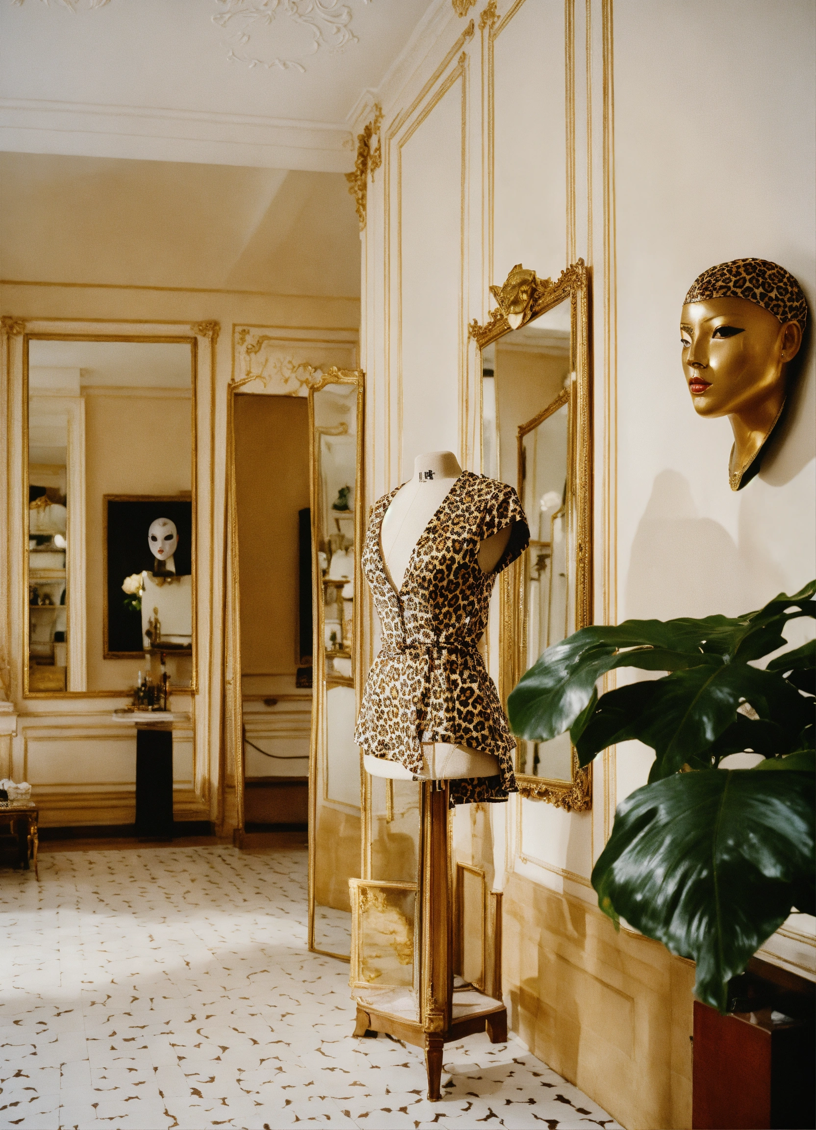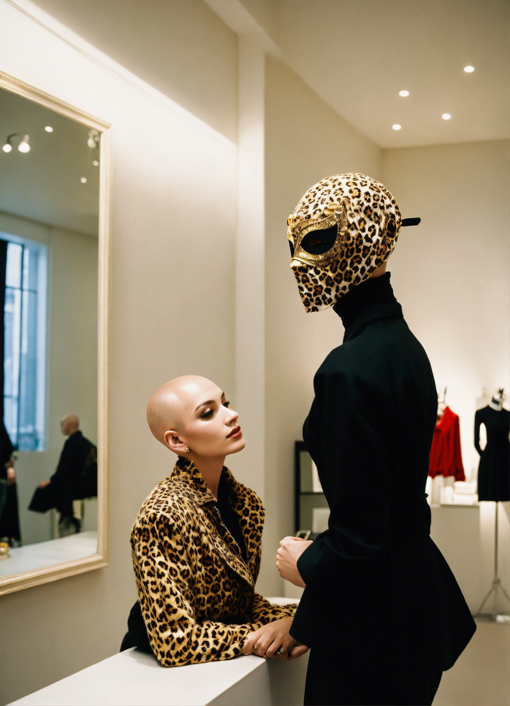 Bald the mask 1994, parisian salon, boutique, montaigne avenue, bright space well lit, white walls, leopard