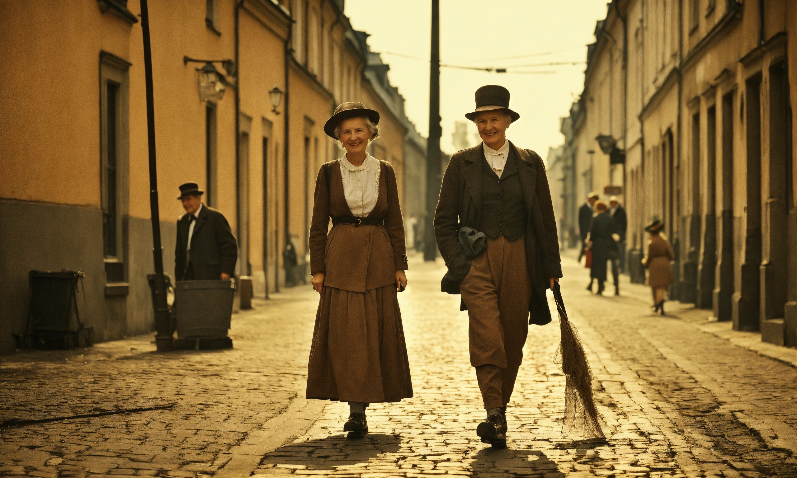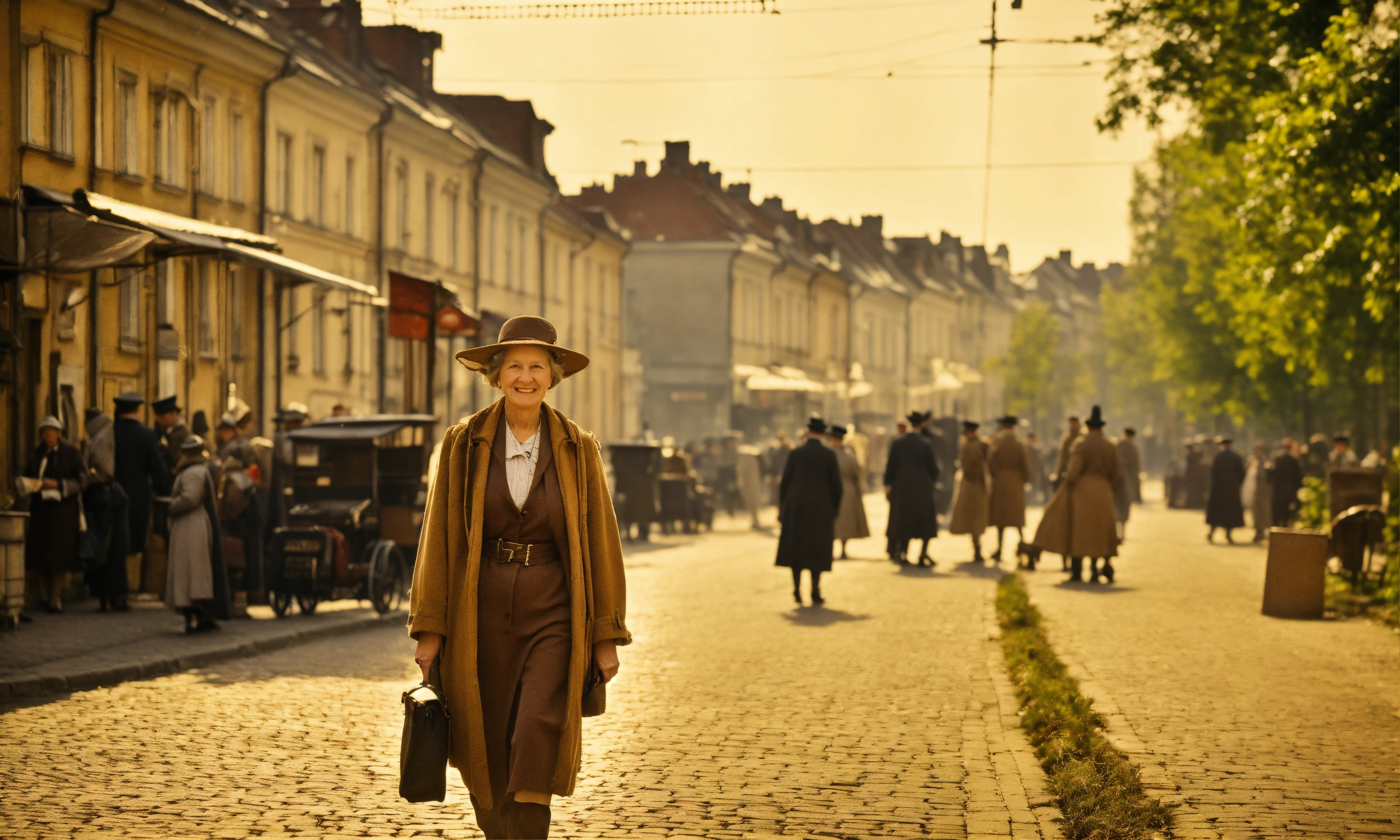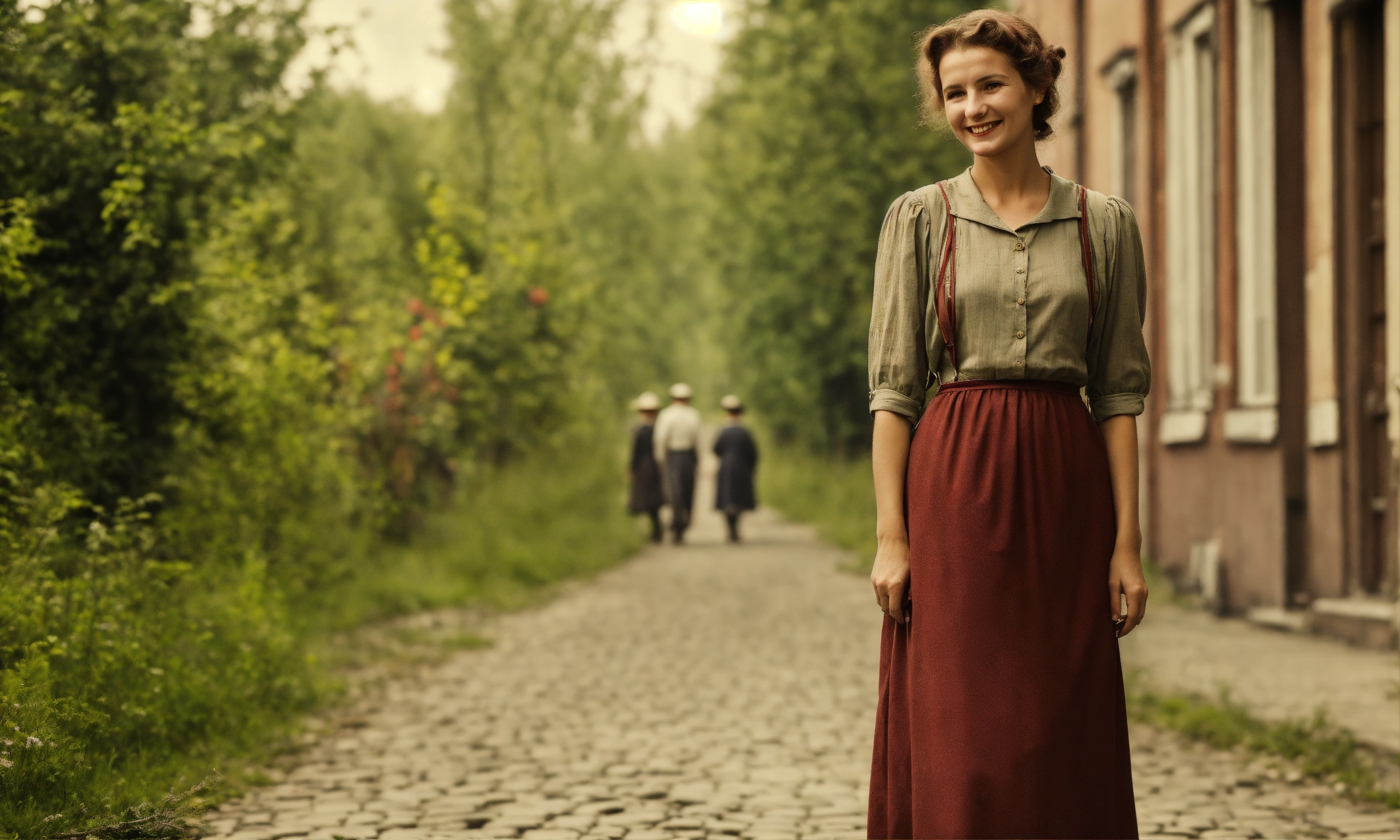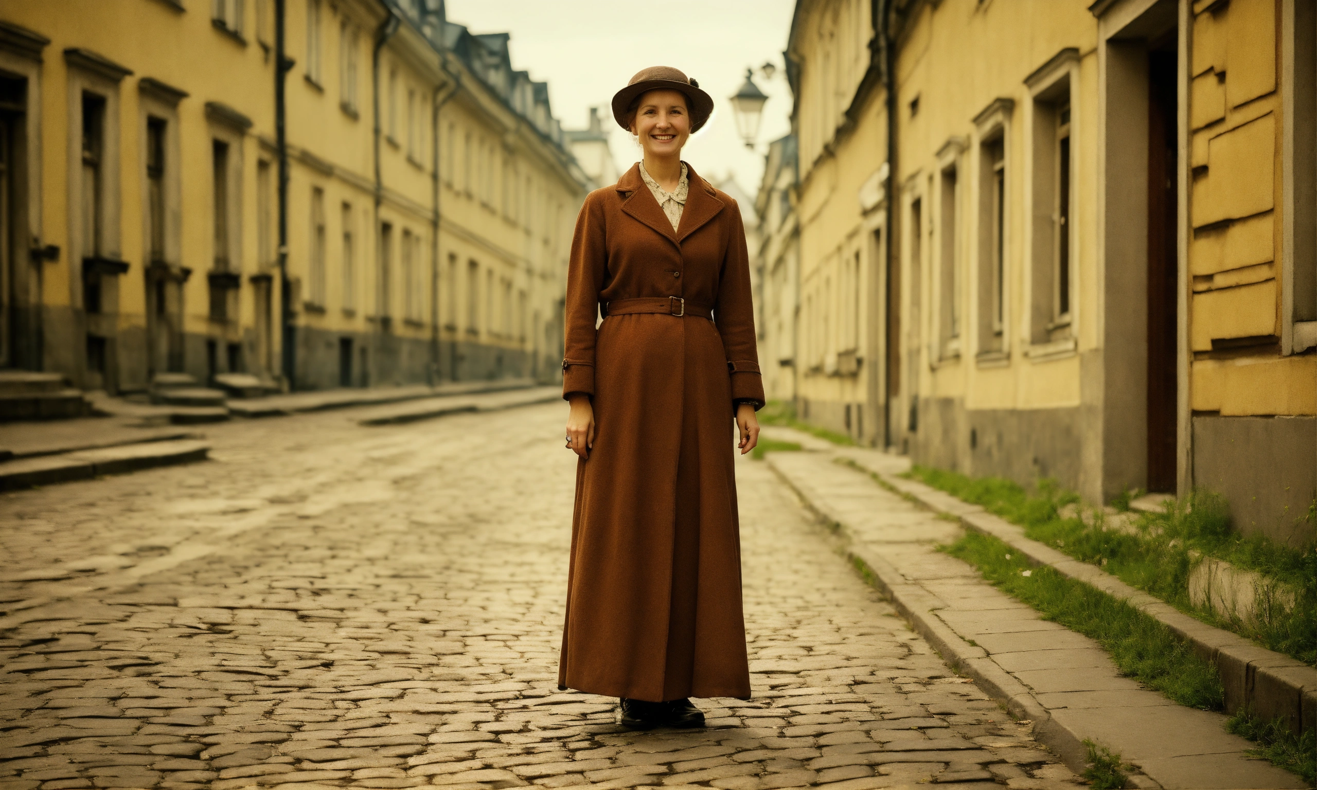 Poland think poor woman age 20, 1920-1930 on streen in warshaw. retro style photo. without people. focus camera on face woman . season summ, keep in mind that the street must be without people, retro style photo. without people. man full height. on street, smiling. man age 20 years old.clothing old style