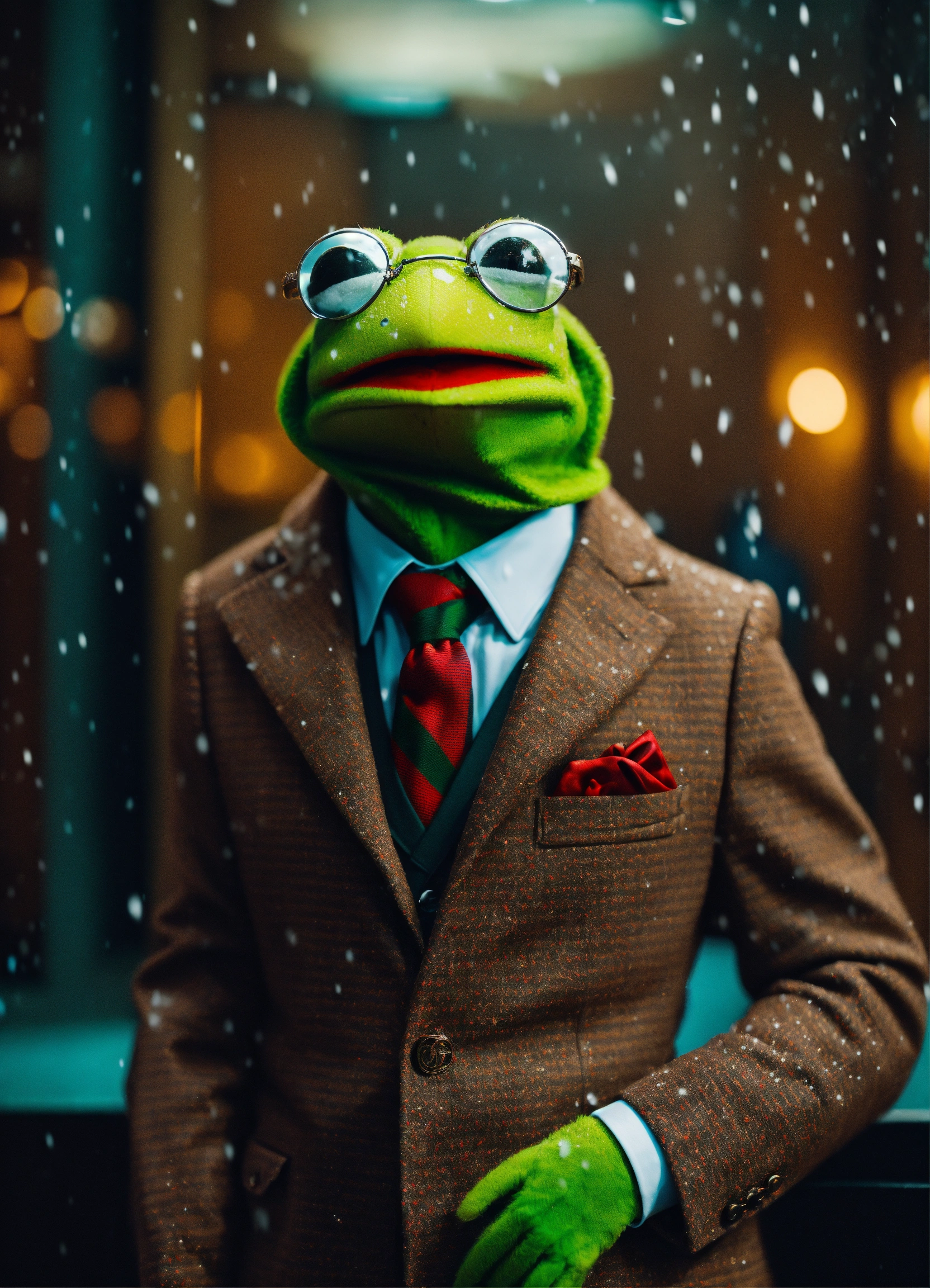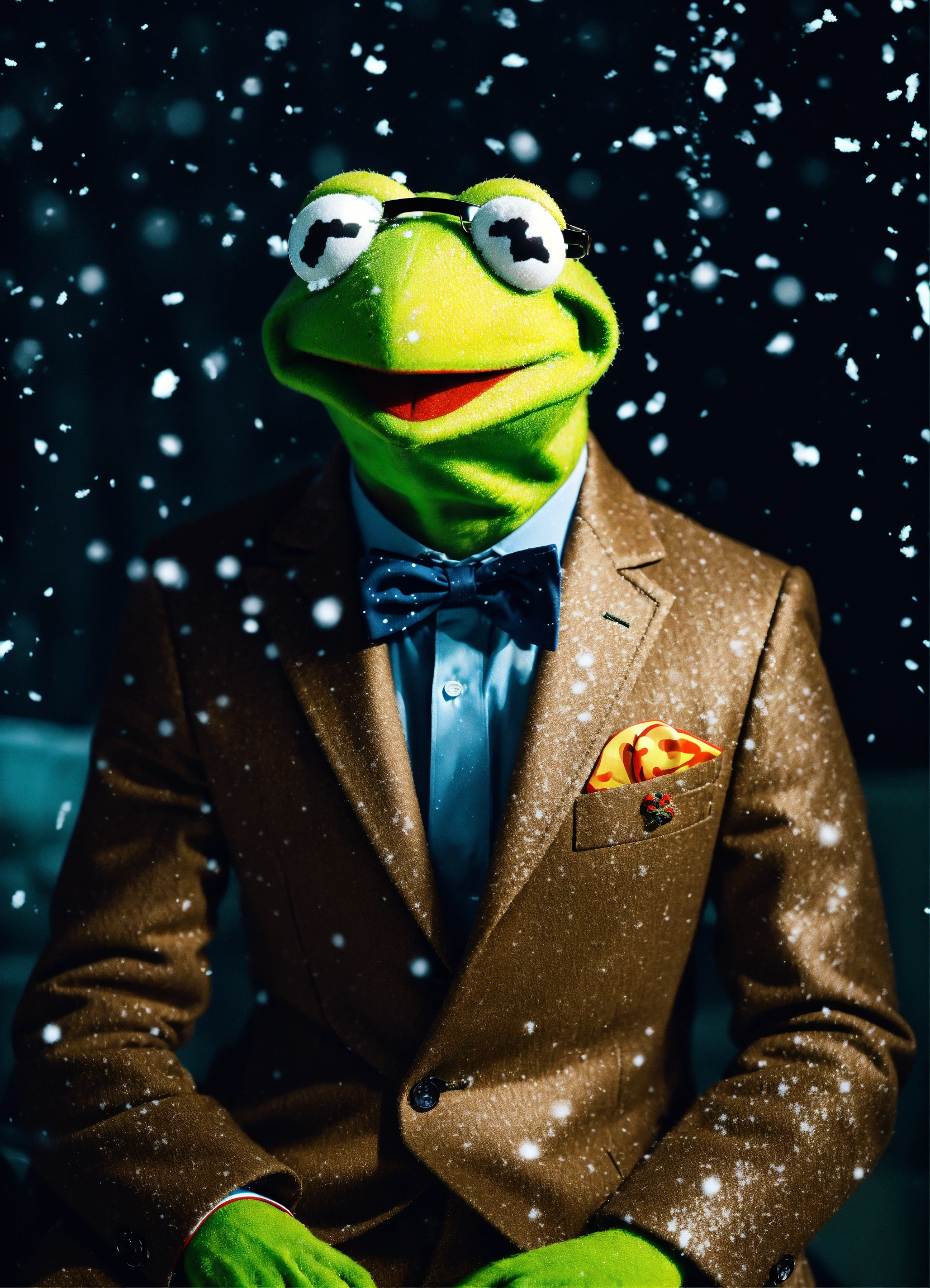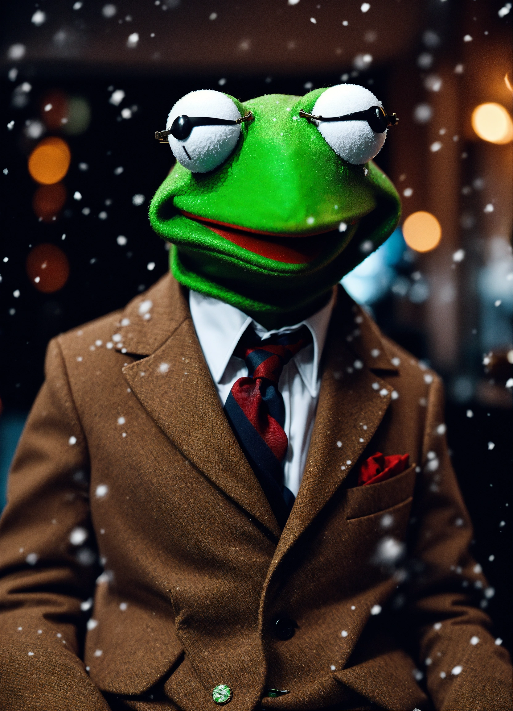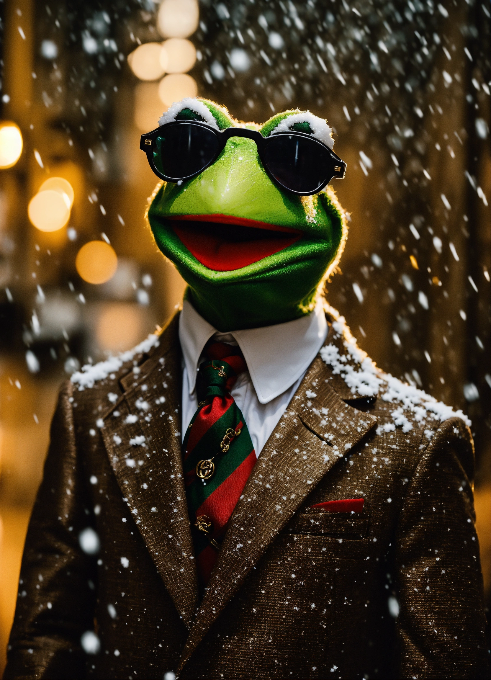 Kermit the frog wearing a brown gucci suit, gucci glasses, gucci promo photo, 8k photo, snowing outside, dark hues, 8k photography