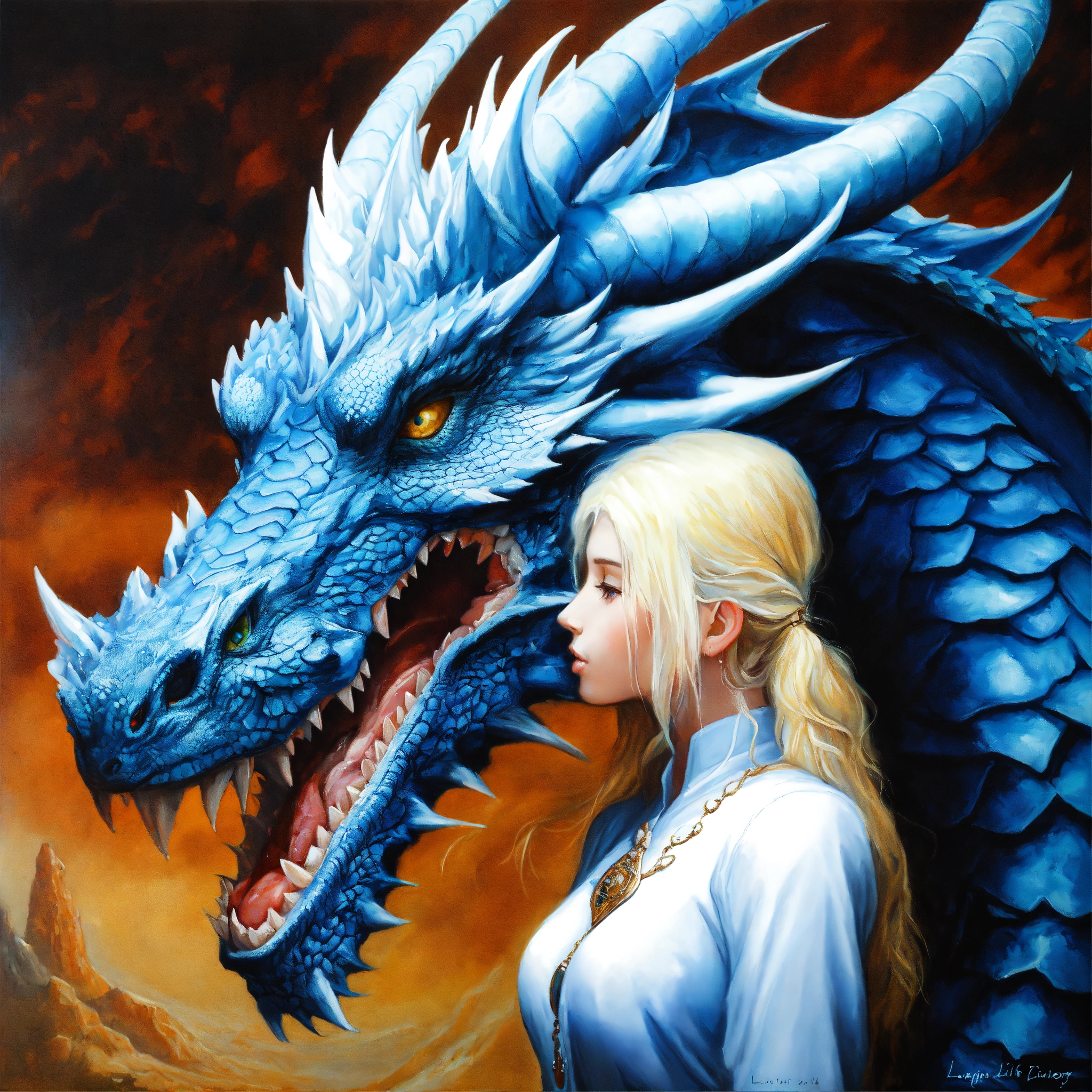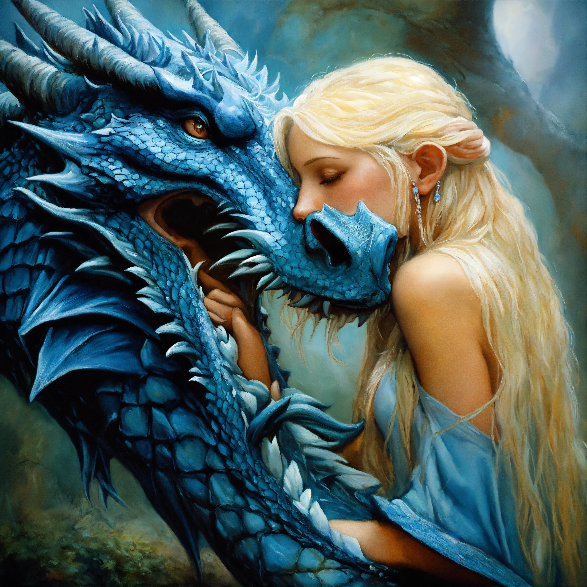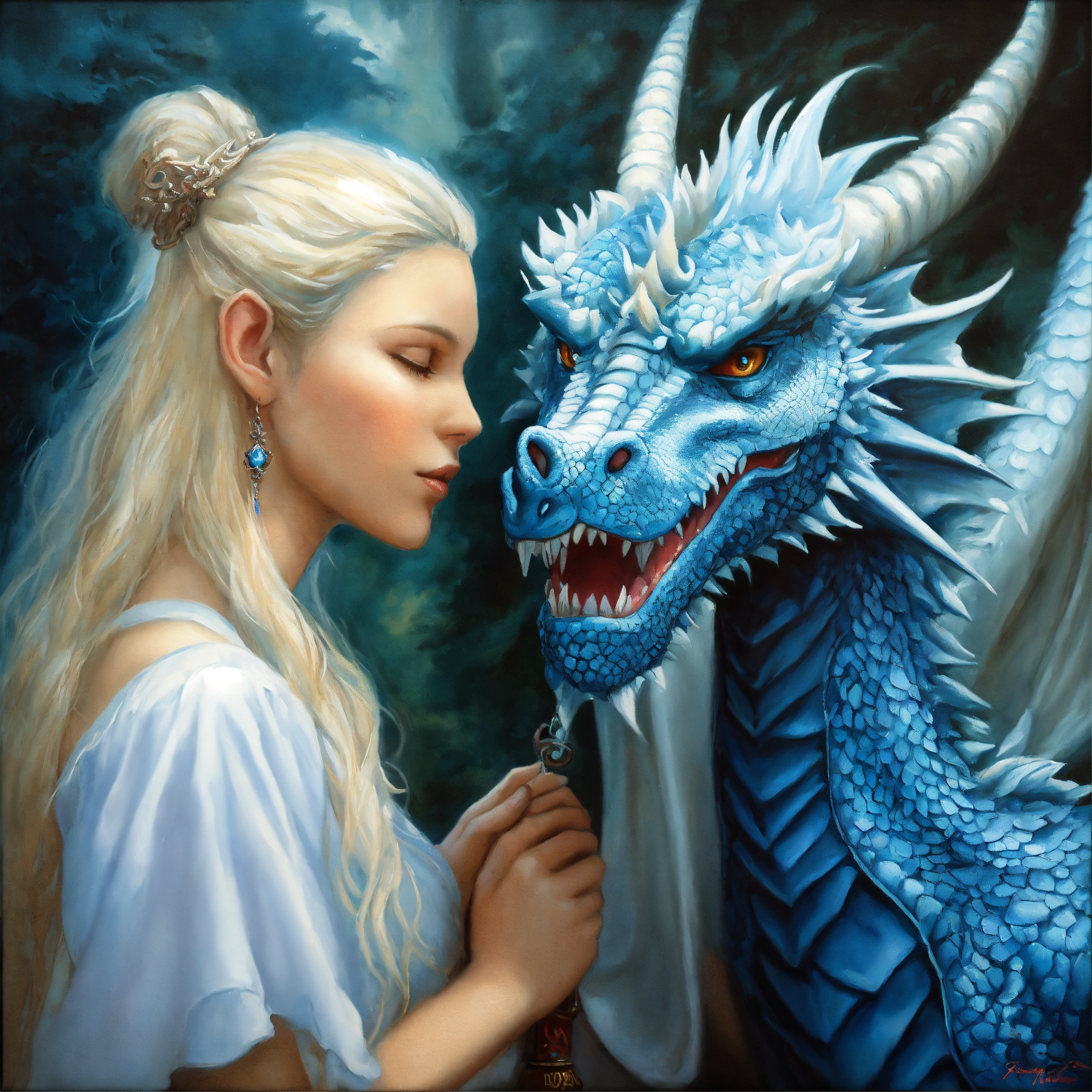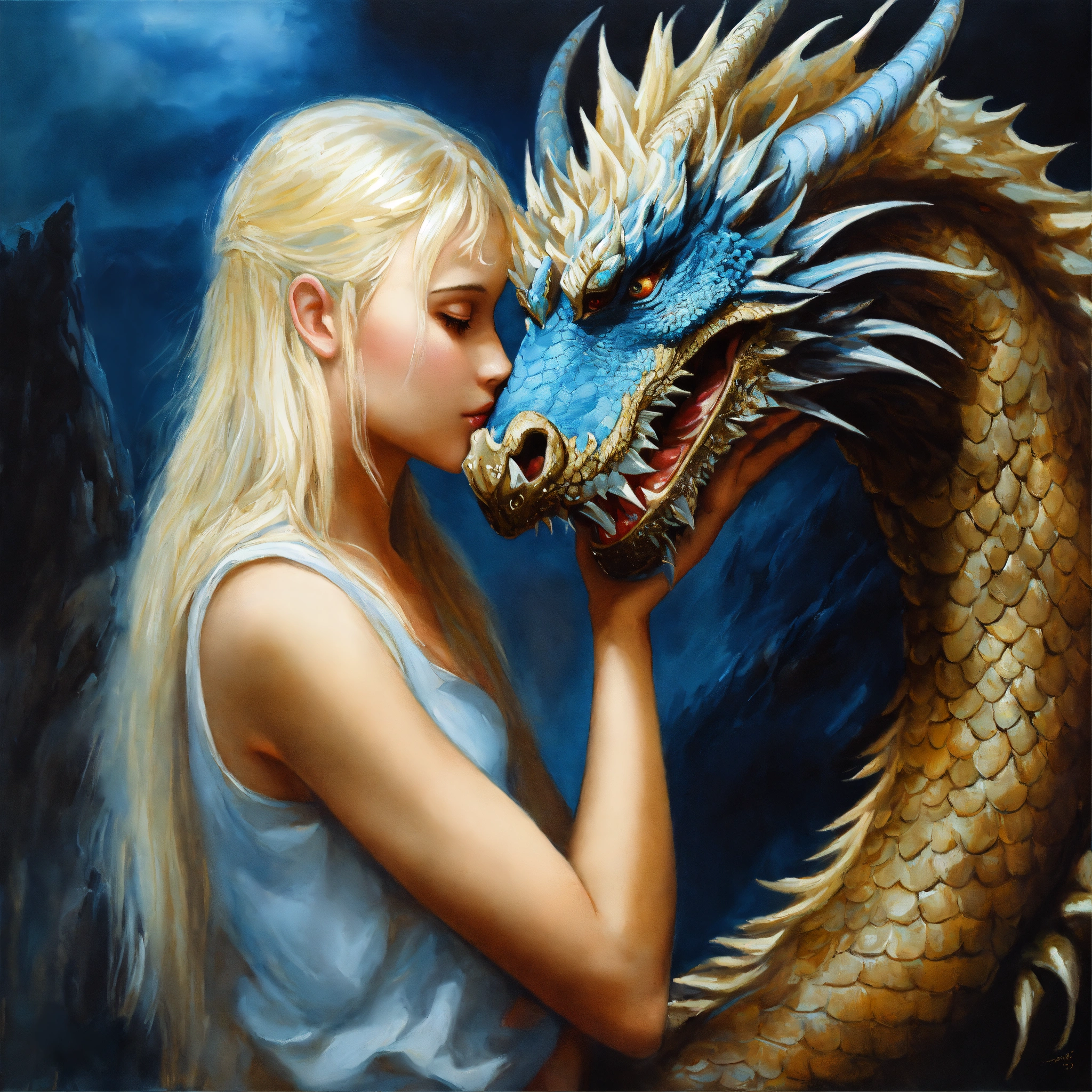 Oil painting of a huge magnificent two meter big blue dragon's head with a 15 year old white blonde elf girl lovingly hugging and kissing the dragon's head, the dragon's head is as big as the entire girl, ultra detailled, ultra realistic, in the style of luis royo