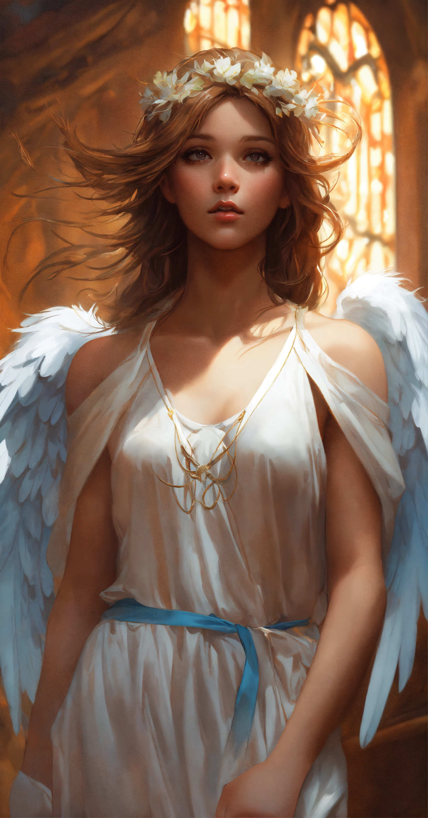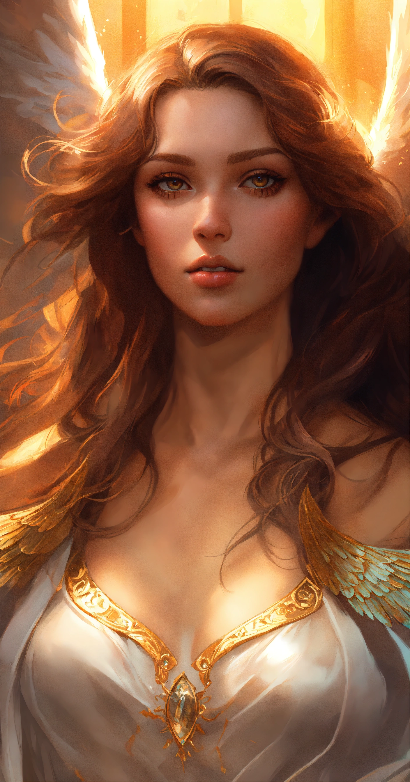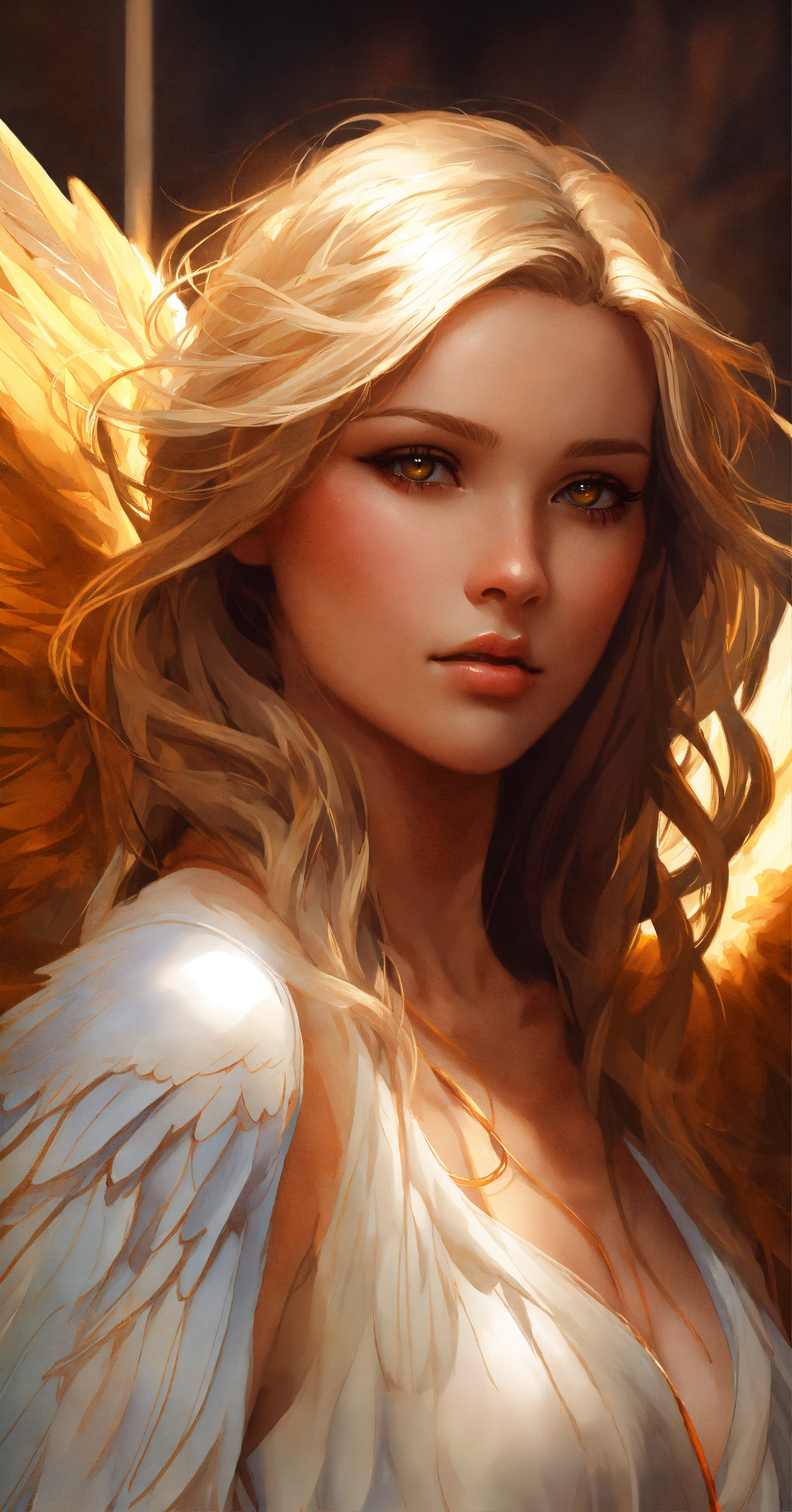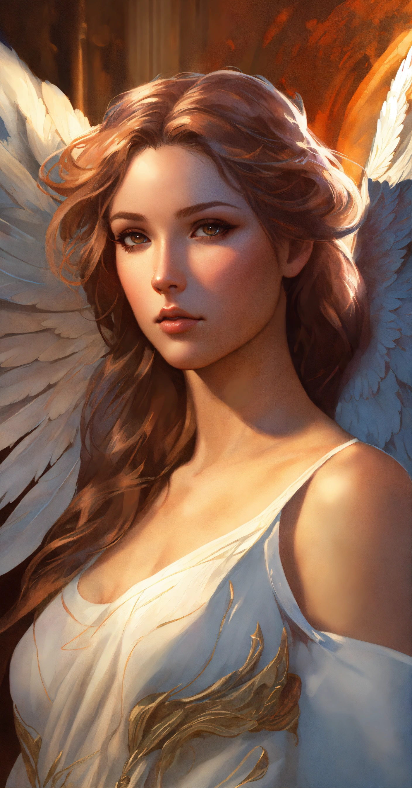 Angel, wings, hyperrealistic, headshot, digital painting, artstation, real, sharp focus, cinematic lighting, illustration, art by artgerm and greg rutkowski, alphonse mucha, cgsociety