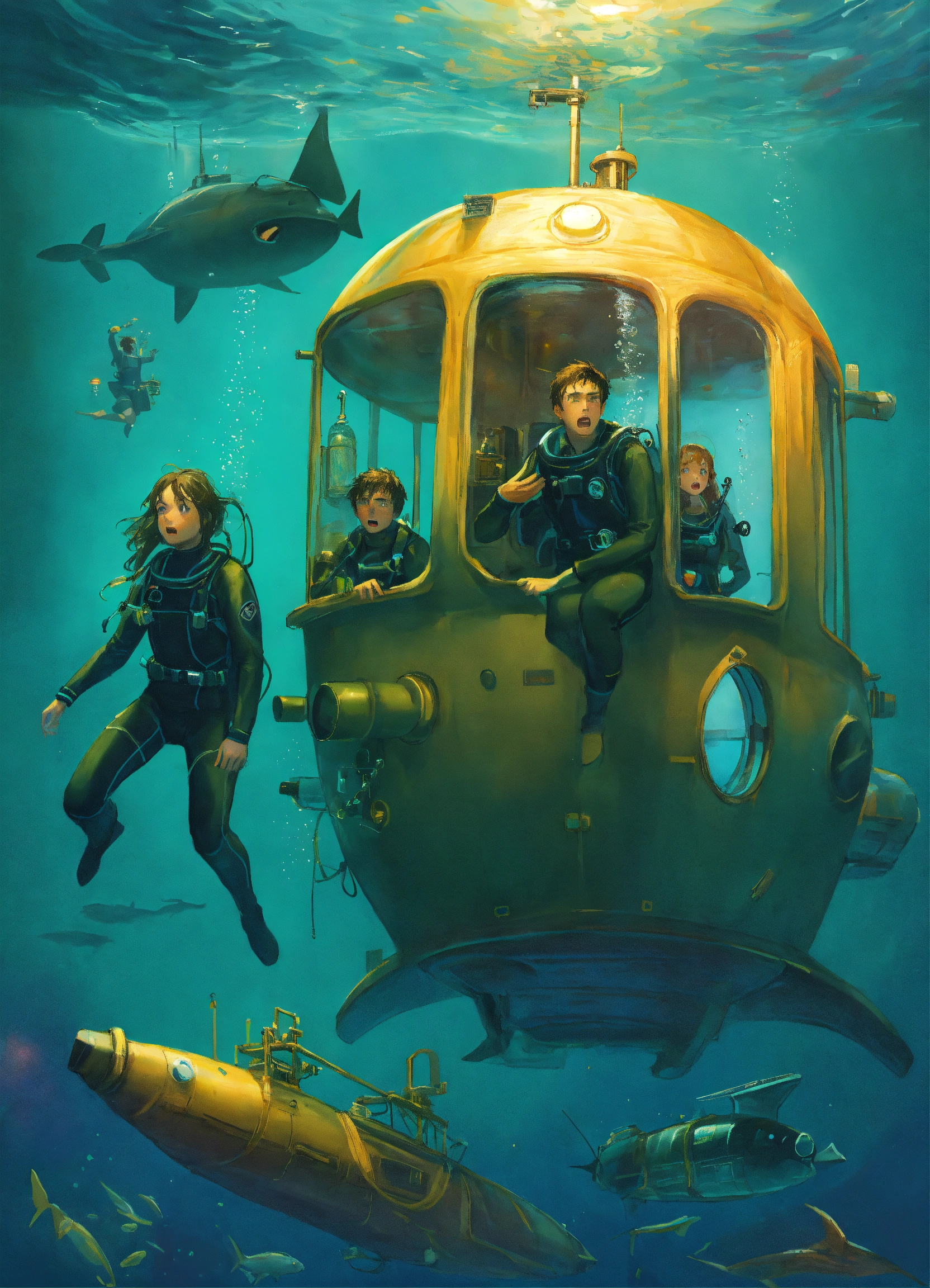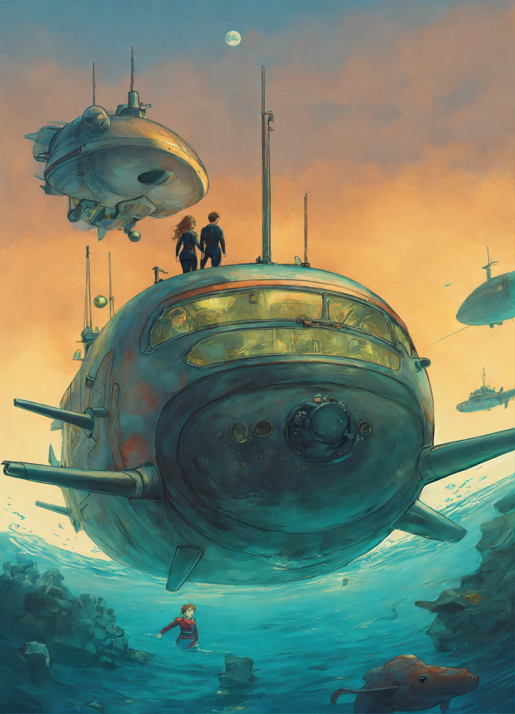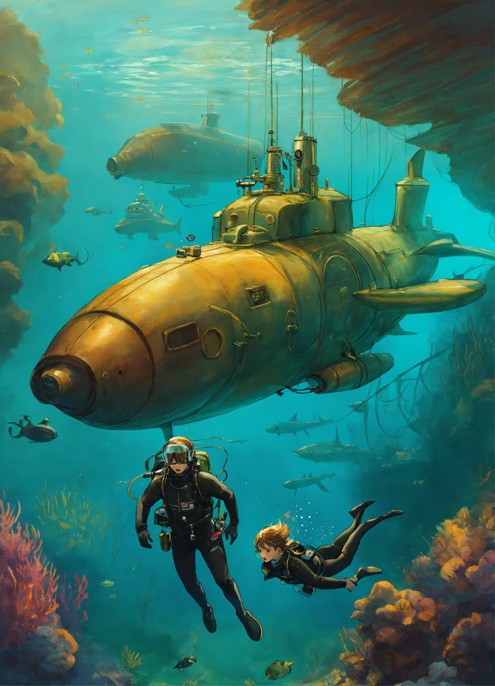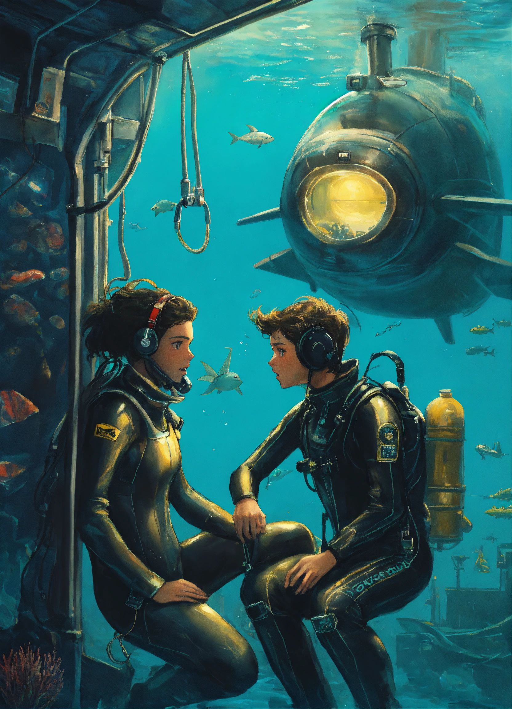 Two frightened young adults, a boy and a girl; dressed in wetsuits; while diving around a submarine; science fiction drawing