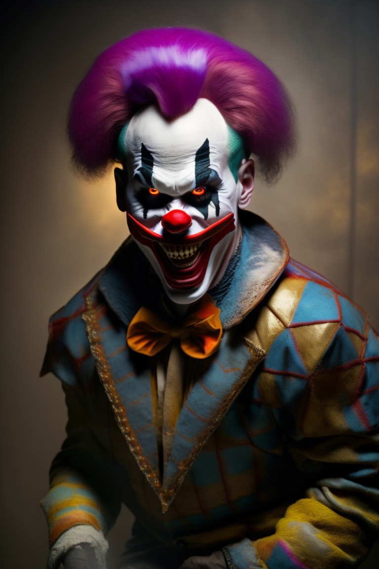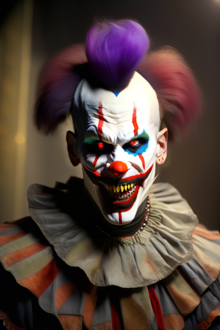 The image depicts a horrifying clown with razor-sharp teeth. the clown's face is painted with grotesque, exaggerated features, including a wide, malicious grin that reveals rows of pointed, razor-sharp teeth. the teeth are jagged and uneven, adding to the unsettling appearance of the clown. its eyes are wide and manic, with a menacing glint, and the eyebrows are arched in a sinister manner. the clown's skin is pale, almost sickly, contrasting sharply with the dark, menacing makeup. it wears a tattered, brightly colored clown costume, which adds to the unsettling aesthetic. the background is dimly lit, casting eerie shadows, further emphasizing the horror of the clown's appearance.