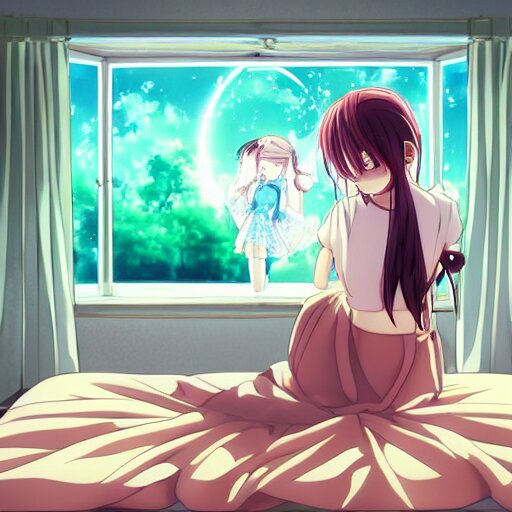 Cute art of a beautiful anime girl watching tv inside a bedroom