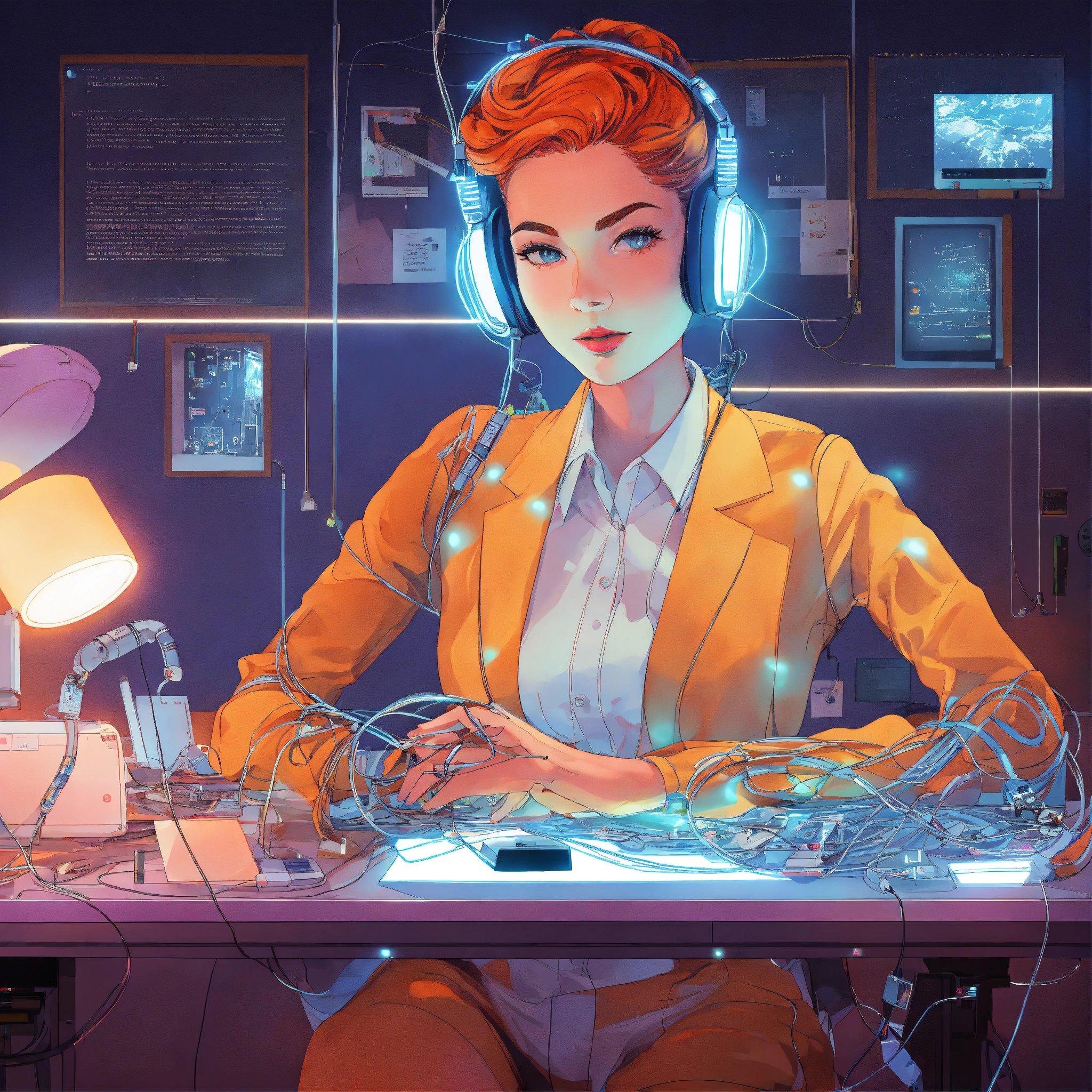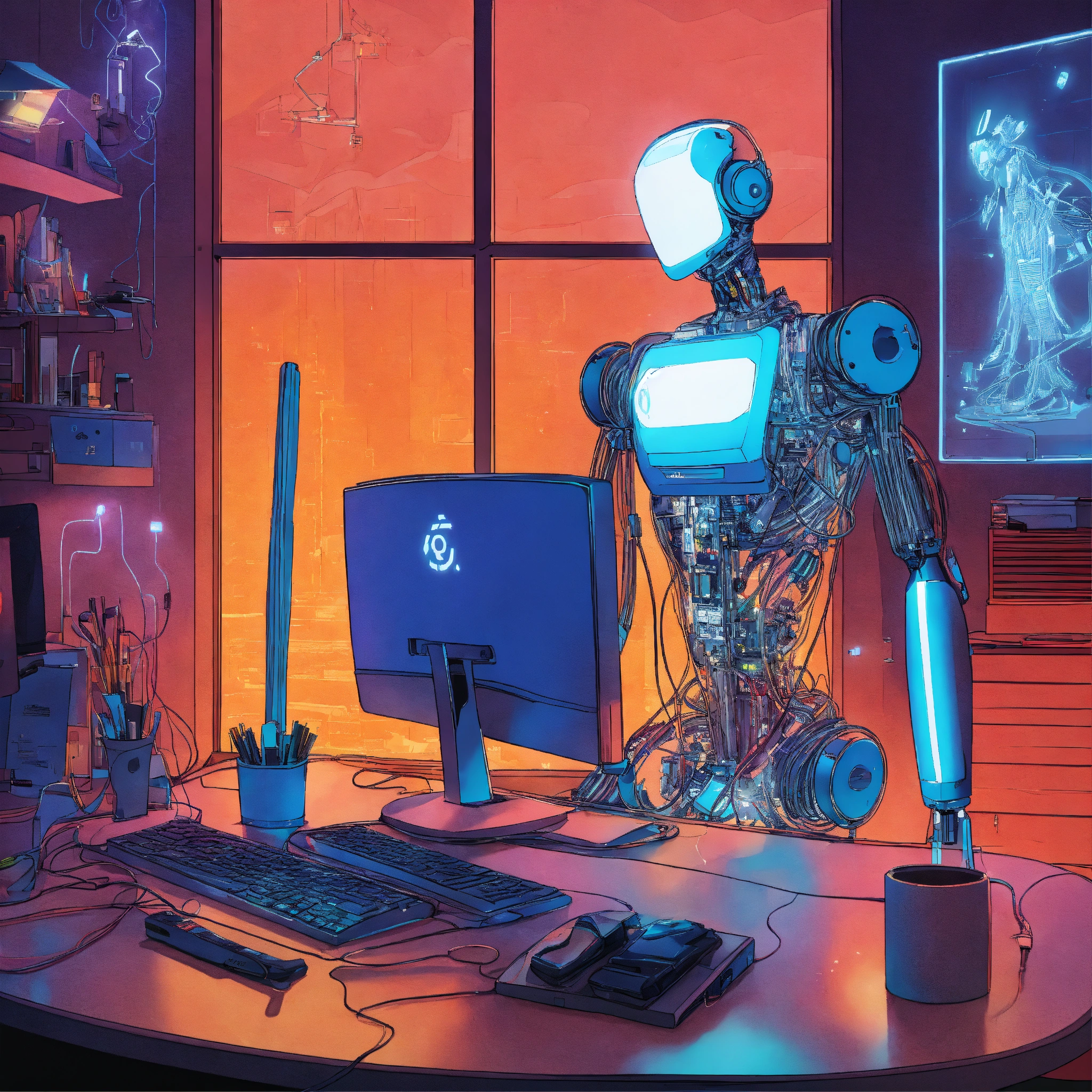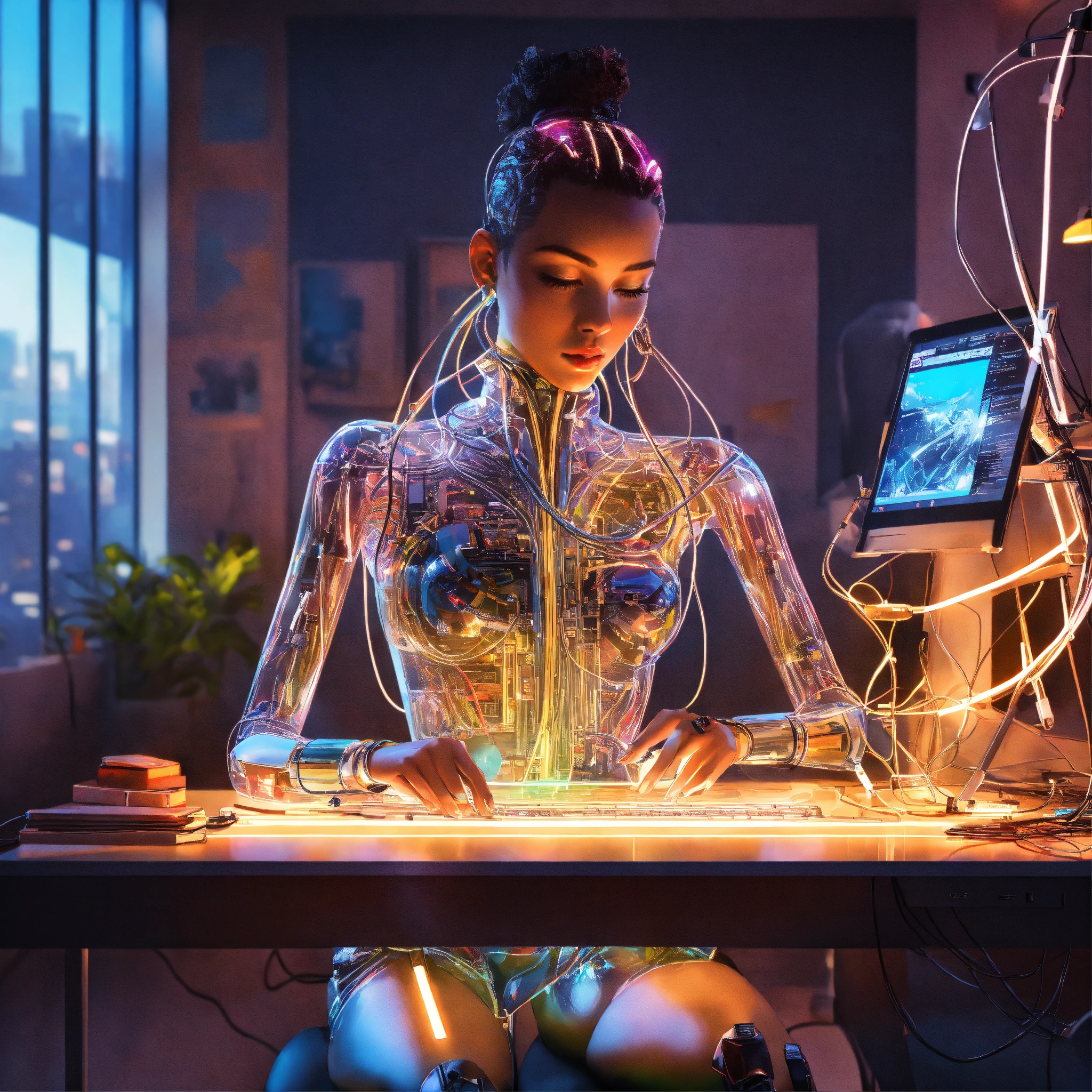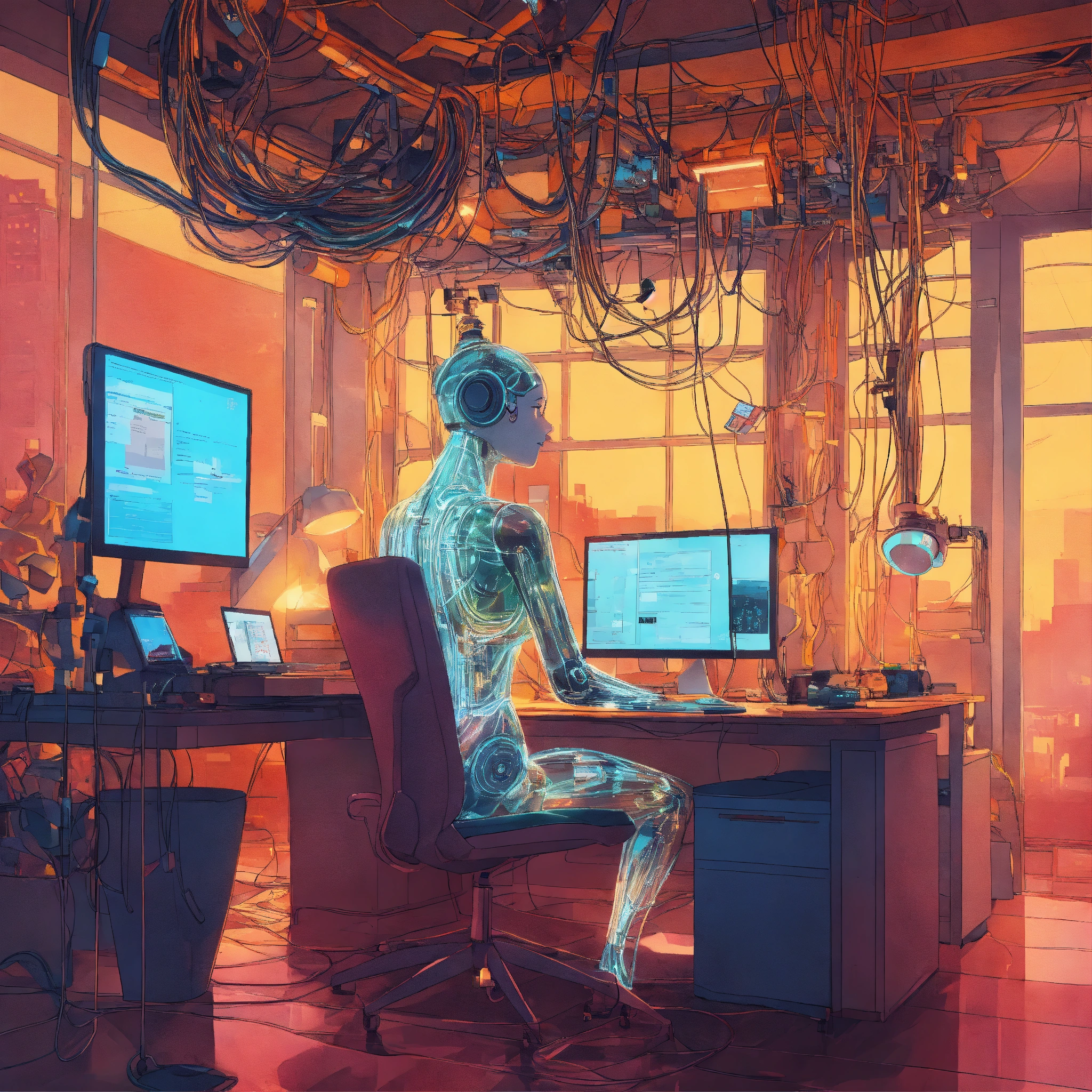 Create a vibrant, cartoon-style poster showing a body portrait of a person in an office setting filled with cables, wires, and glowing led lights. include futuristic, attractive transparent white plexiglass secretary robots with sleek designs, typing away. the scene is viewed from an 80-degree angle, giving it a dynamic and unusual perspective. the artwork should have a surreal and dream-like quality, reminiscent of early 20th-century surrealism, with a touch of abstract modernism and cartoonish flair to capture a unique and creative atmosphere.