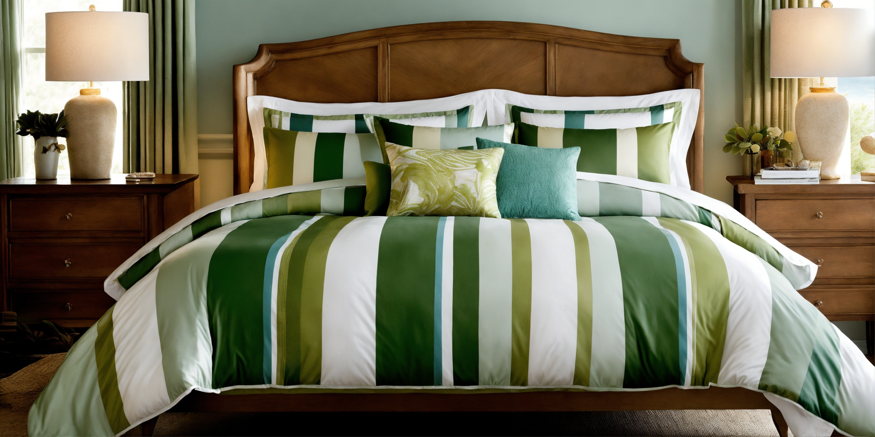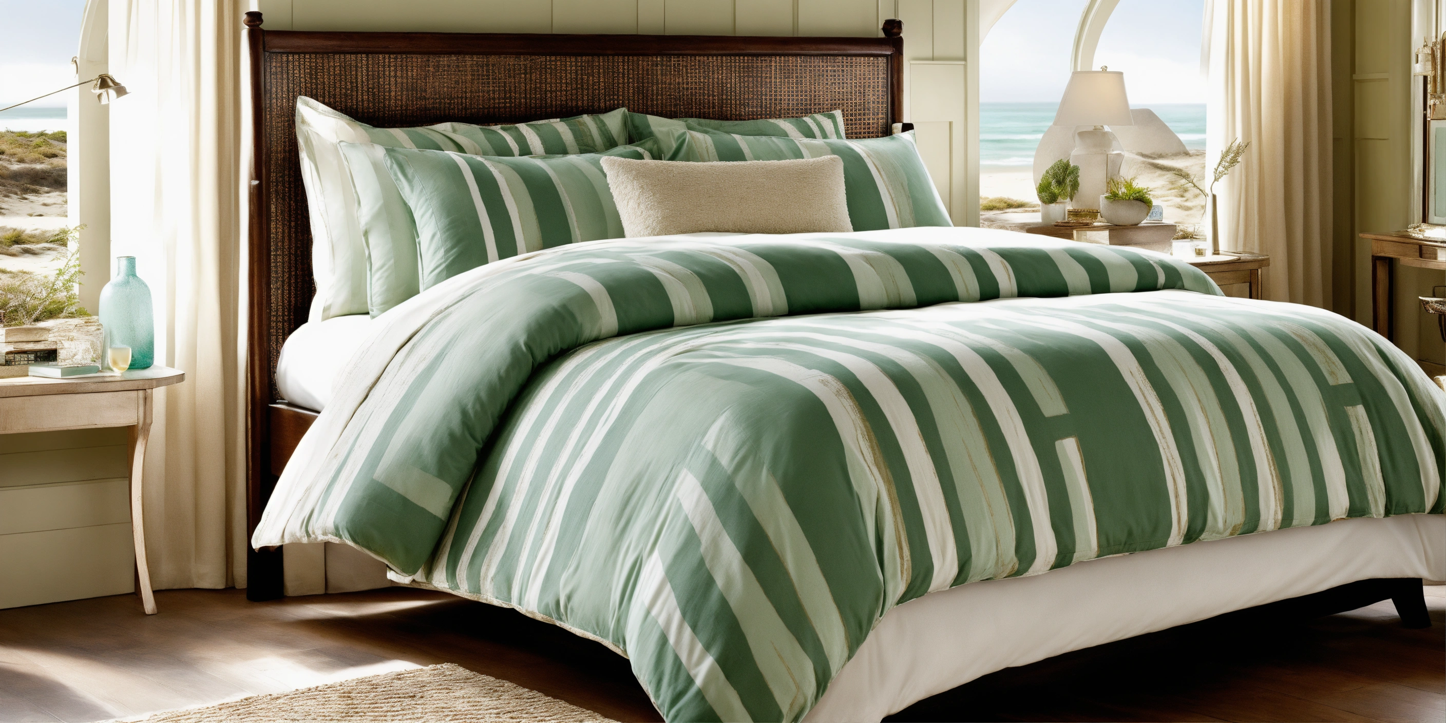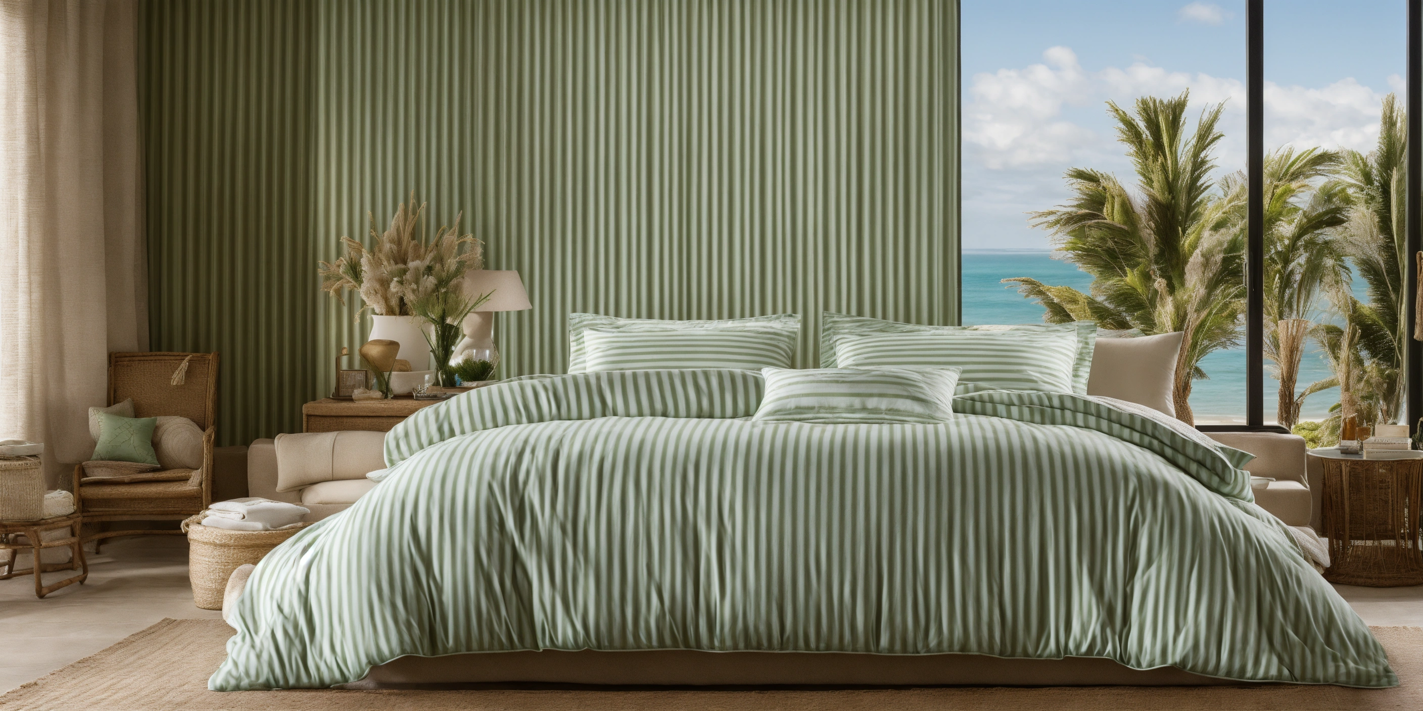 Hyper-realistic coastal striped beach theme sage and white luxury duvet cover