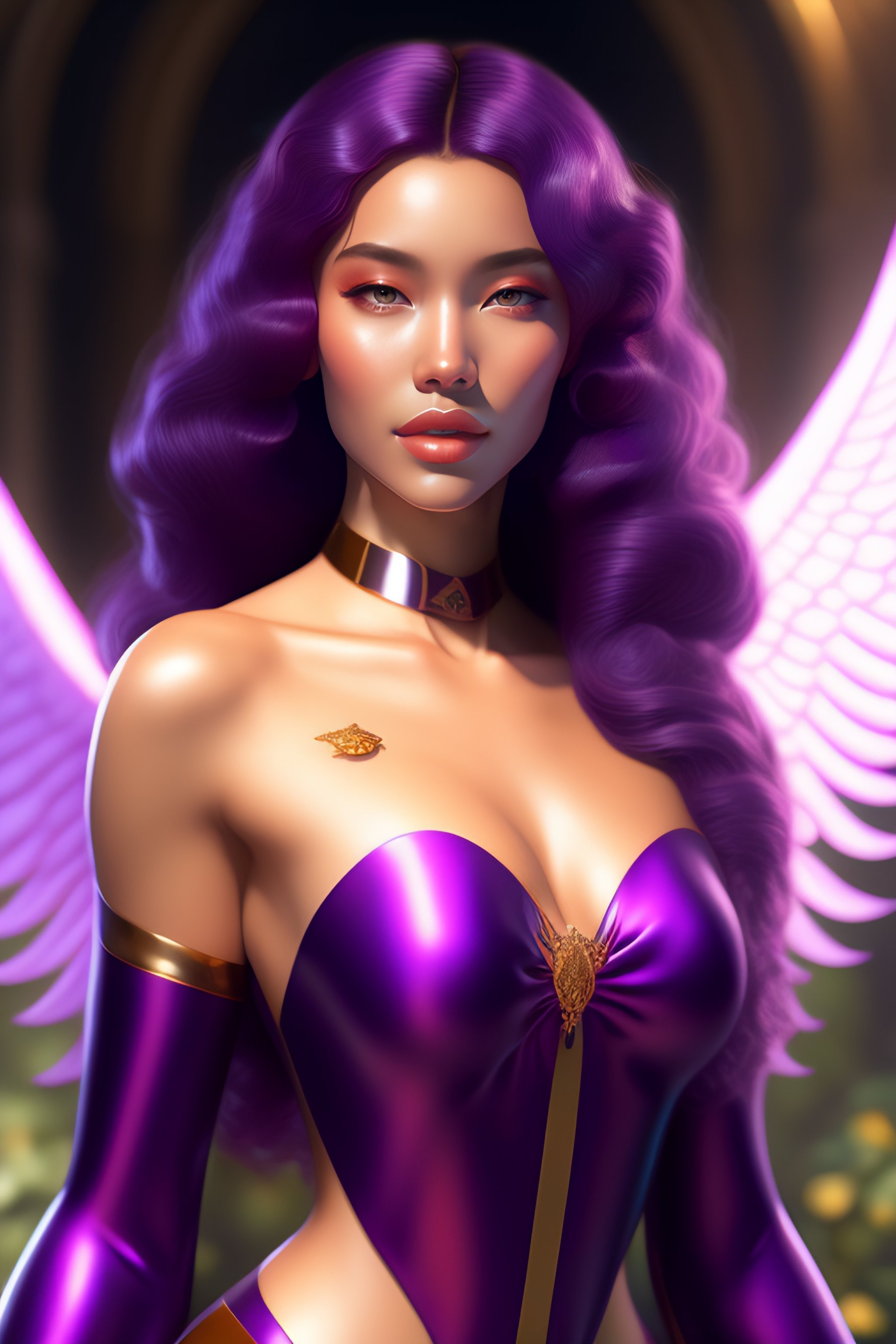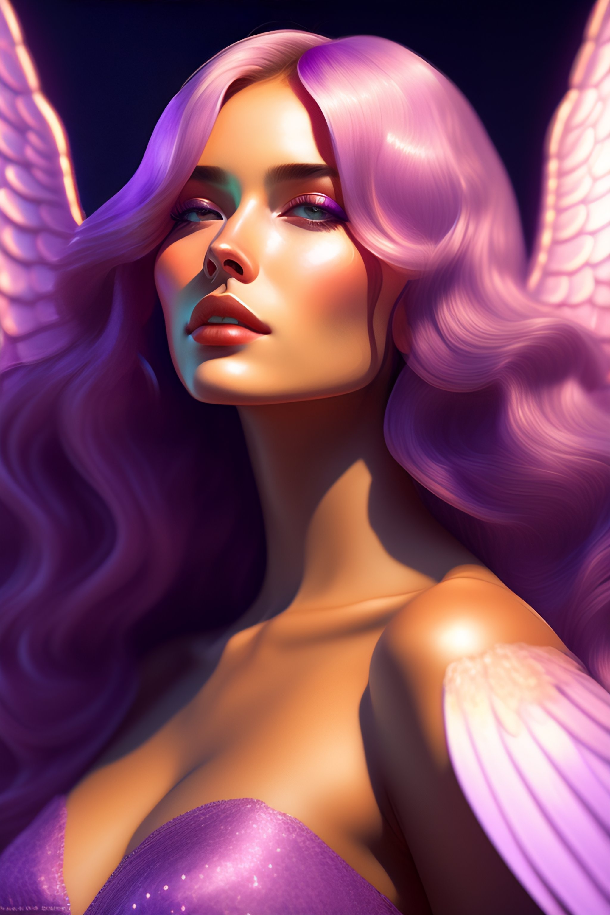 Seraphine, purple, angel, beautiful, photorealistic, kiss, angelic, beautiful, intricate, cinematic lighting, highly detailed, digital painting, artstation, concept art, smooth, sharp focus, illustration, art by artgerm and greg rutkowski, cgsociety, alphonse mucha and rossdraws, artgerm, unreal engine 5, 8k