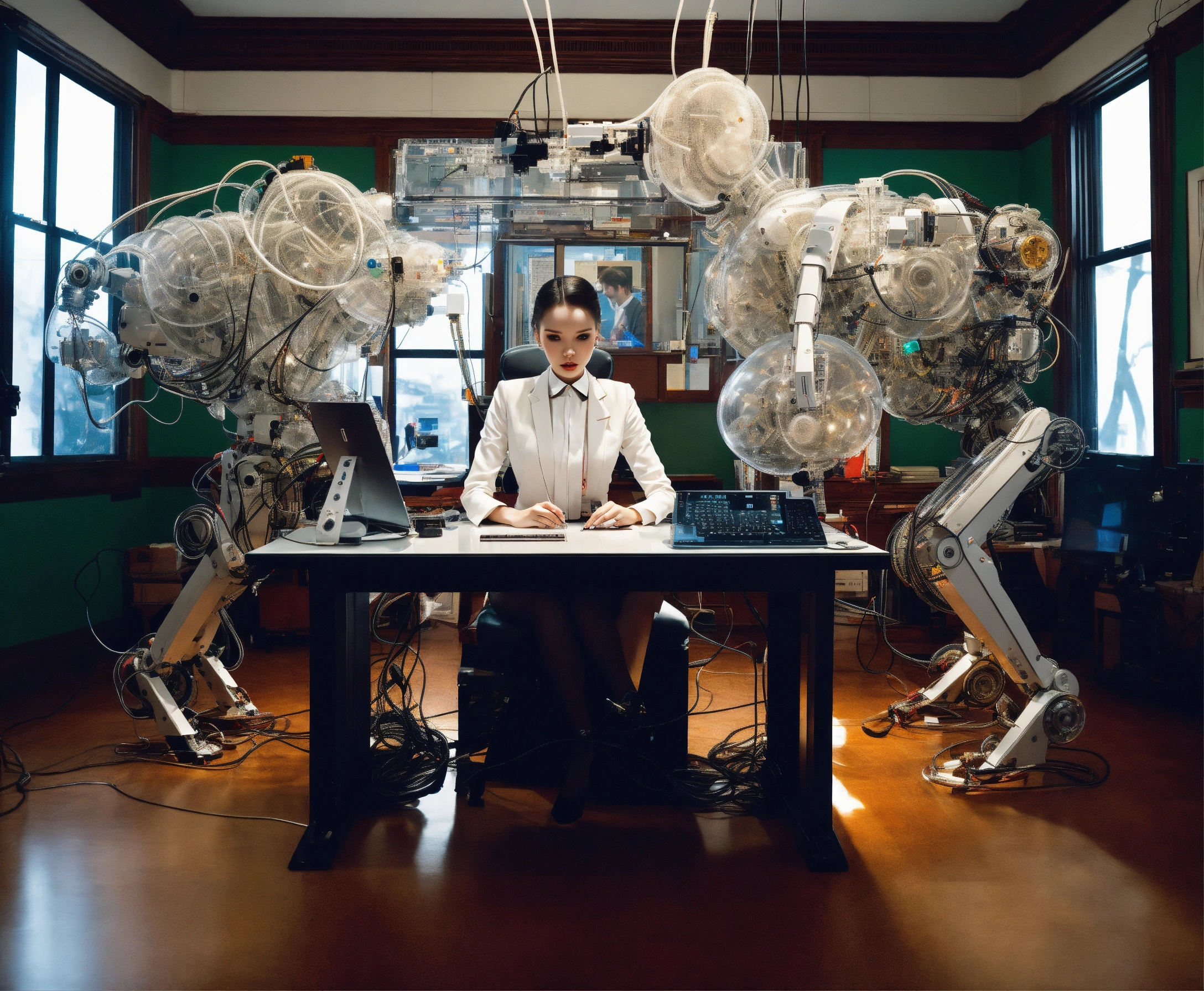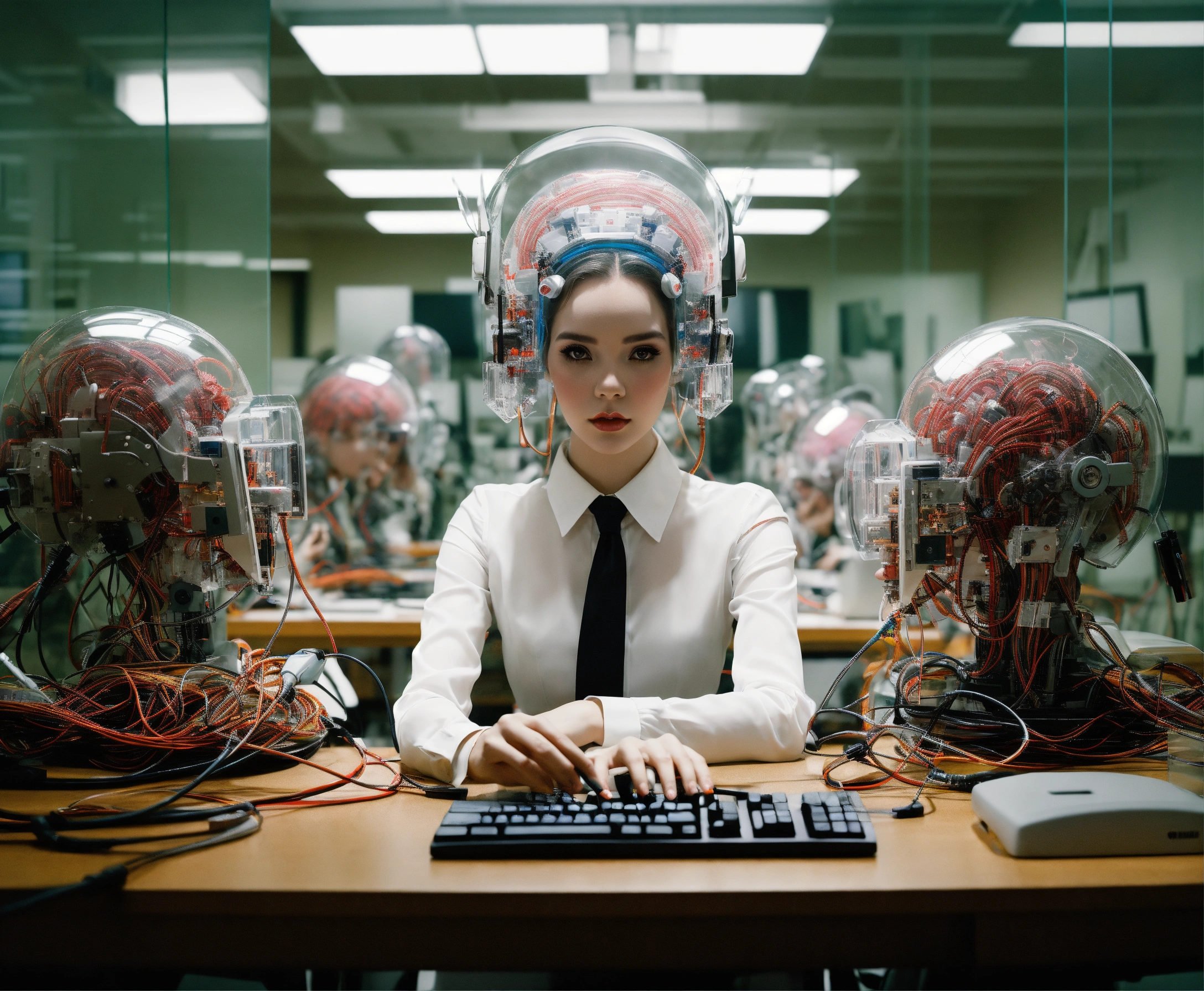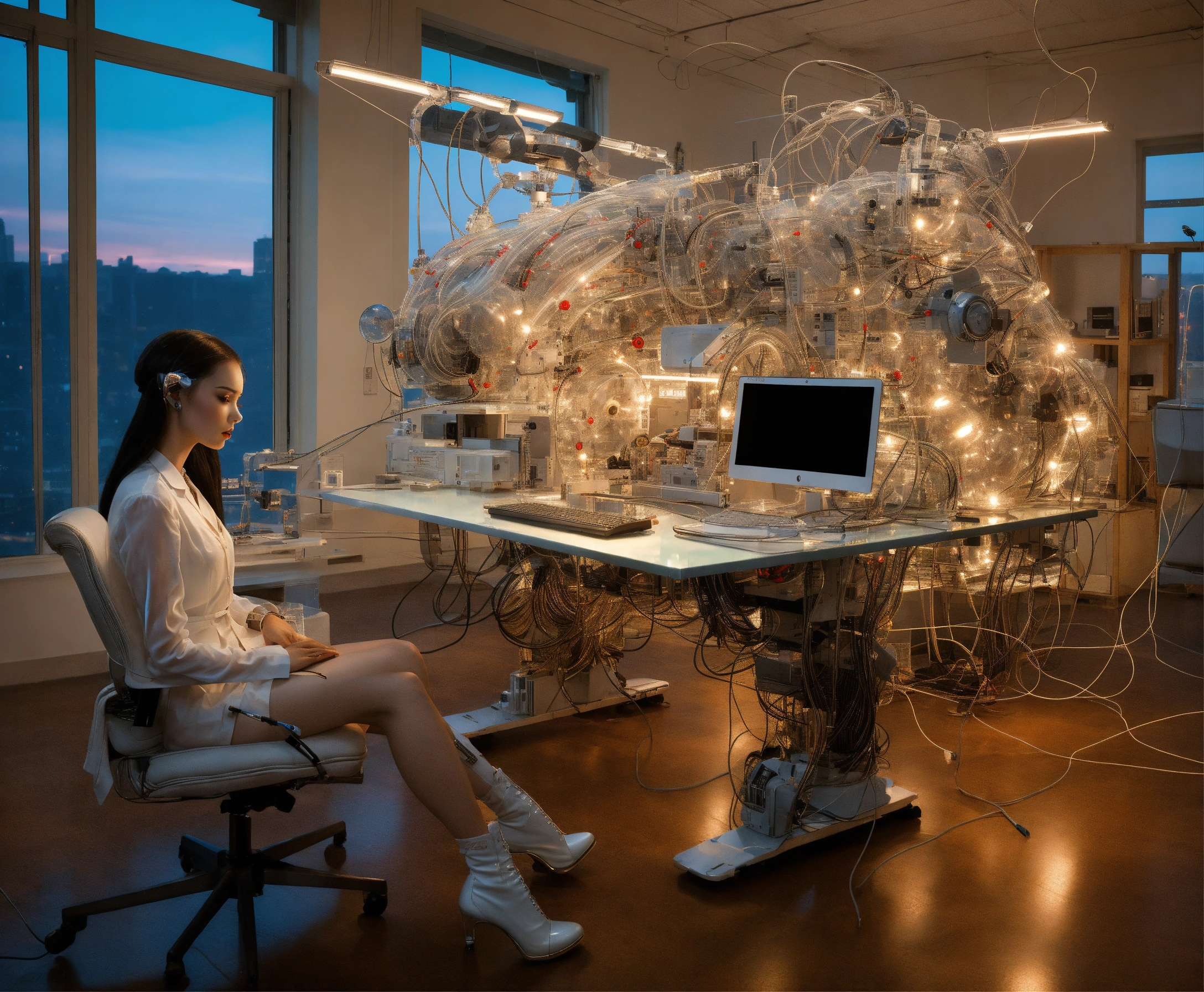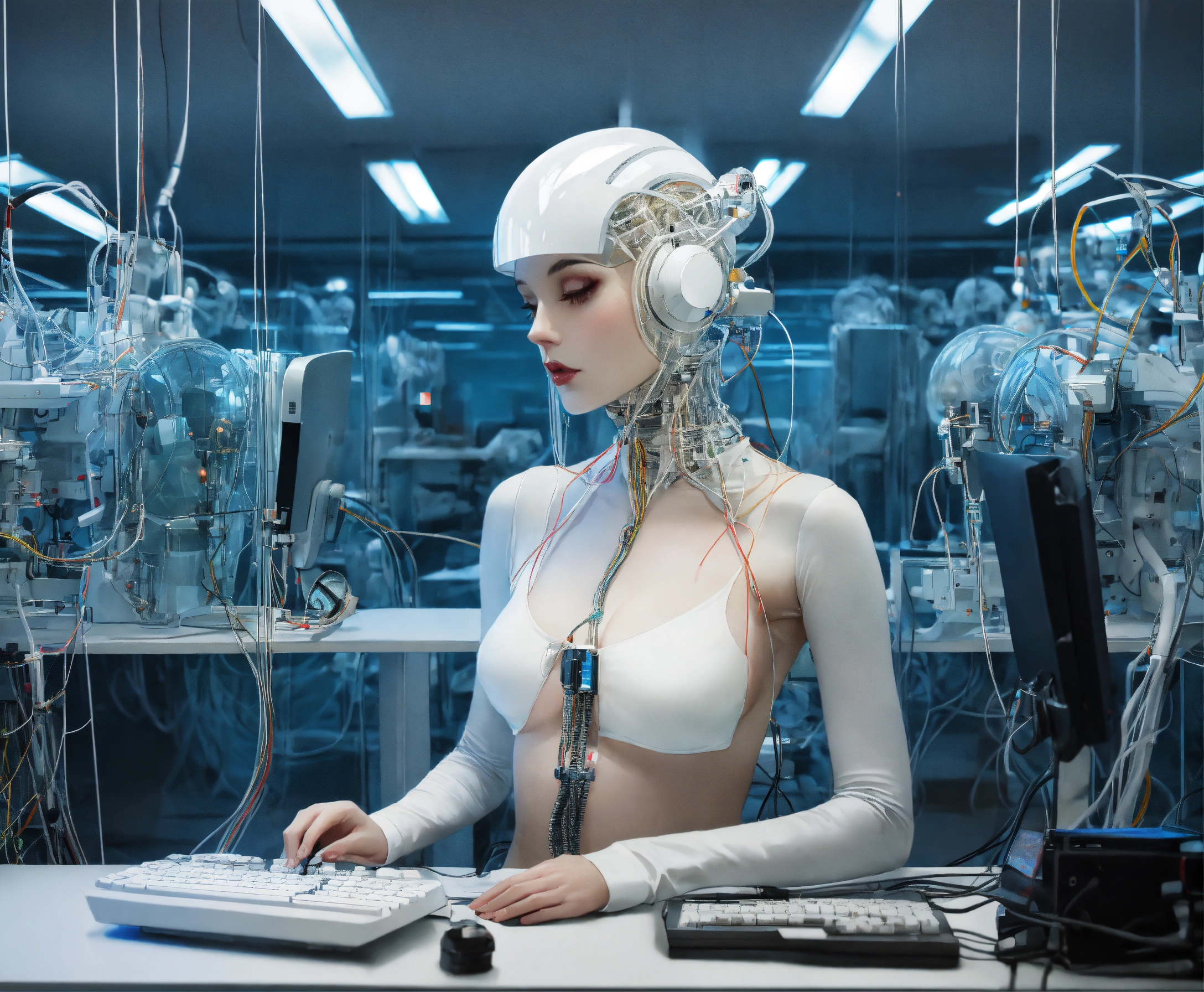 Body portrait photography, in an office full of cables and wires and led, driving a carbon motor head attractive transparent white plexiglass secretary robots typing, 80 degree view, art by sergio lopez, natalie shau, james jean and salvador dali