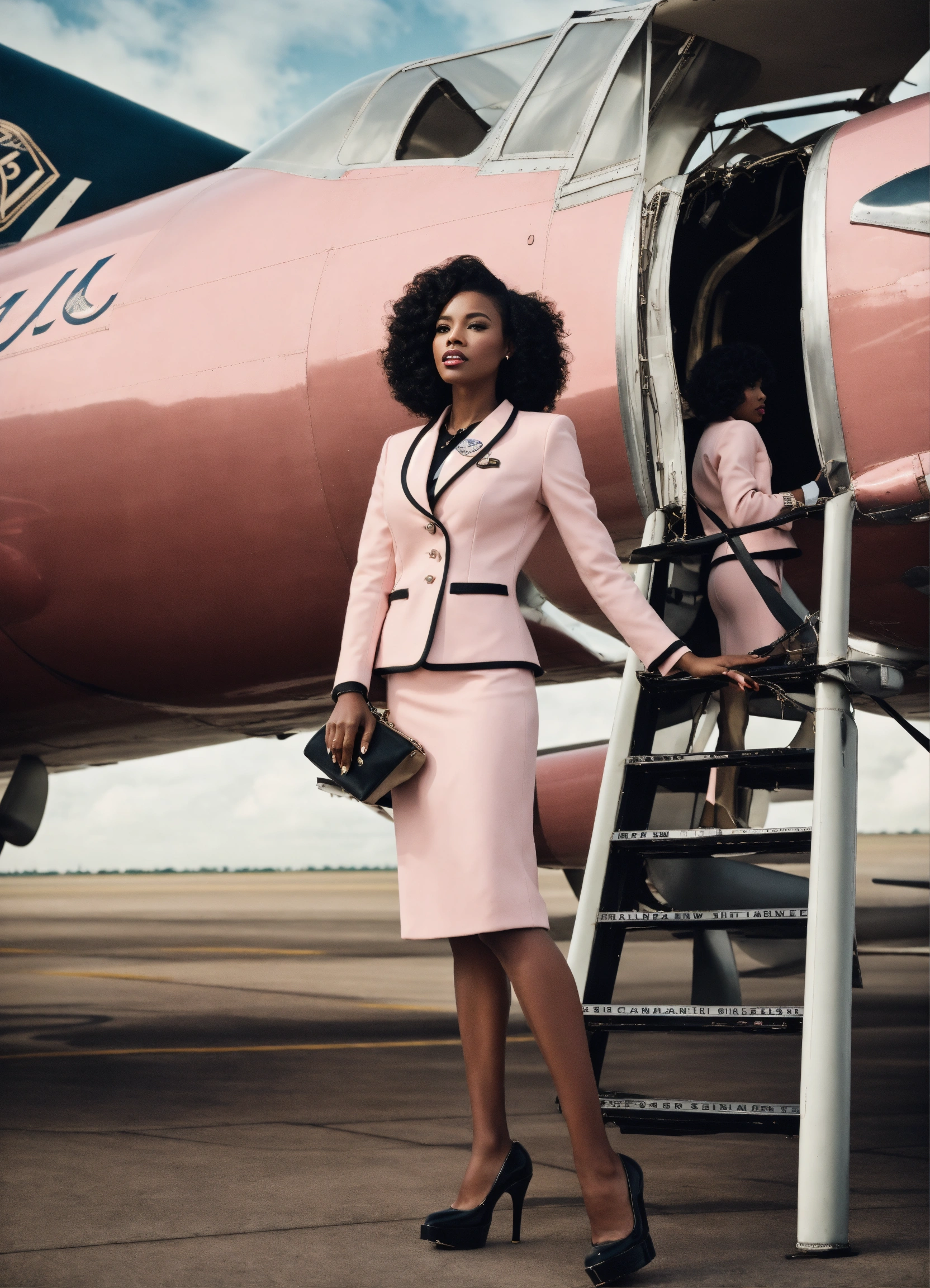 Reate a visually stunning scene featuring an african-american flight attendant in a chic light pink and black ensemble with a structured jacket, platform shoes, and a retro airline logo, iso 400, surrealistic, 8k, full frame, landscape, vintage airplane hangar, classic aircraft, "retro skies" in elegant script.