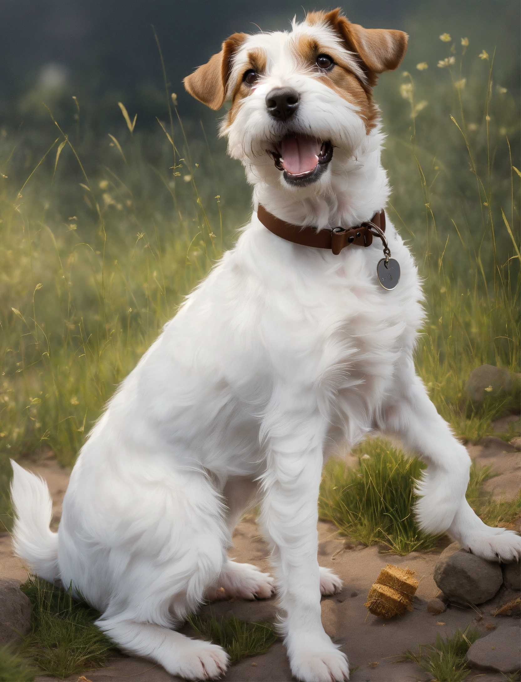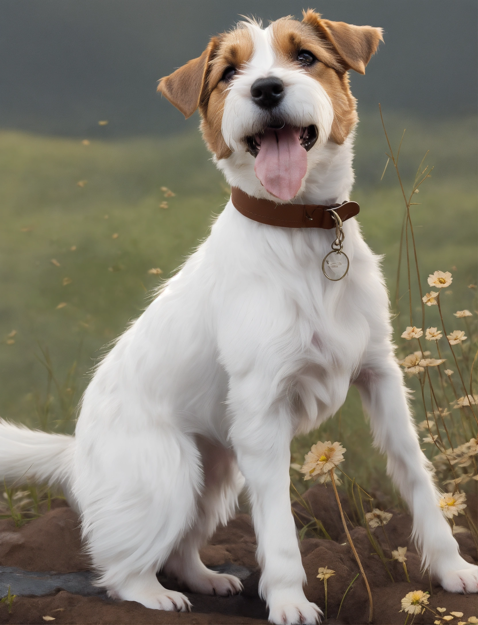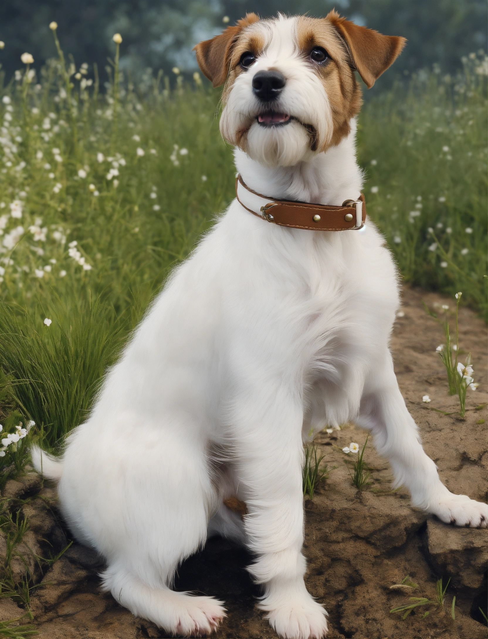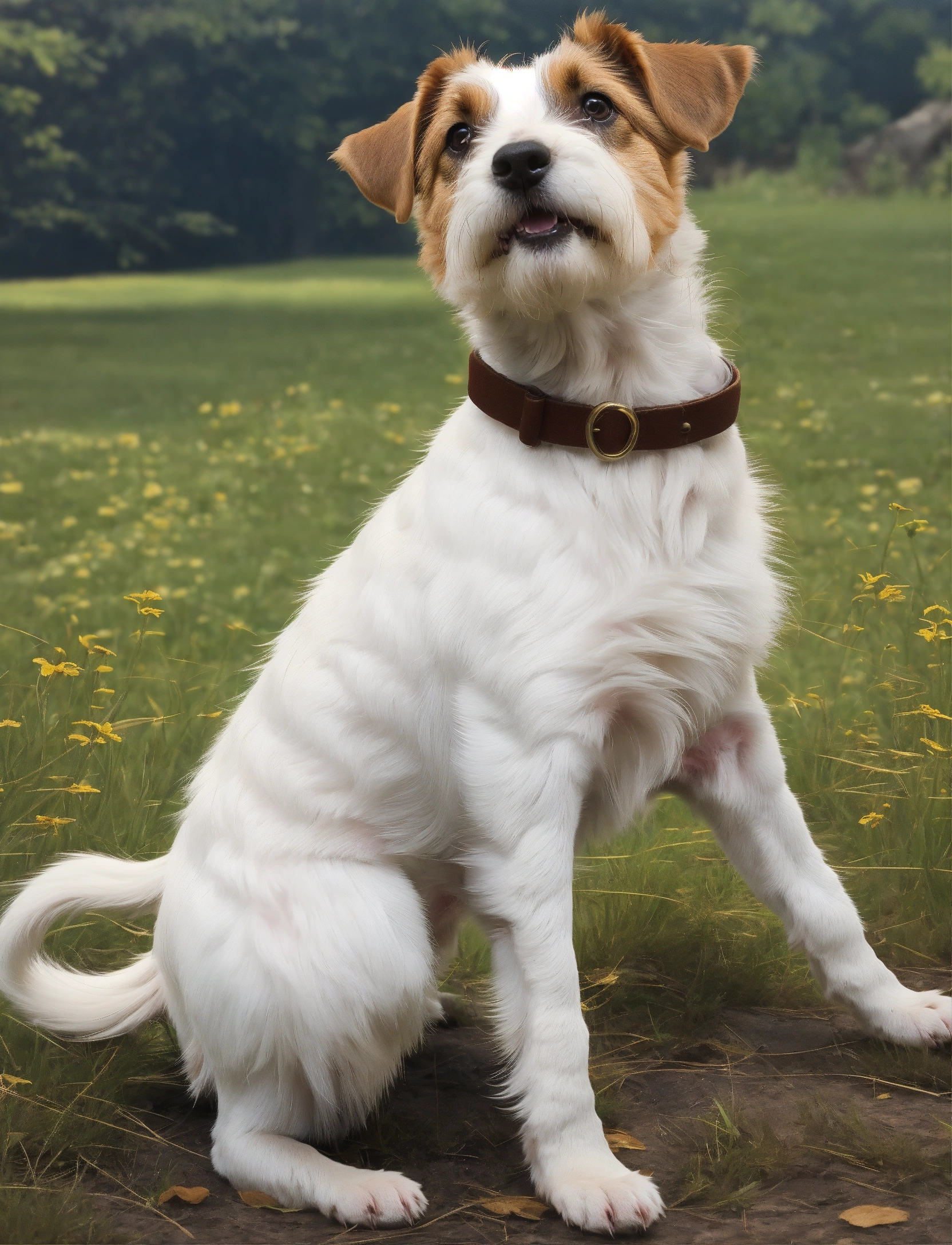 A cute happy surrealistic animation, of a parson russell terrier, brown ears, and white bushy eyebrows. white clear background.