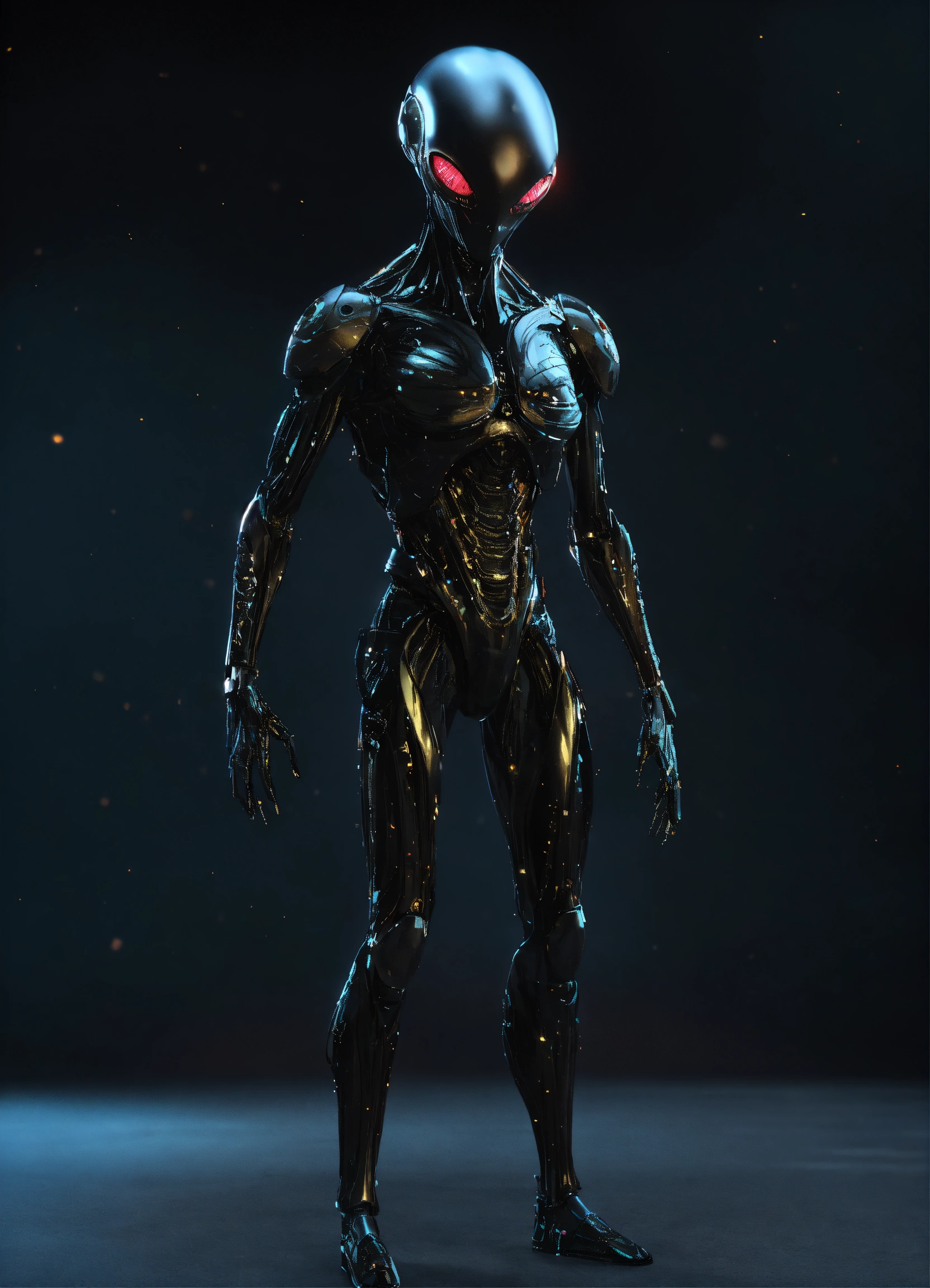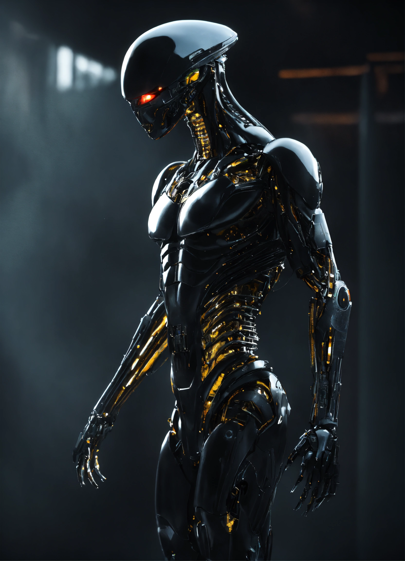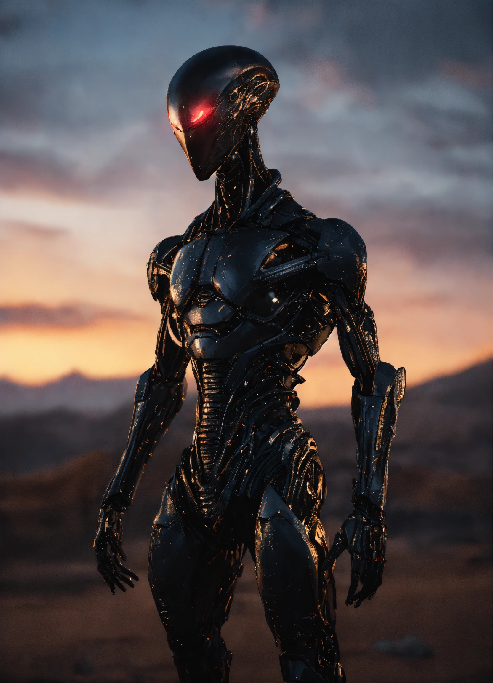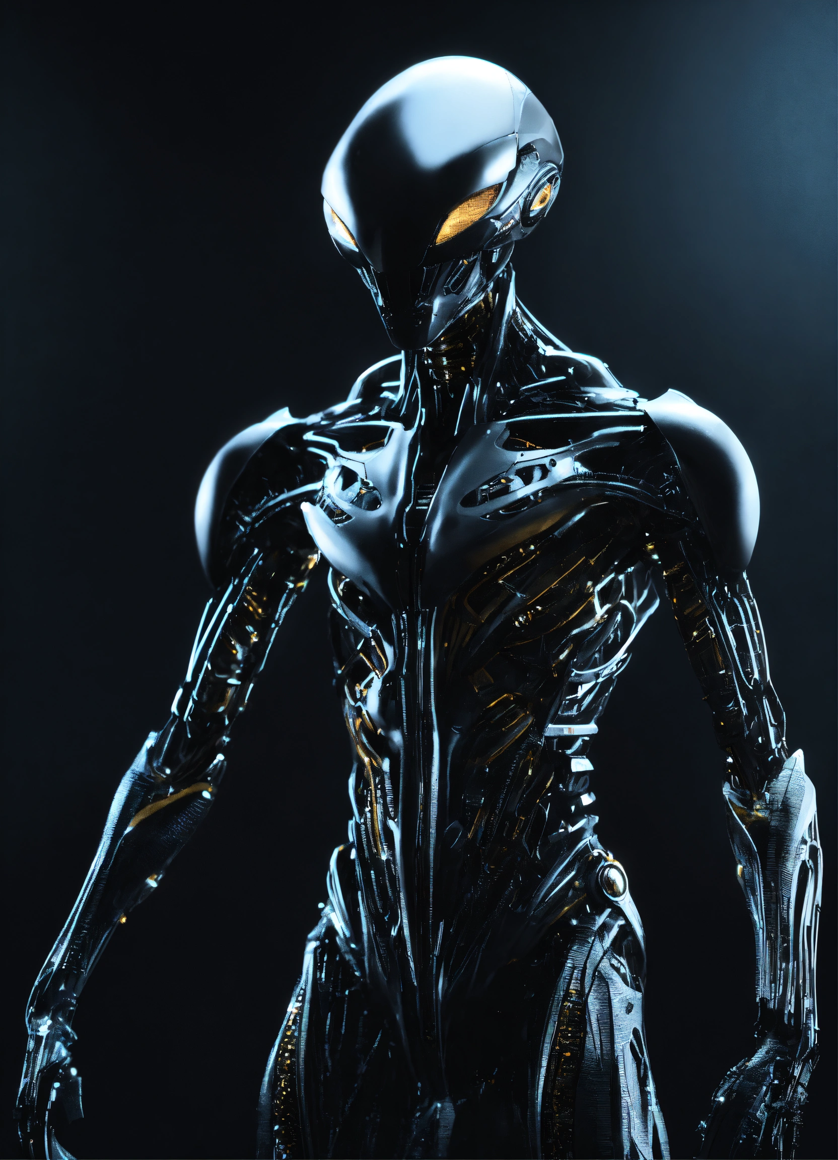 Image of a male alien being, non-threatening, full body, standing, solid black purely mechanical body, 4k render, hyperrealistic
