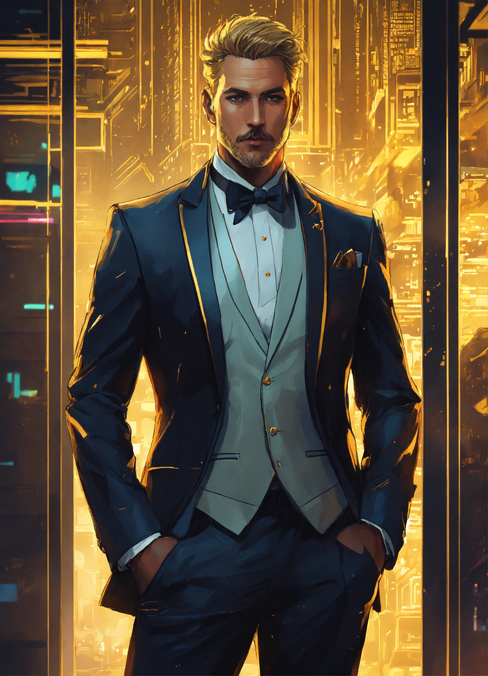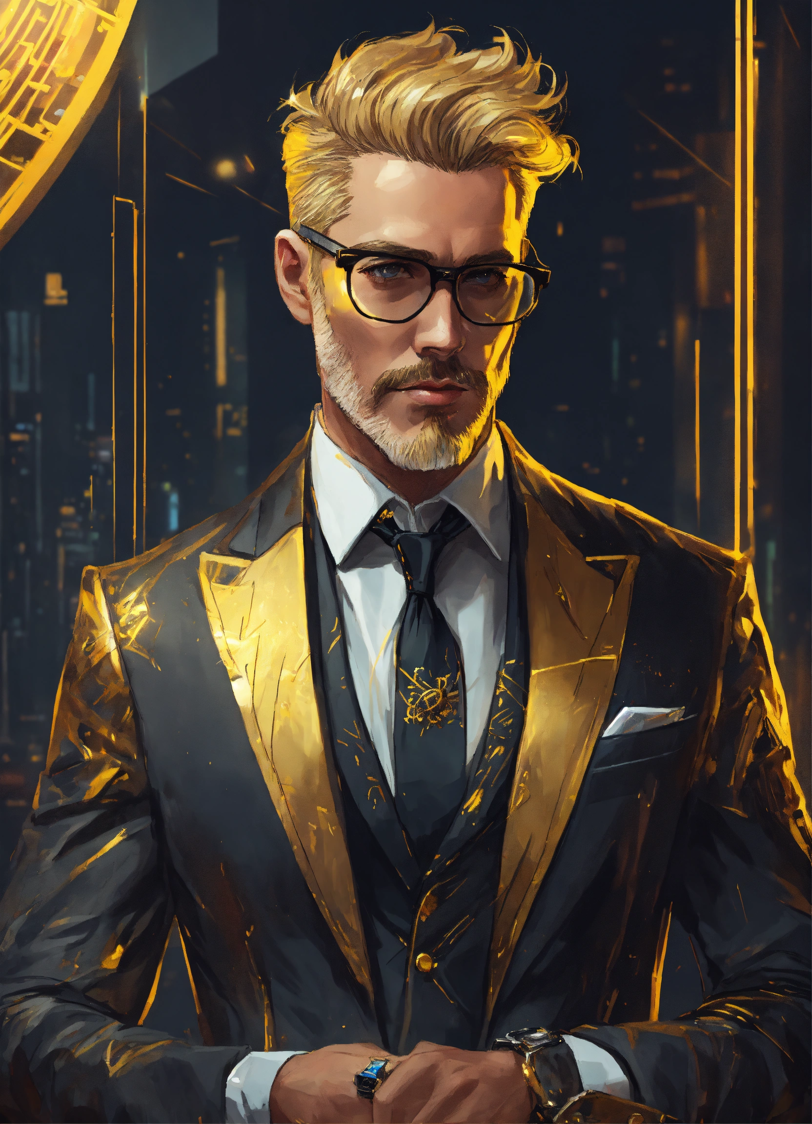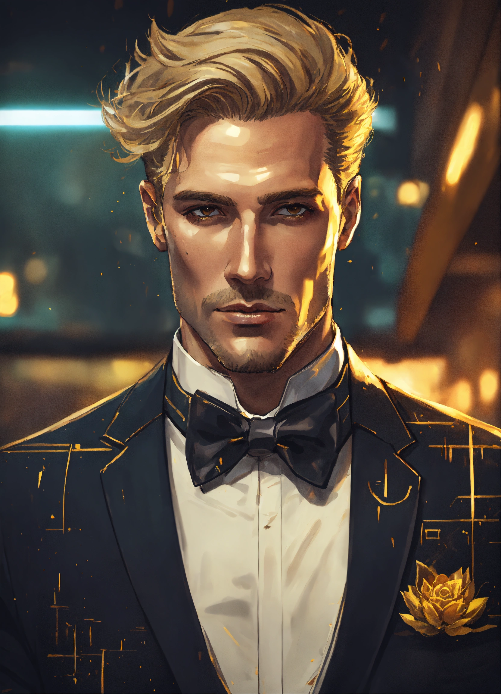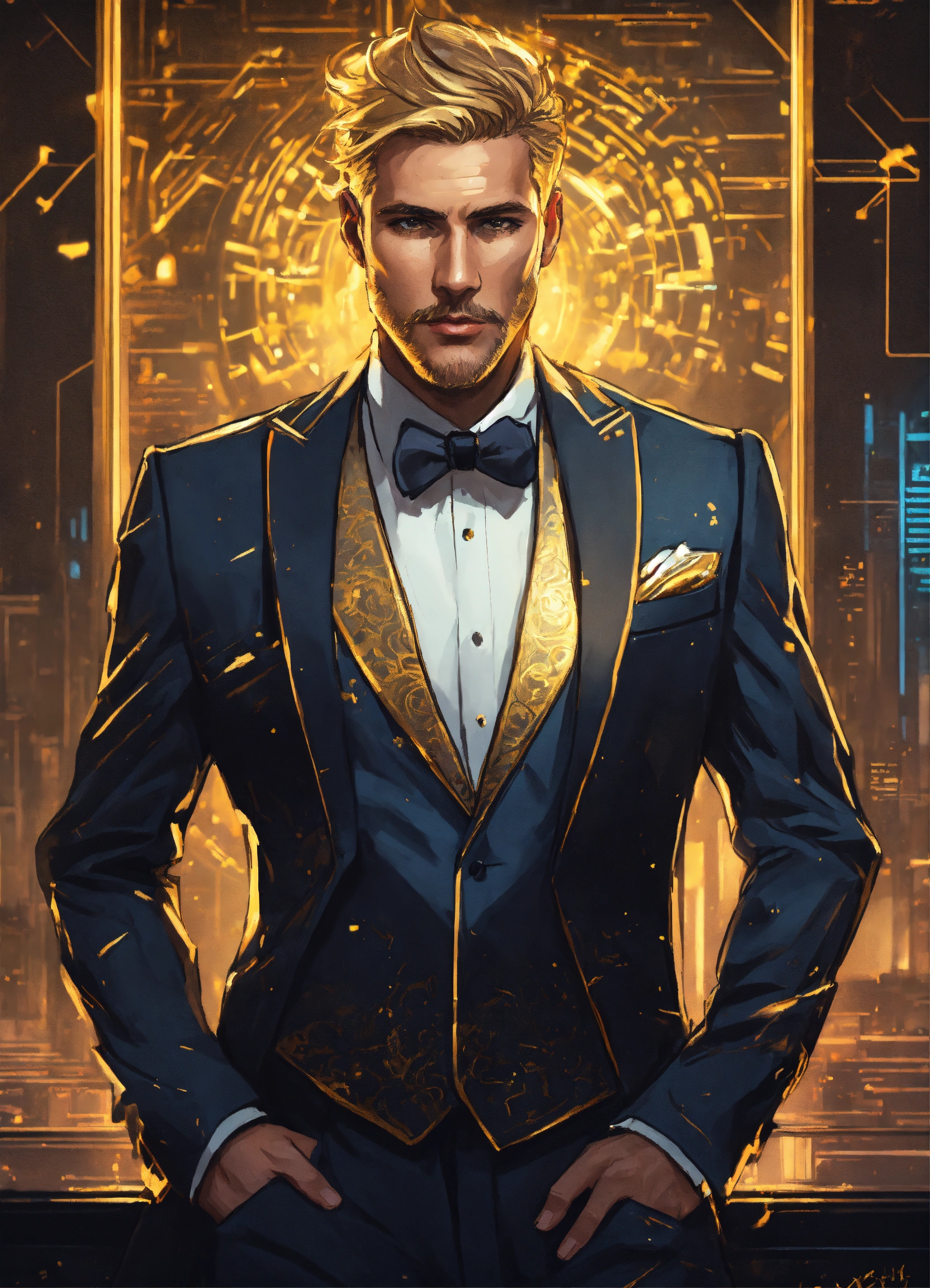 Stylish middle-aged dirty-blonde corporate executive with a fancy tuxedo with subtle gold accents, cyberpunk drawing art-style