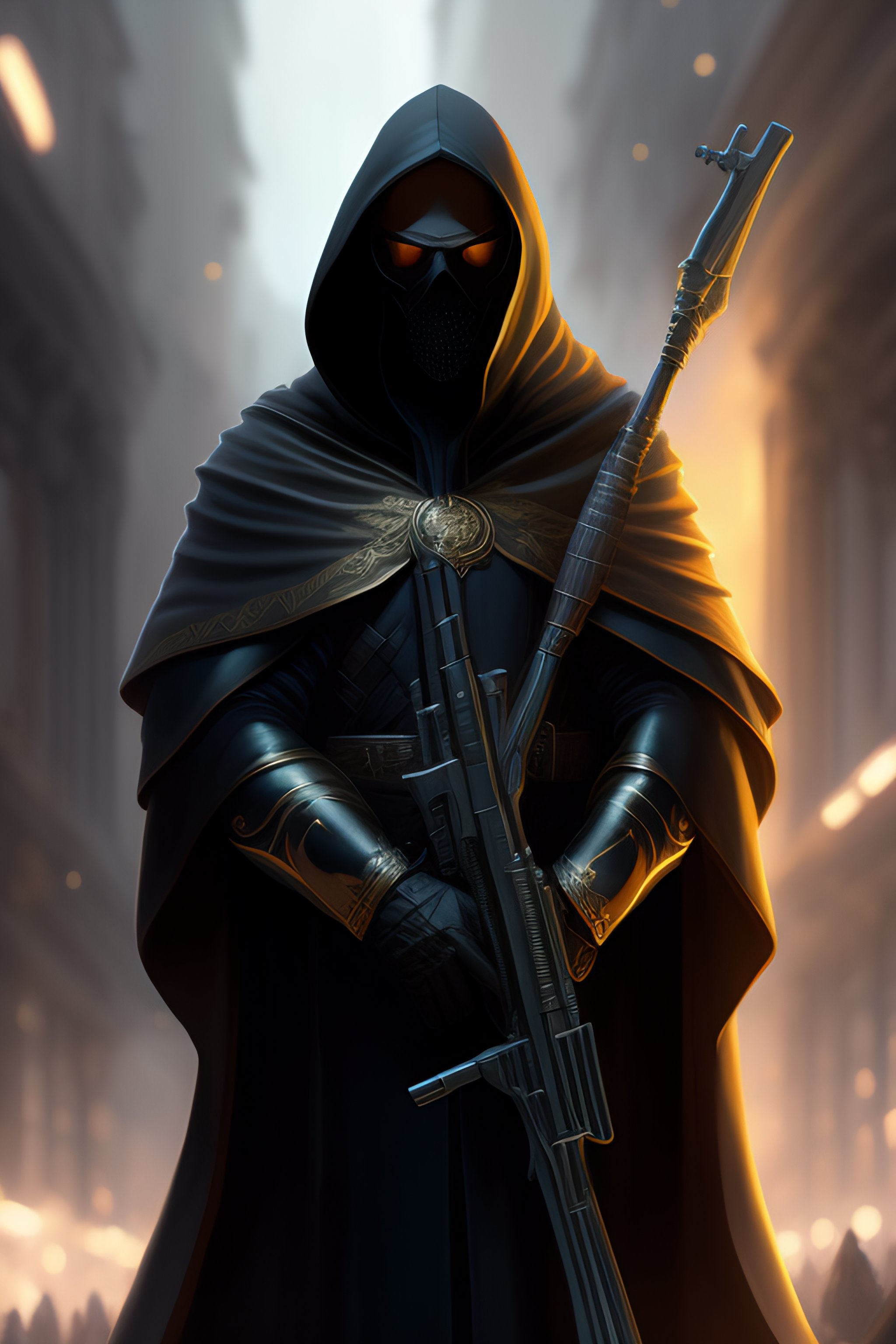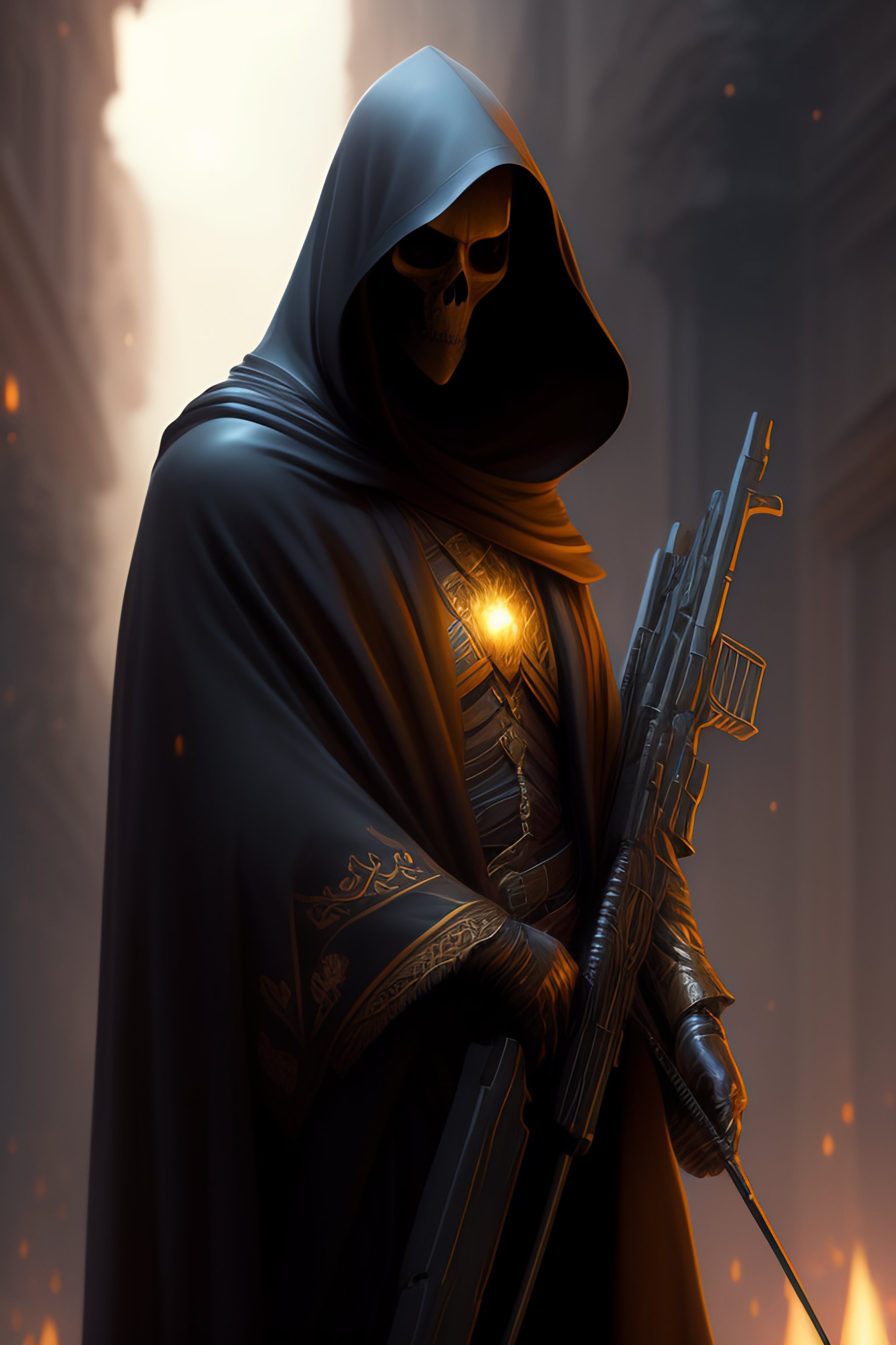 Grim reaper in a hood holding sniper rifles, portrait, highly detailed, concept art, smooth, sharp focus, illustration, cinematic lighting, art by artgerm and greg rutkowski and alphonse mucha