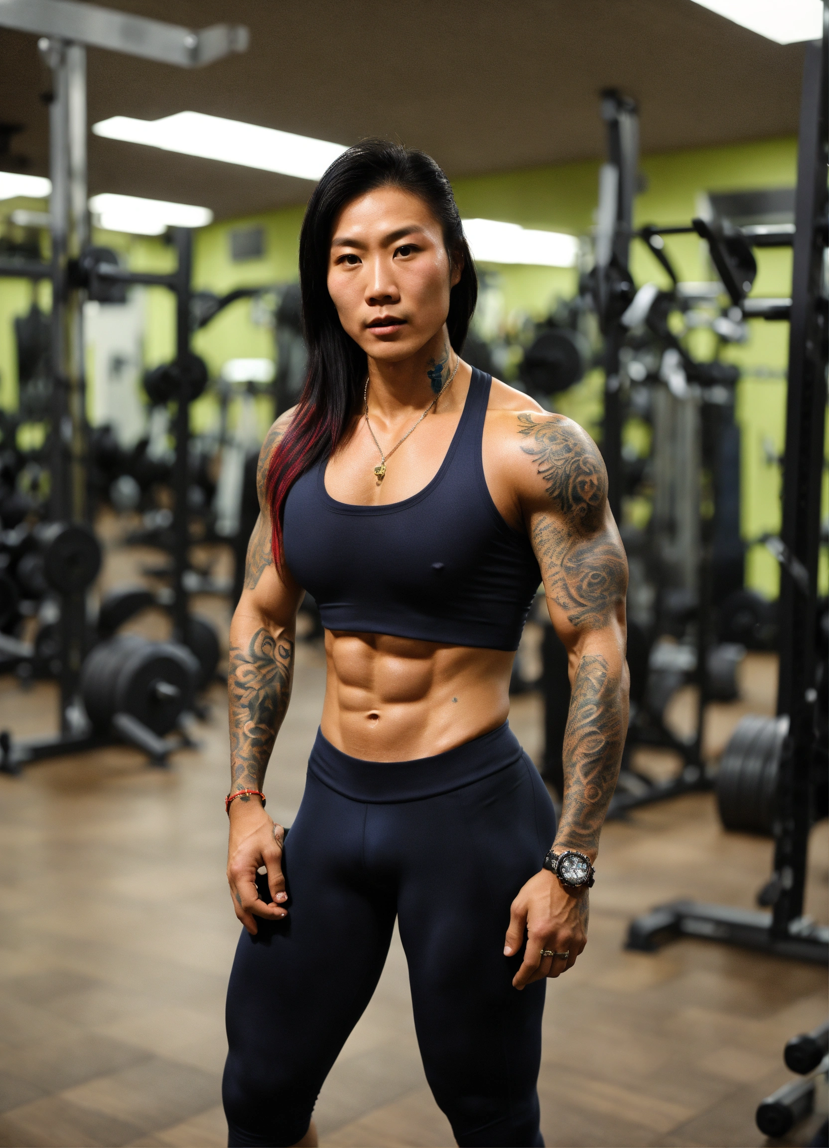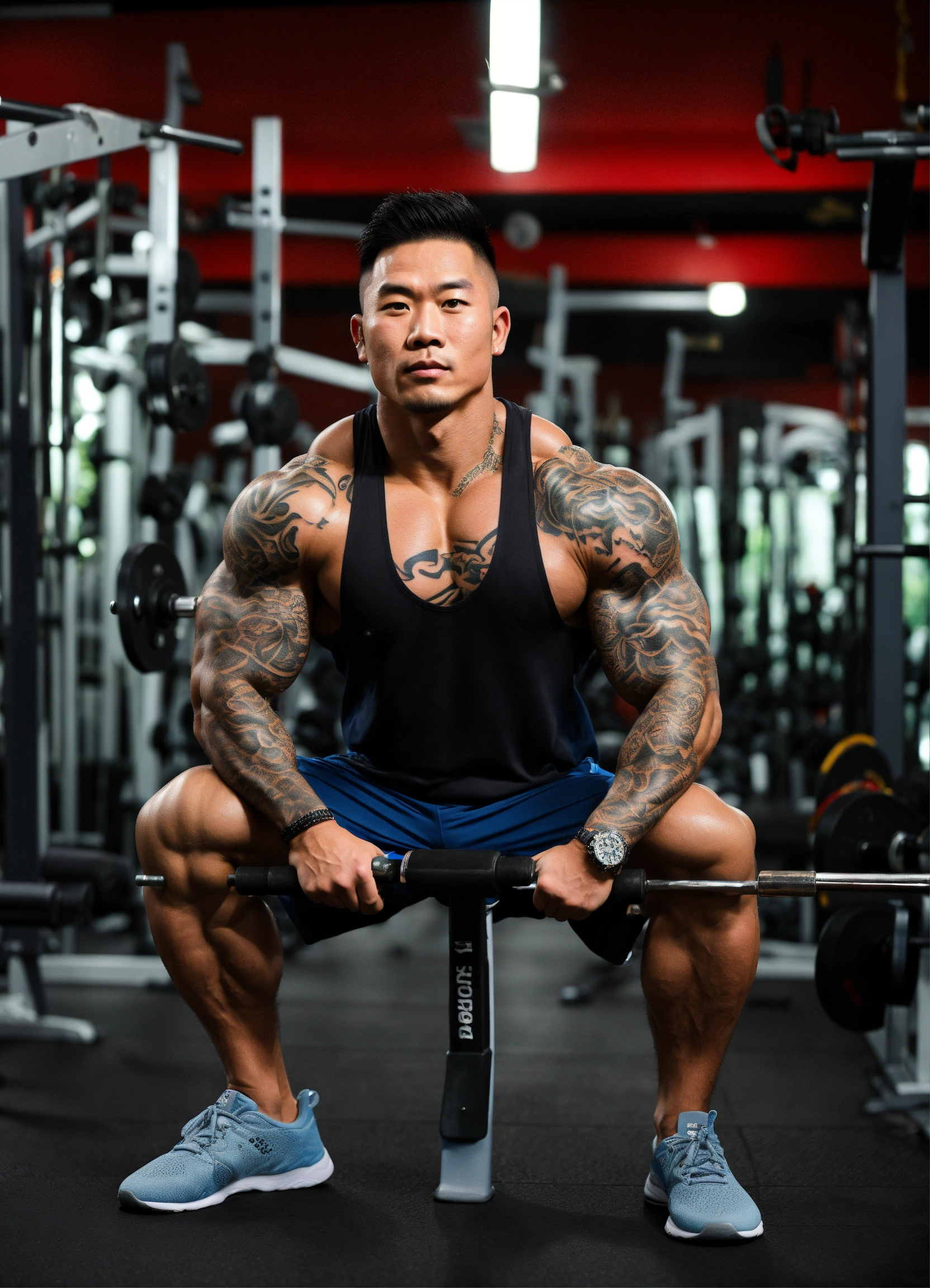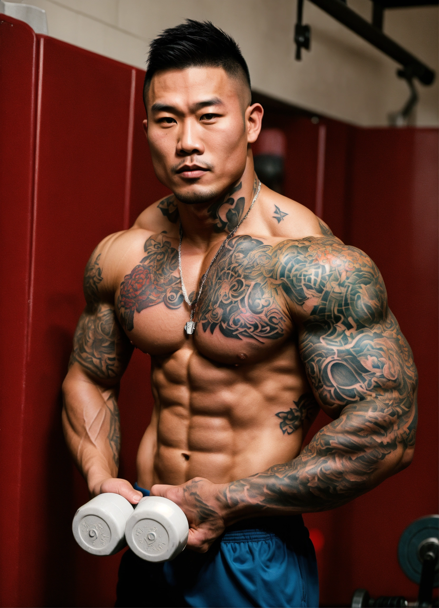 I am a tattooed on one arm asian men athlete bodybuilder called justine vicky aged 33 in a weight room with a surprised look